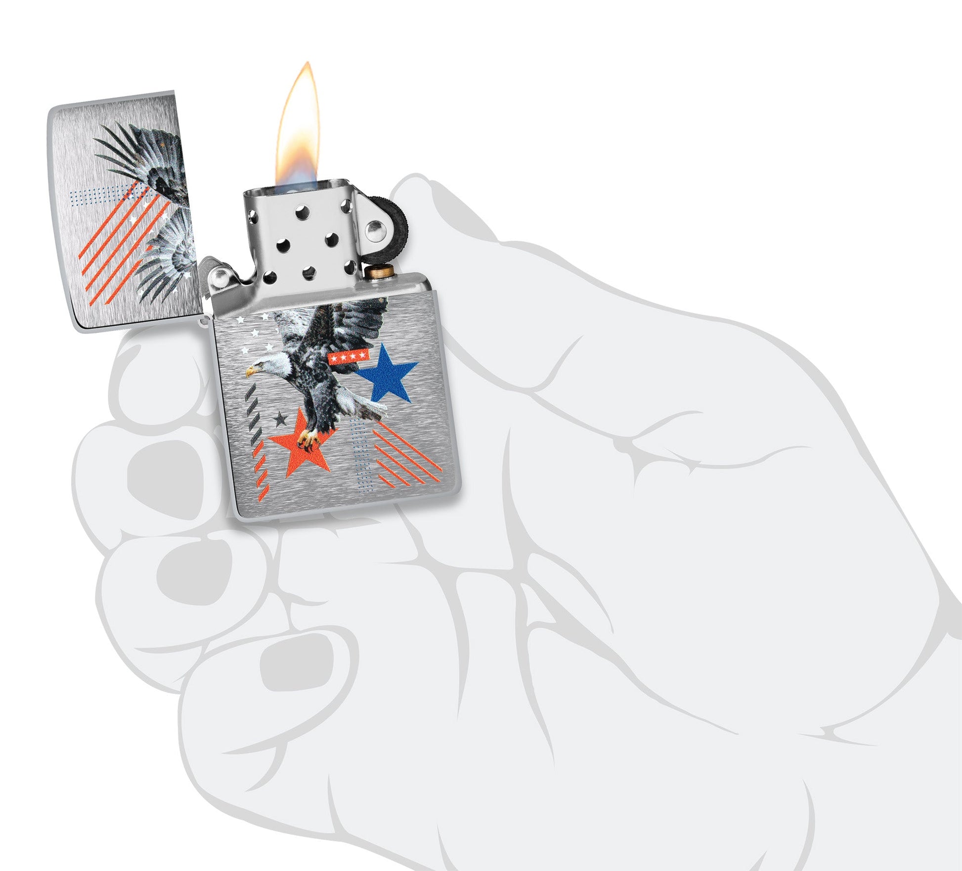 Op de achtergrond, met patriottische sterren en strepen, zweeft een koninklijke adelaar over het oppervlak van deze klassieke aansteker van geborsteld chroom in een ontwerp met opvallende kleuren.
