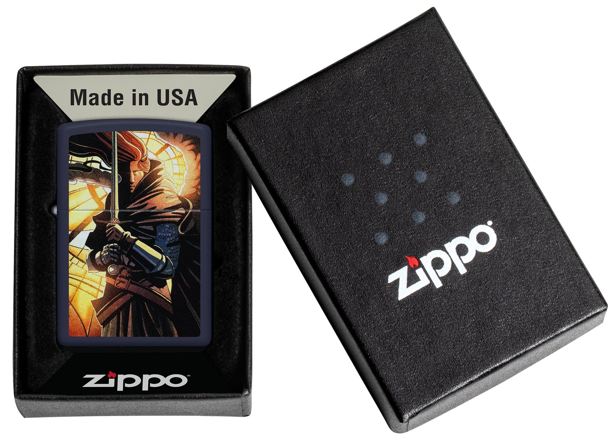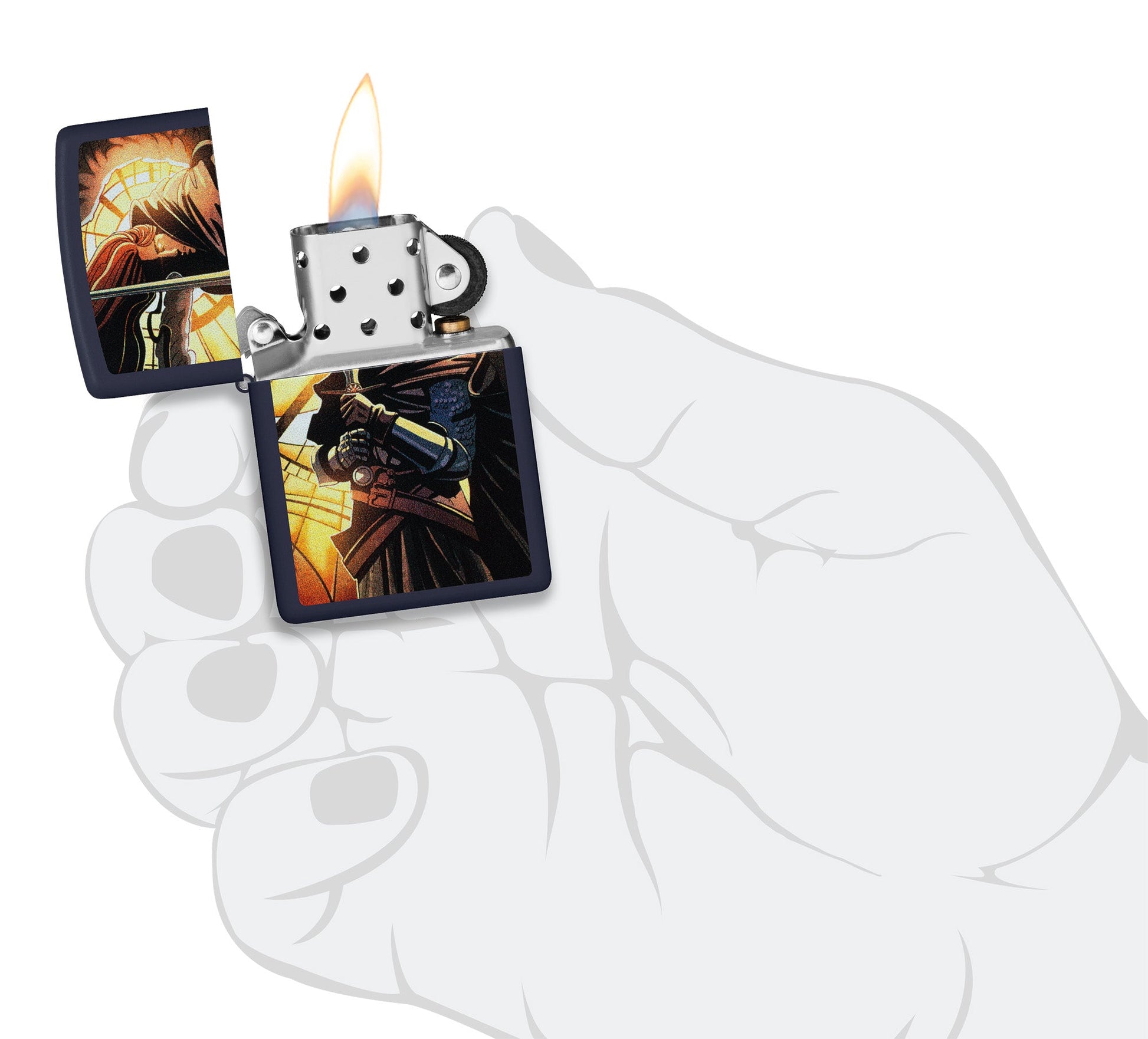 Modern en middeleeuws komen samen in deze klassieke aansteker in de kleur mat-marine. Met een lichtgloed op de achtergrond staat een gepantserde krijger klaar voor de strijd in het abstracte kleurenontwerp.