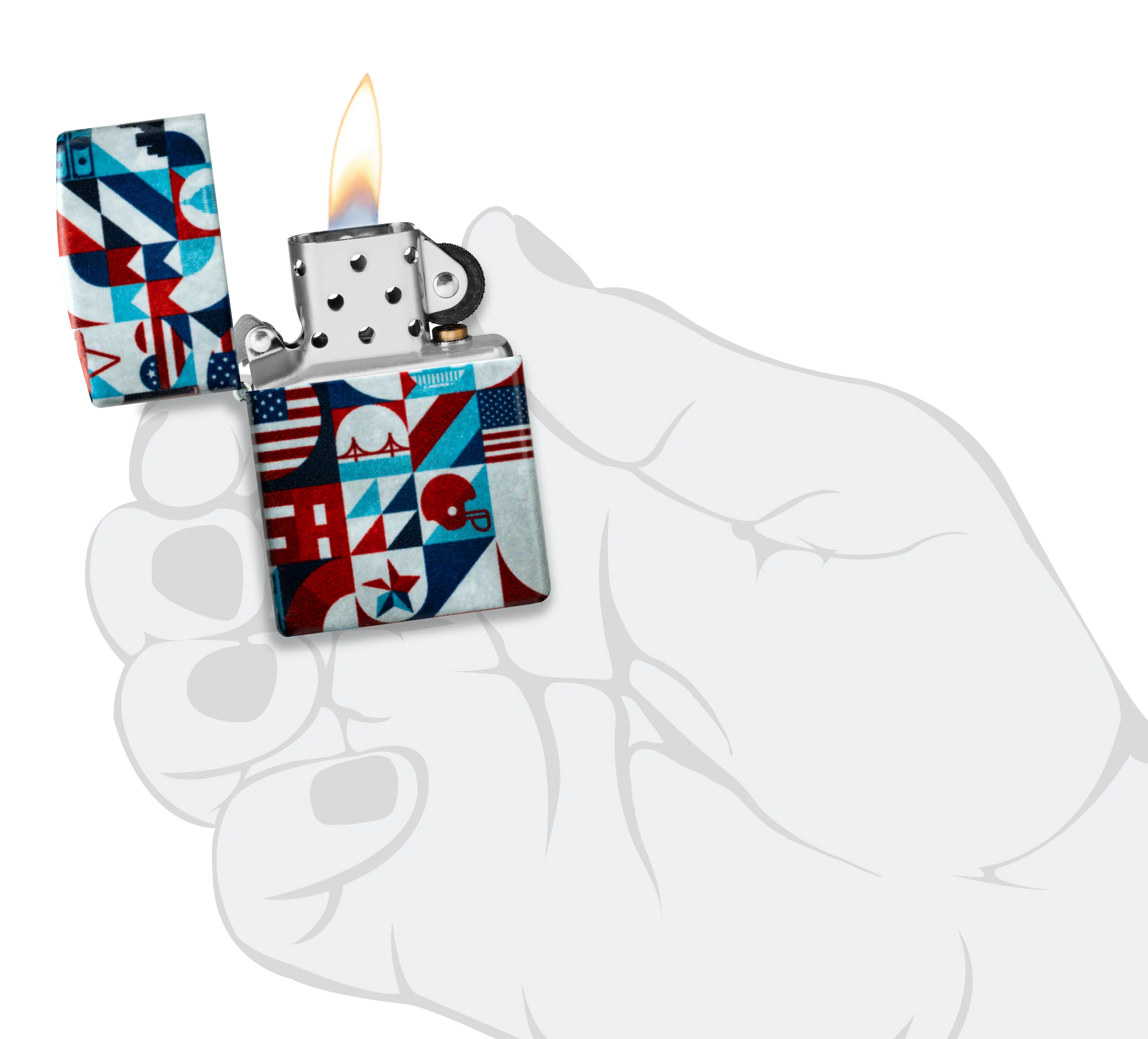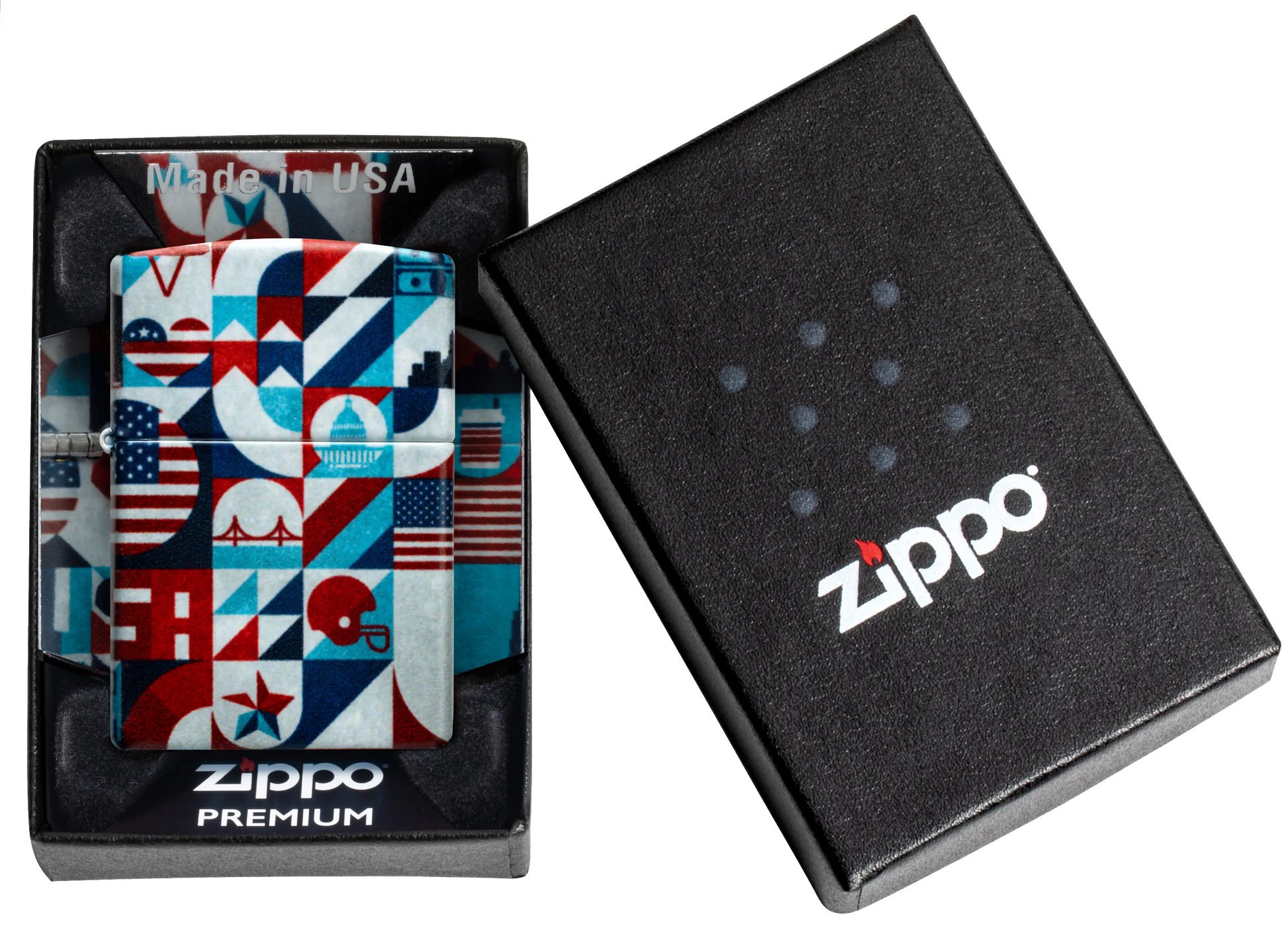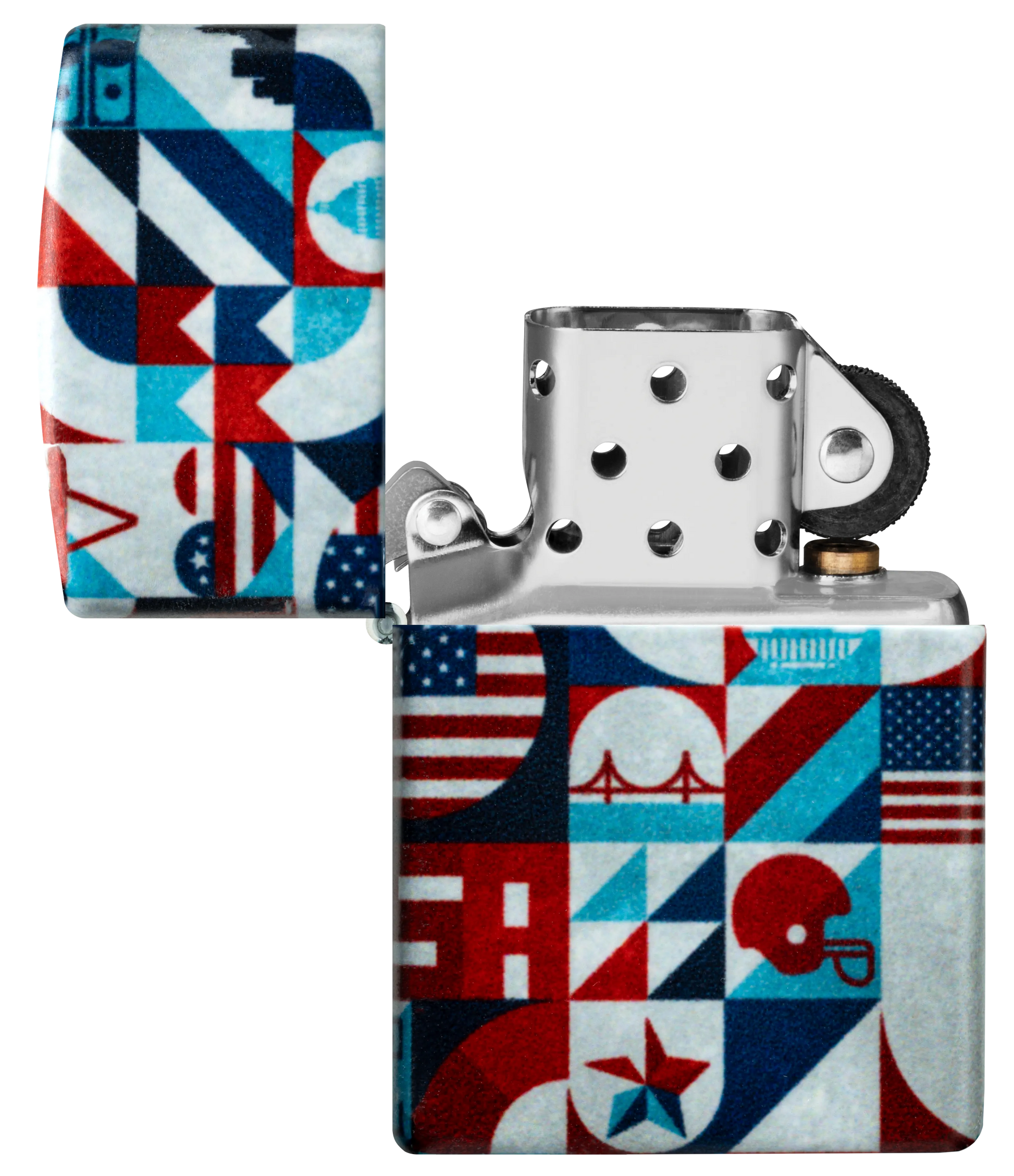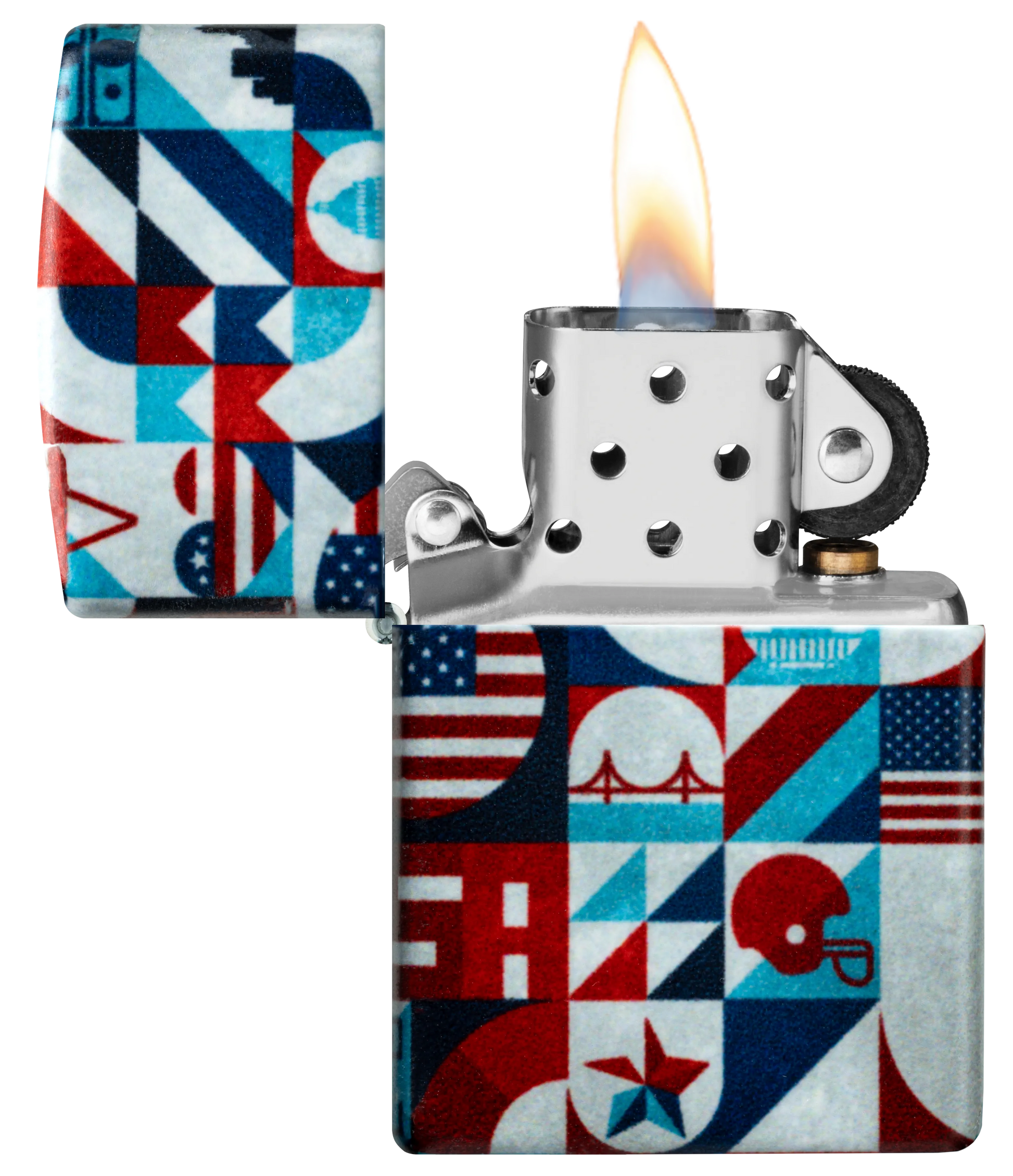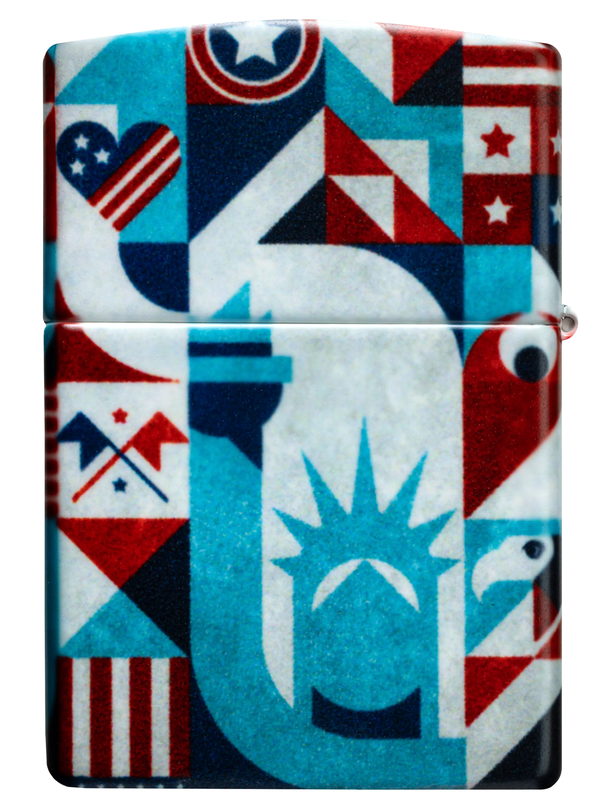 Historische monumenten en symbolen van de VS versieren alle kanten van deze klassieke 540 Color aansteker in een levendig en vaderlandslievend ontwerp.