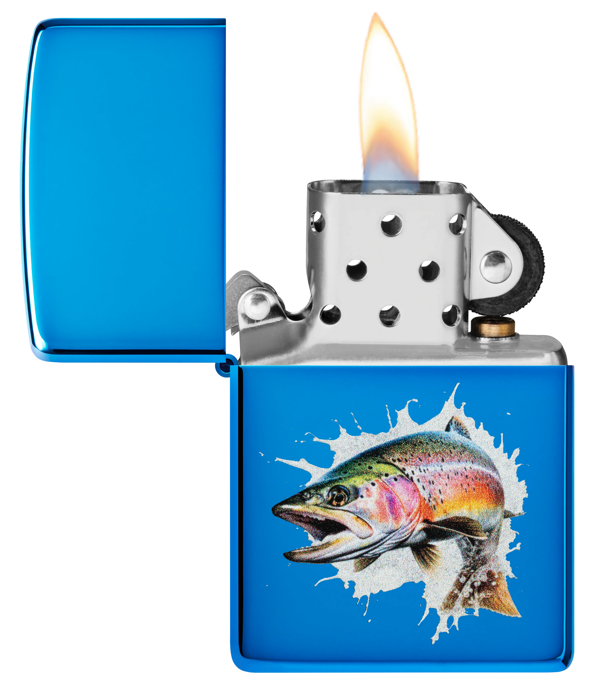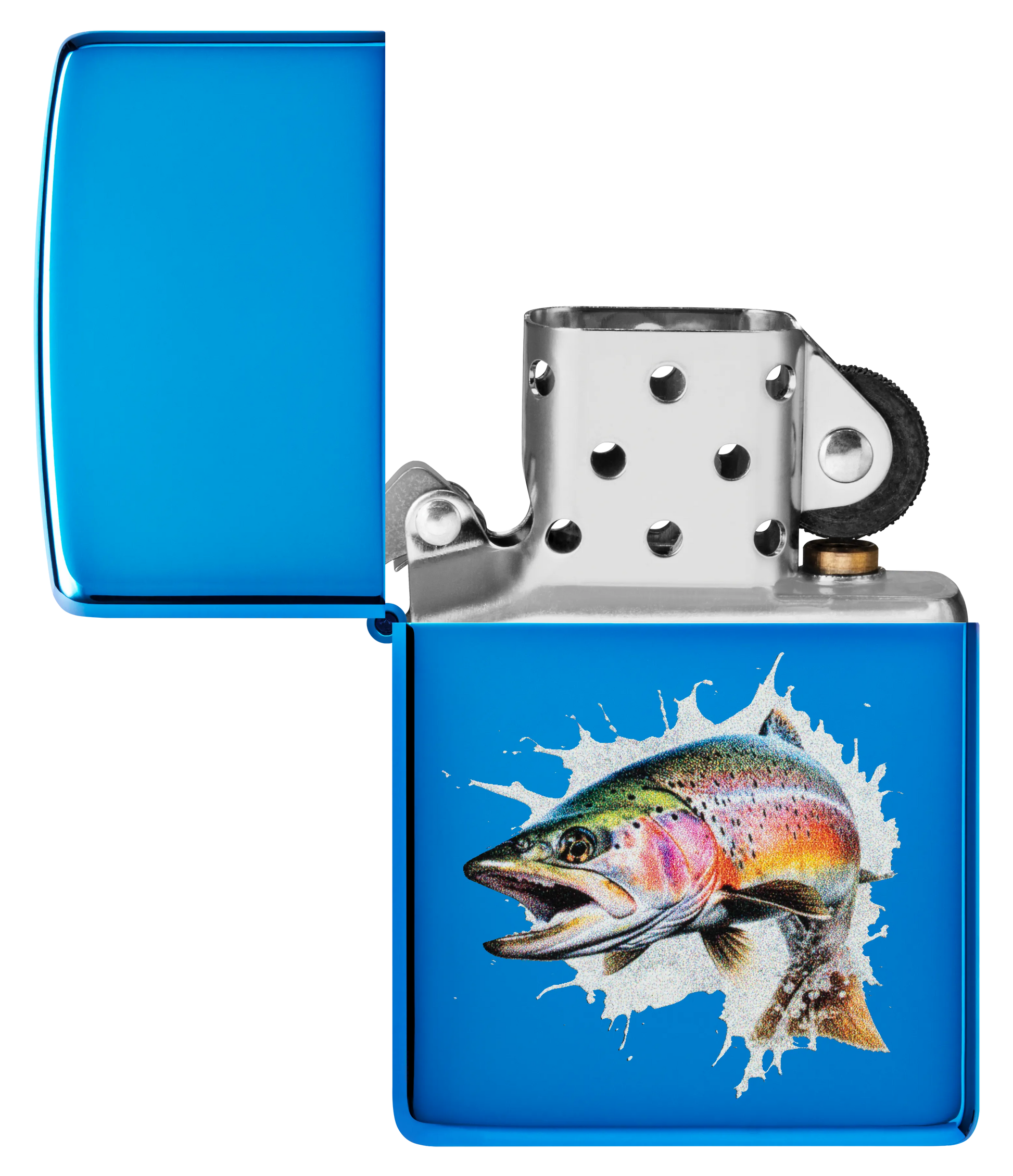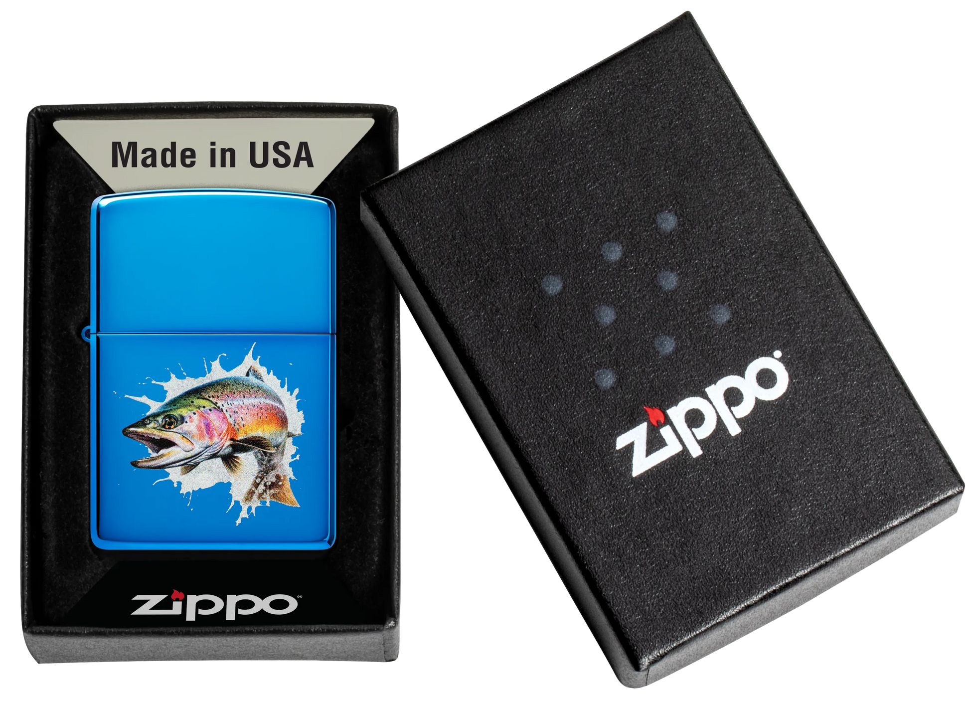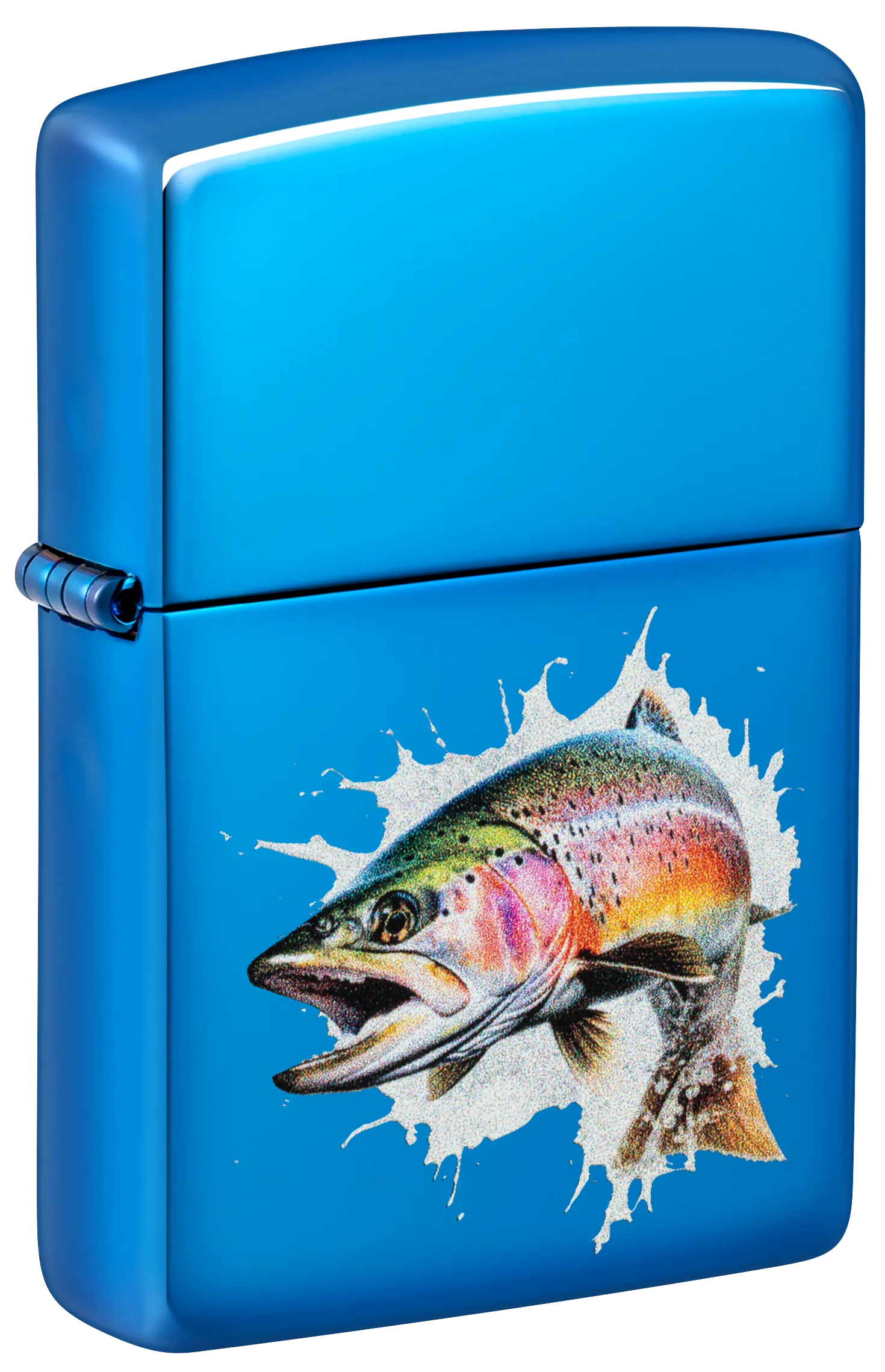 Een schitterende regenboogforel lijkt van het oppervlak van deze klassieke High Polish Blue aansteker te springen, in een levensecht Color Image design.