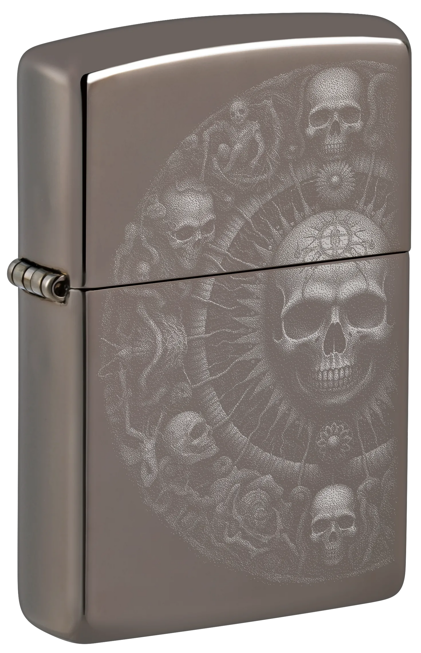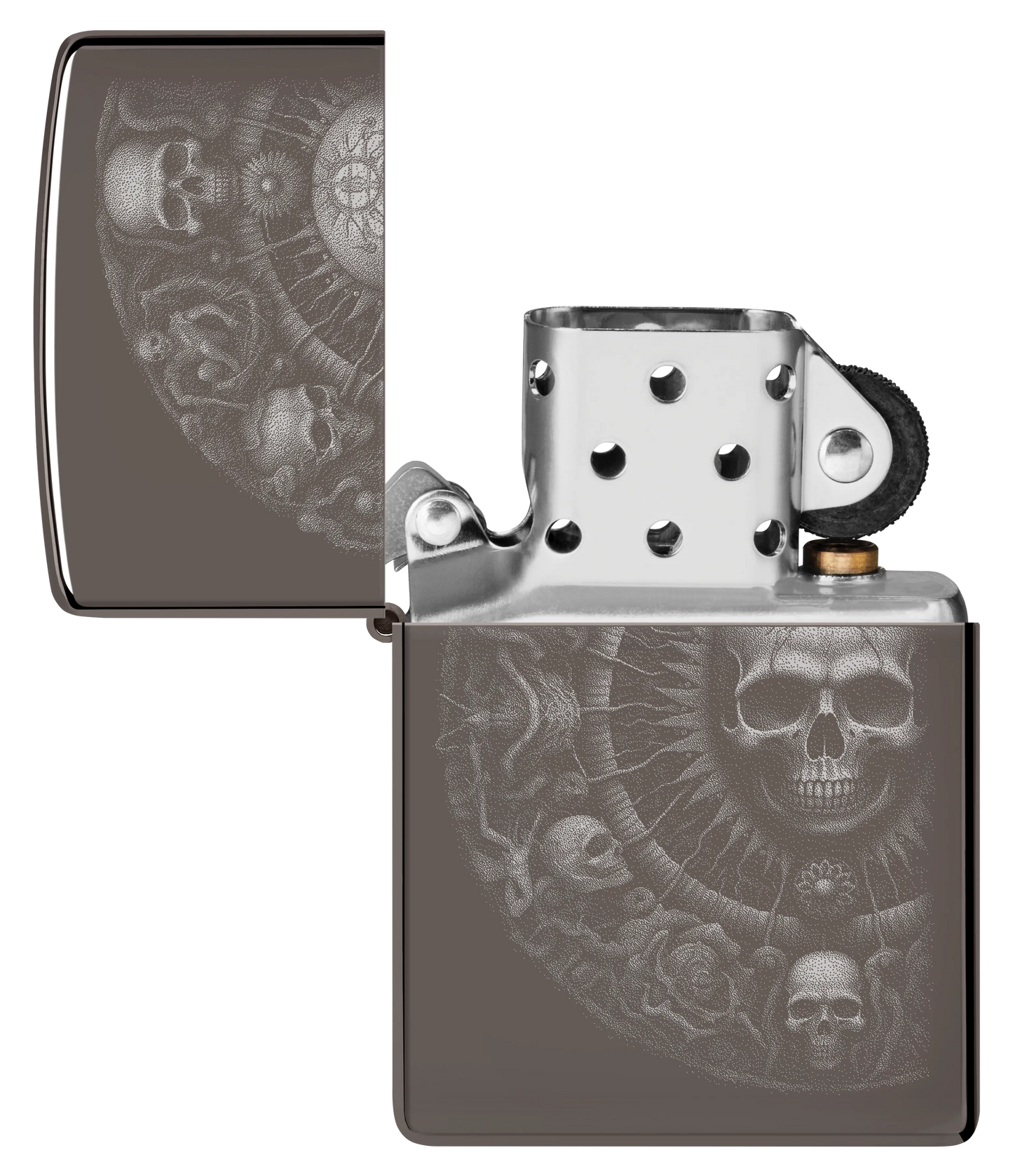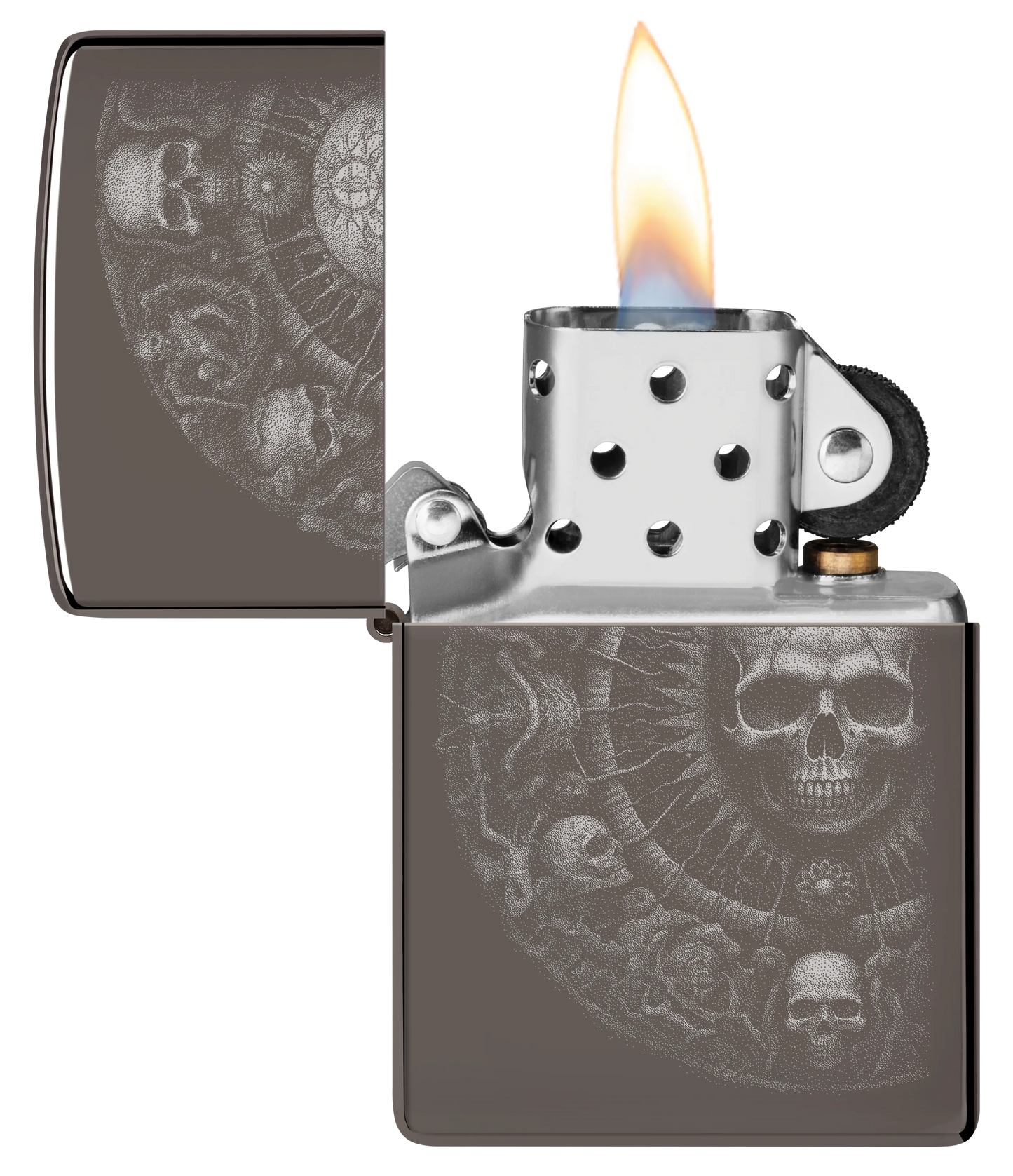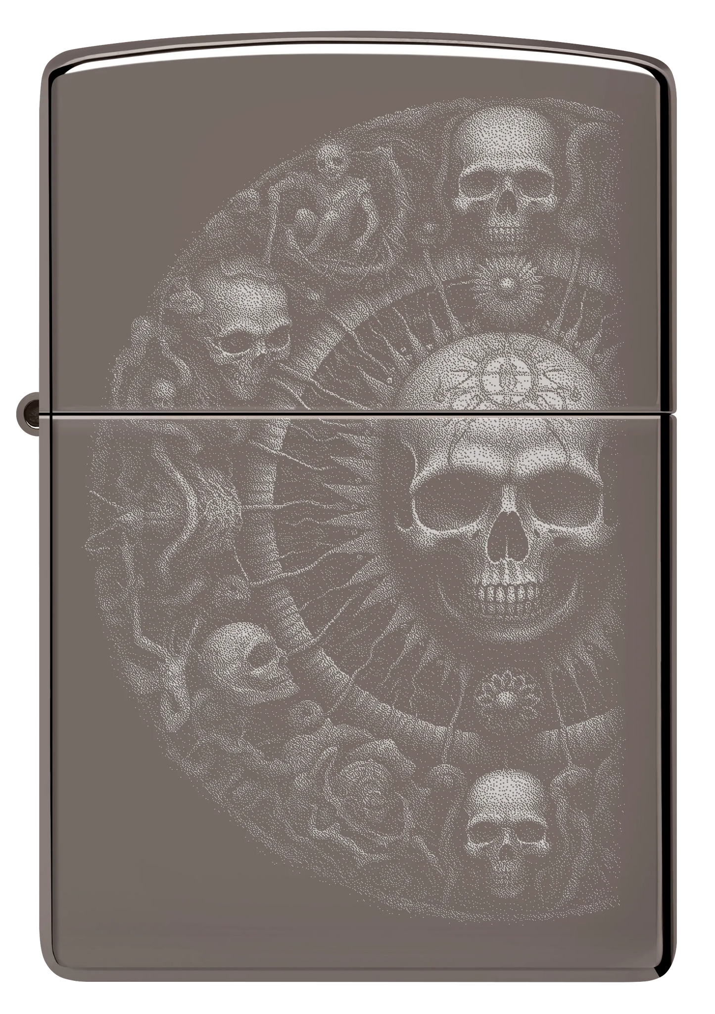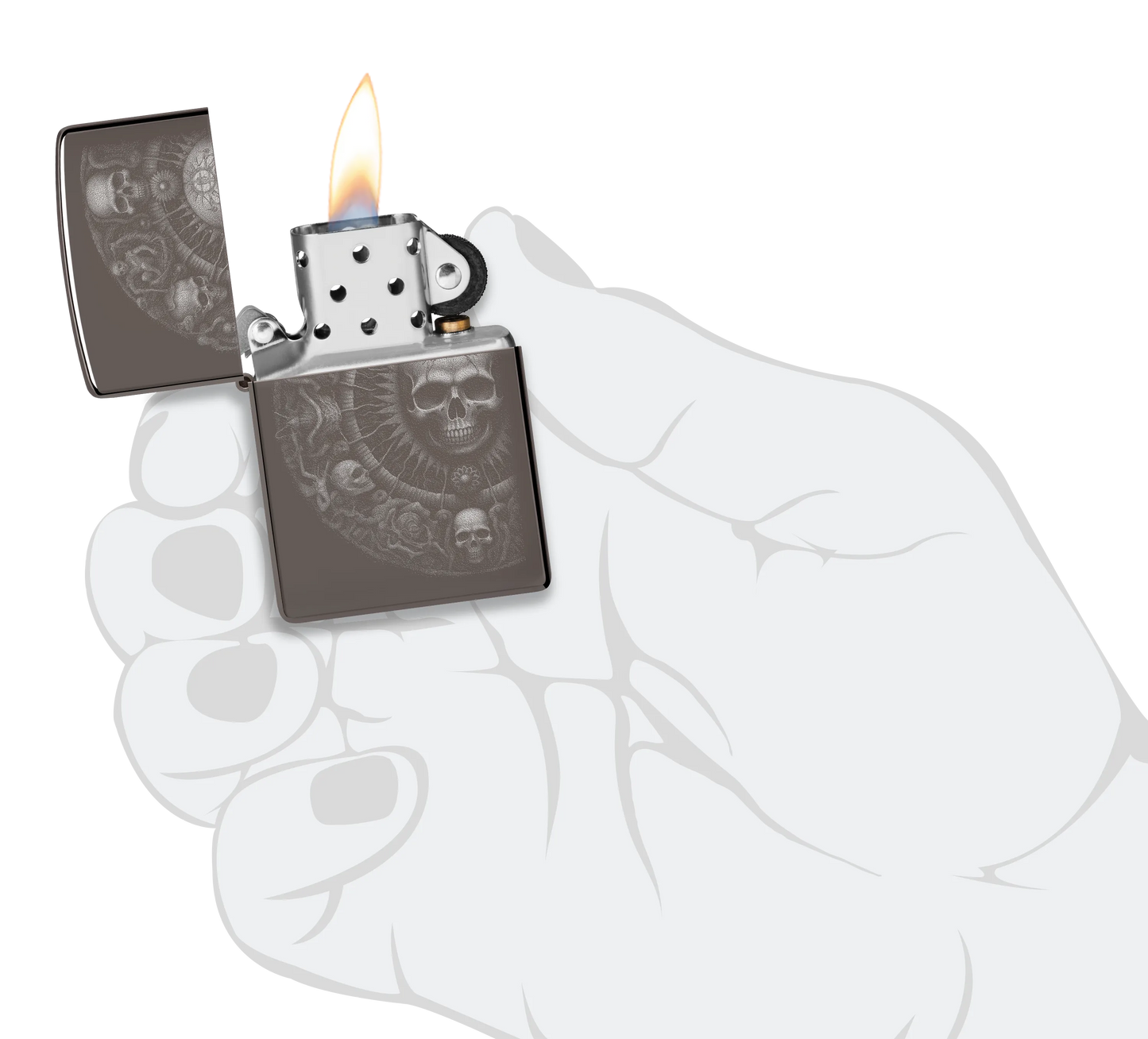 Grijnzende schedels, tentakels en angstwekkende figuren vormen een dreigende mandala op deze klassieke Black Ice aansteker in een mysterieus Photo Image design.