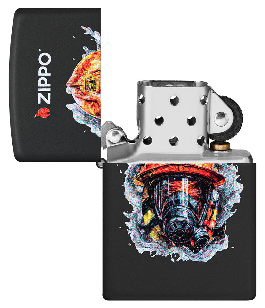 Een brandweerhelm lijkt door het oppervlak van deze klassieke Black Matte aansteker te barsten onder het Zippo logo in een realistisch Color Image design.