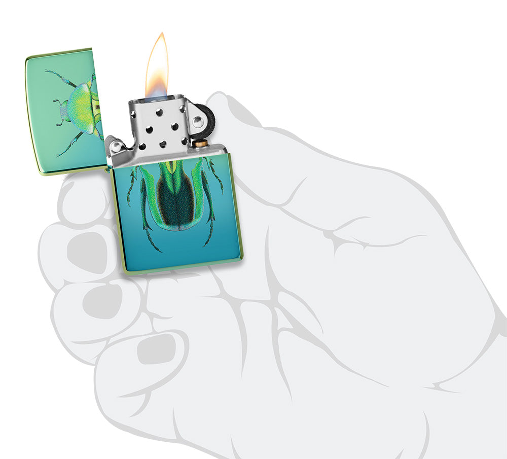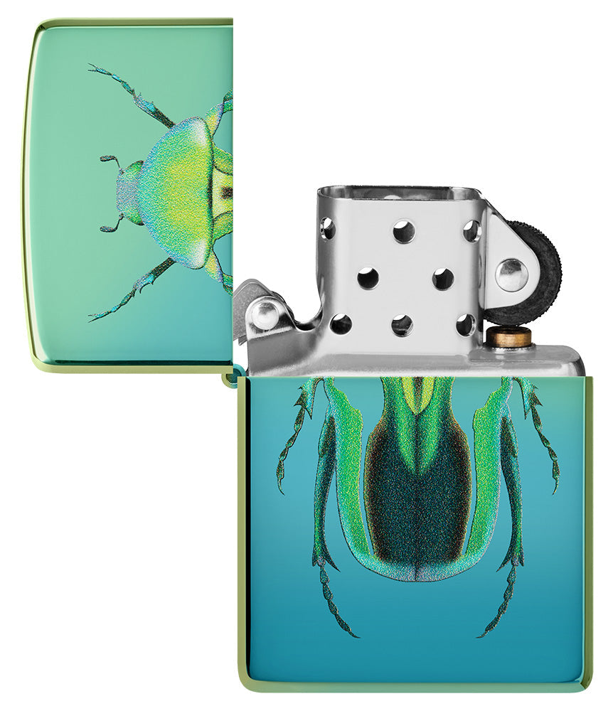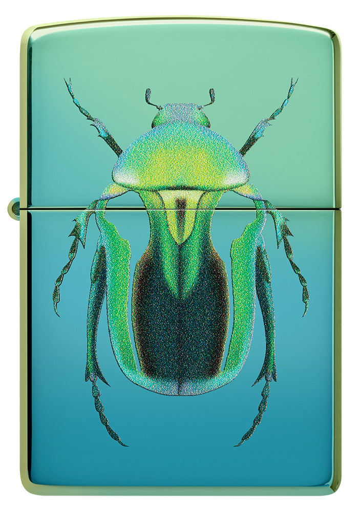 Een glanzende kever kruipt over het oppervlak van deze fascinerende High Polish Teal aansteker in een fraai Color Image ontwerp.