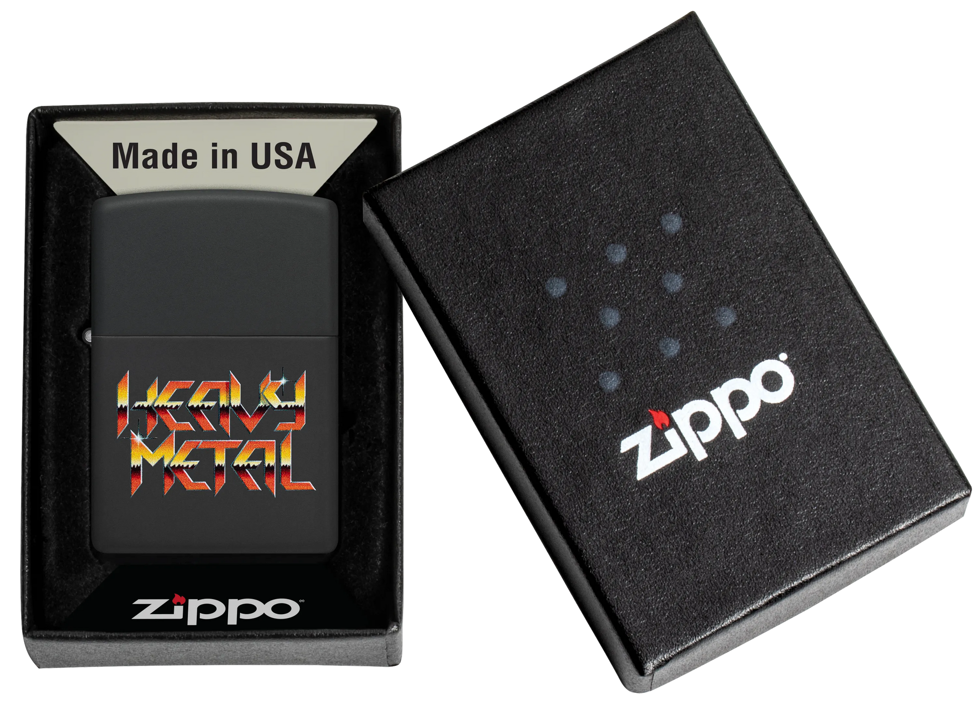 Deze klassieke Black Matte aansteker is een ode aan jouw favoriete bands. De tekst 'Heavy Metal’ prijkt in dappere, vurige letters op een levendig Color Image design.
