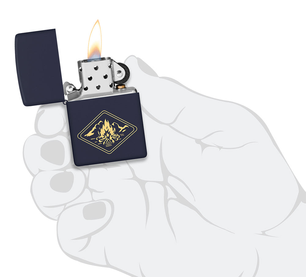 Verzamel je rond je volgende kampvuur met deze klassieke Navy Matte aansteker. Het eenvoudige Laser Engrave design toont een kalmerend kampvuur in luxueuze metaaltinten en is klaar voor elk outdooravontuur.