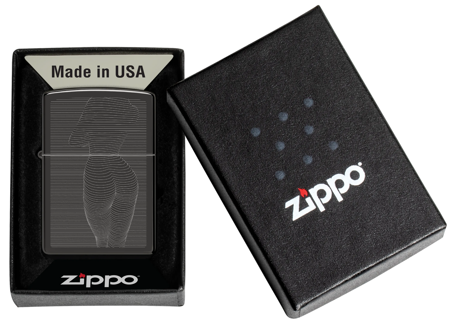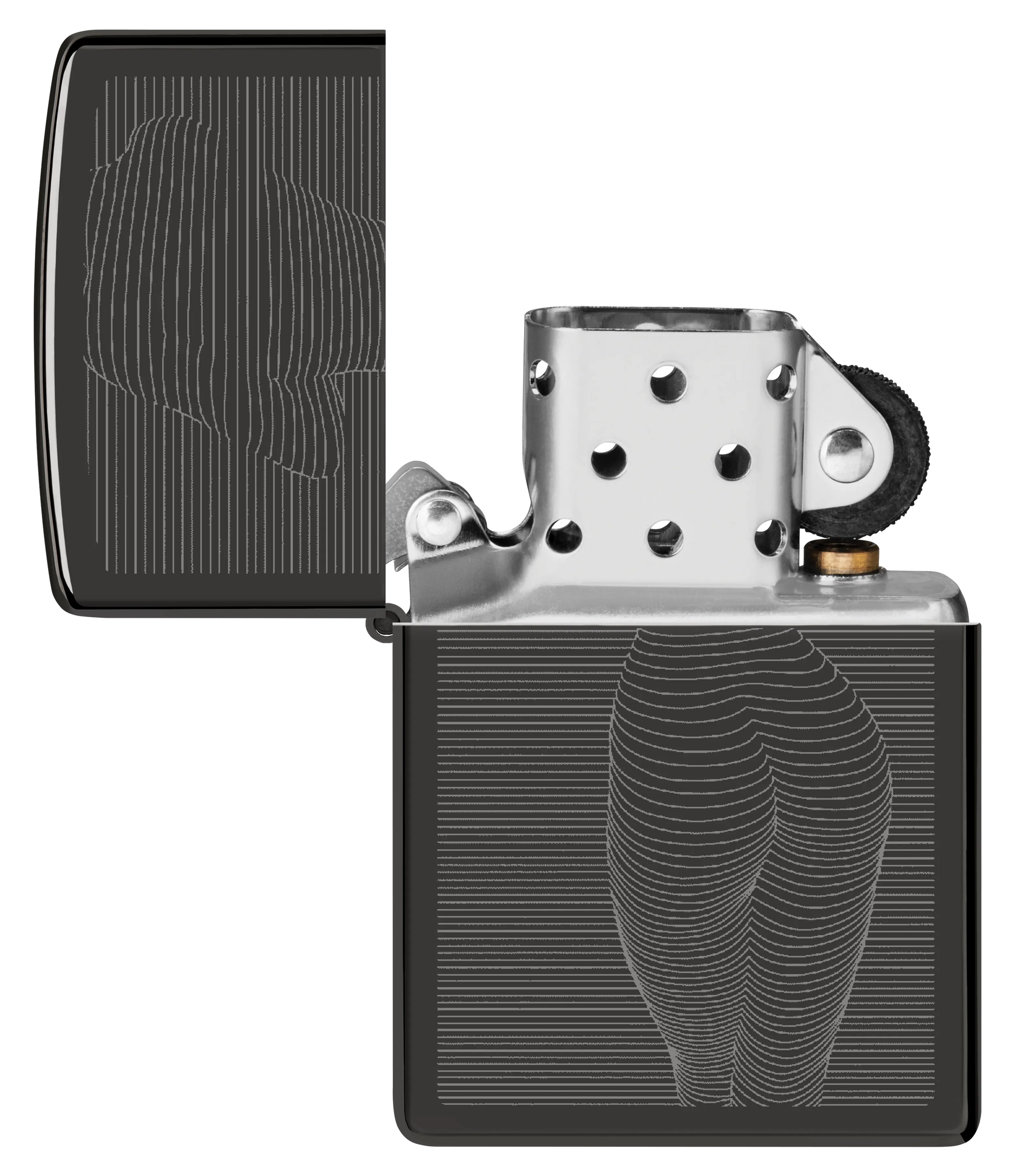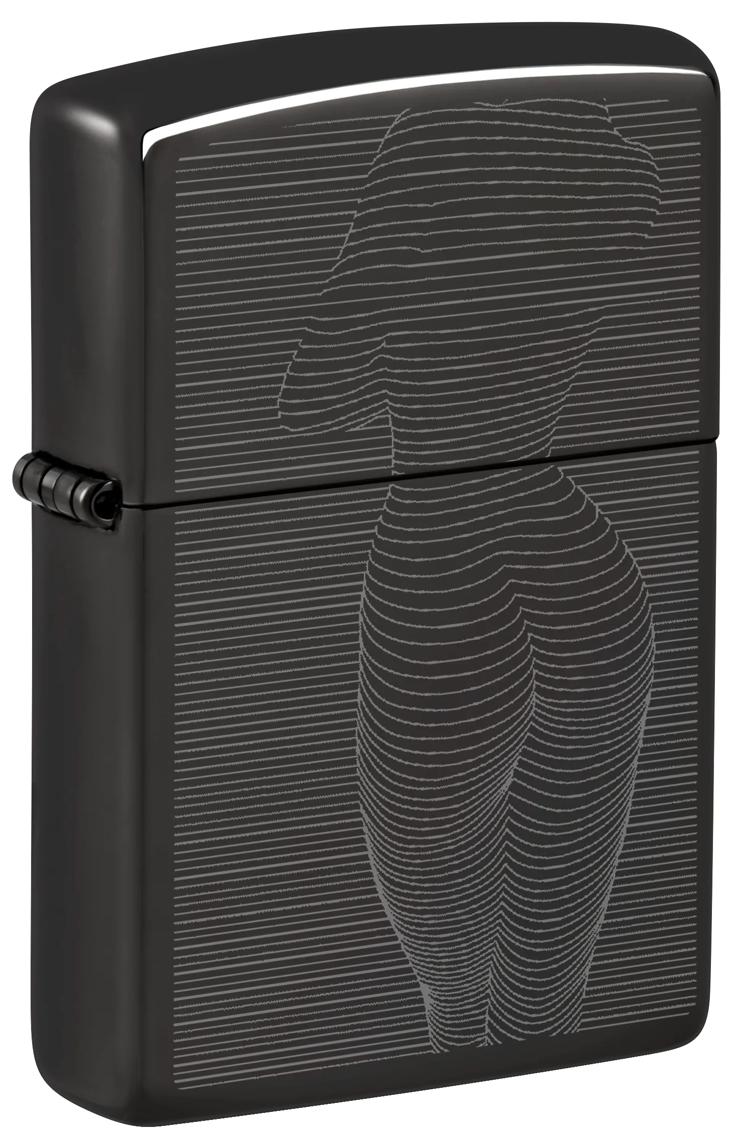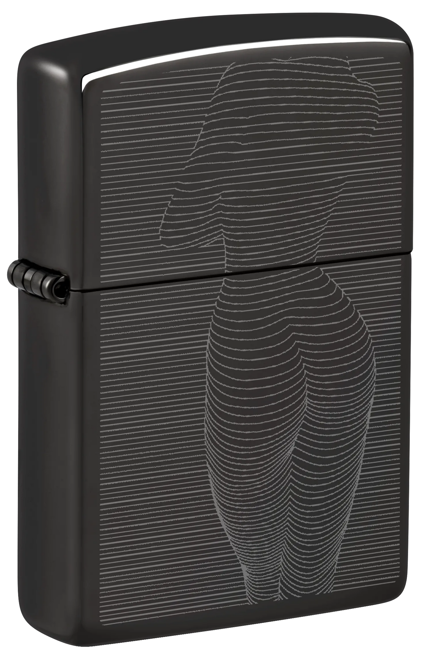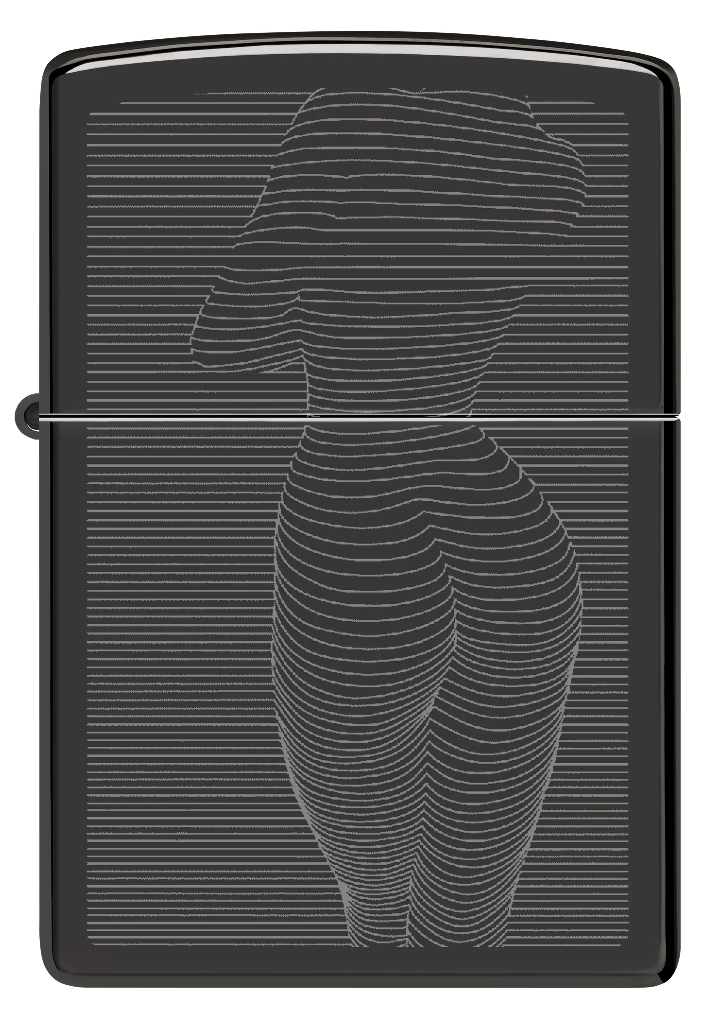 Fijne parallelle lijnen buigen en verschuiven tot een vrouwelijke vorm op deze klassieke High Polish Black aansteker in een mysterieus Photo Image design.