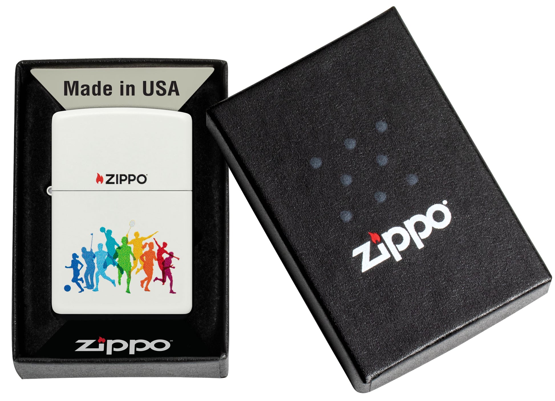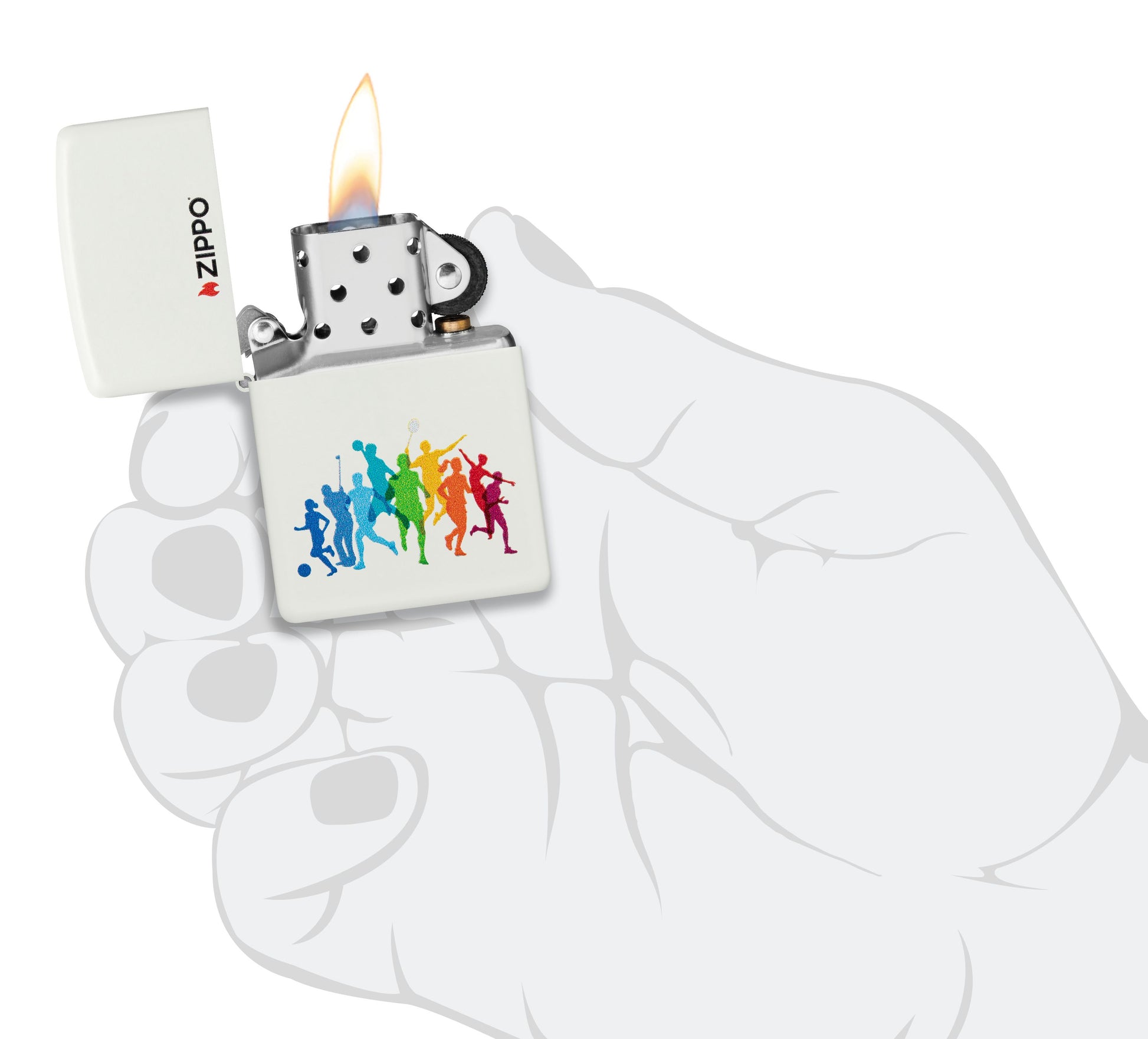Van golf tot tennis tot volleybal, je favoriete zomerspelen zijn schitterend vastgelegd in levendige regenboogtinten op deze klassieke White Matte aansteker met gedurfd Color Image design.