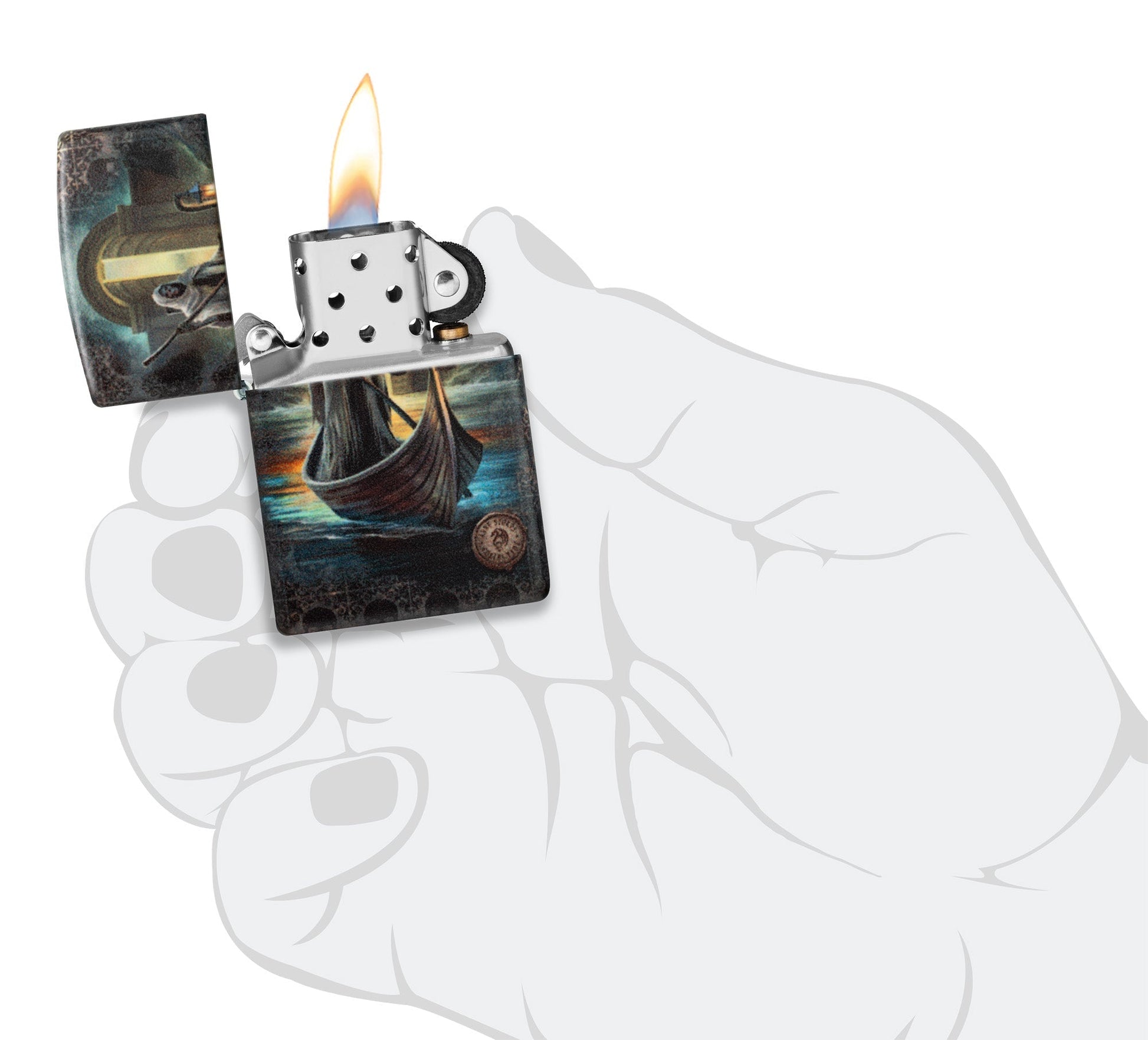 De mystieke kunst van Anne Stokes komt tot leven op deze klassieke 540 Color-aansteker. De veerman is een personage uit oude Griekse legendes, die de zielen van de overledenen vervoert naar het hiernamaals. Het spookachtige beeld wordt omgeven door een subtiel doodshoofdmotief, met op de achterkant een zandloper als vingerwijzing naar onze sterfelijkheid.