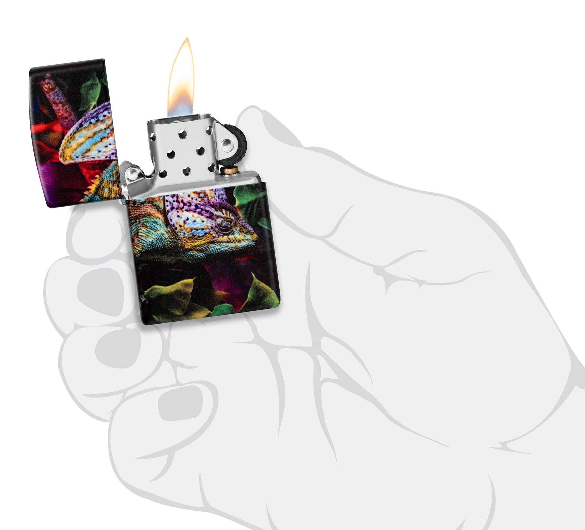Een kleurrijke kameleon kruipt door het gebladerte in een prachtig 540 Color-design dat zich naadloos uitstrekt over elk oppervlak van de aansteker.