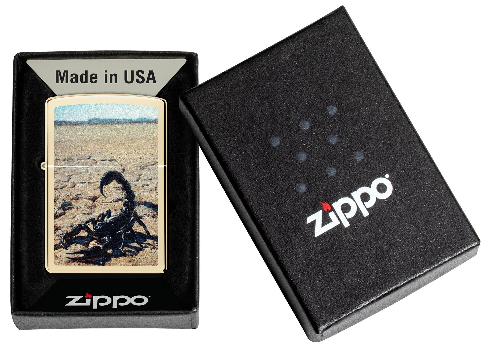 In een dor woestijnlandschap staat een meedogenloze schorpioen klaar om toe te slaan vanaf deze klassieke Champagne-aansteker in een levendig Color Image-design.