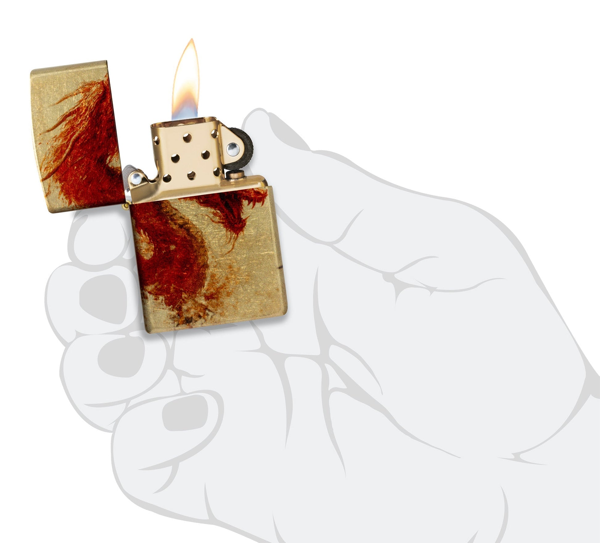 Ontketen de macht van de draak met deze klassieke Tumbled Brass-aansteker. Het betoverende 540 Fusion-design toont een verfijnde vurige draak die naadloos overgaat in de samoeraikrijger op de achterkant.