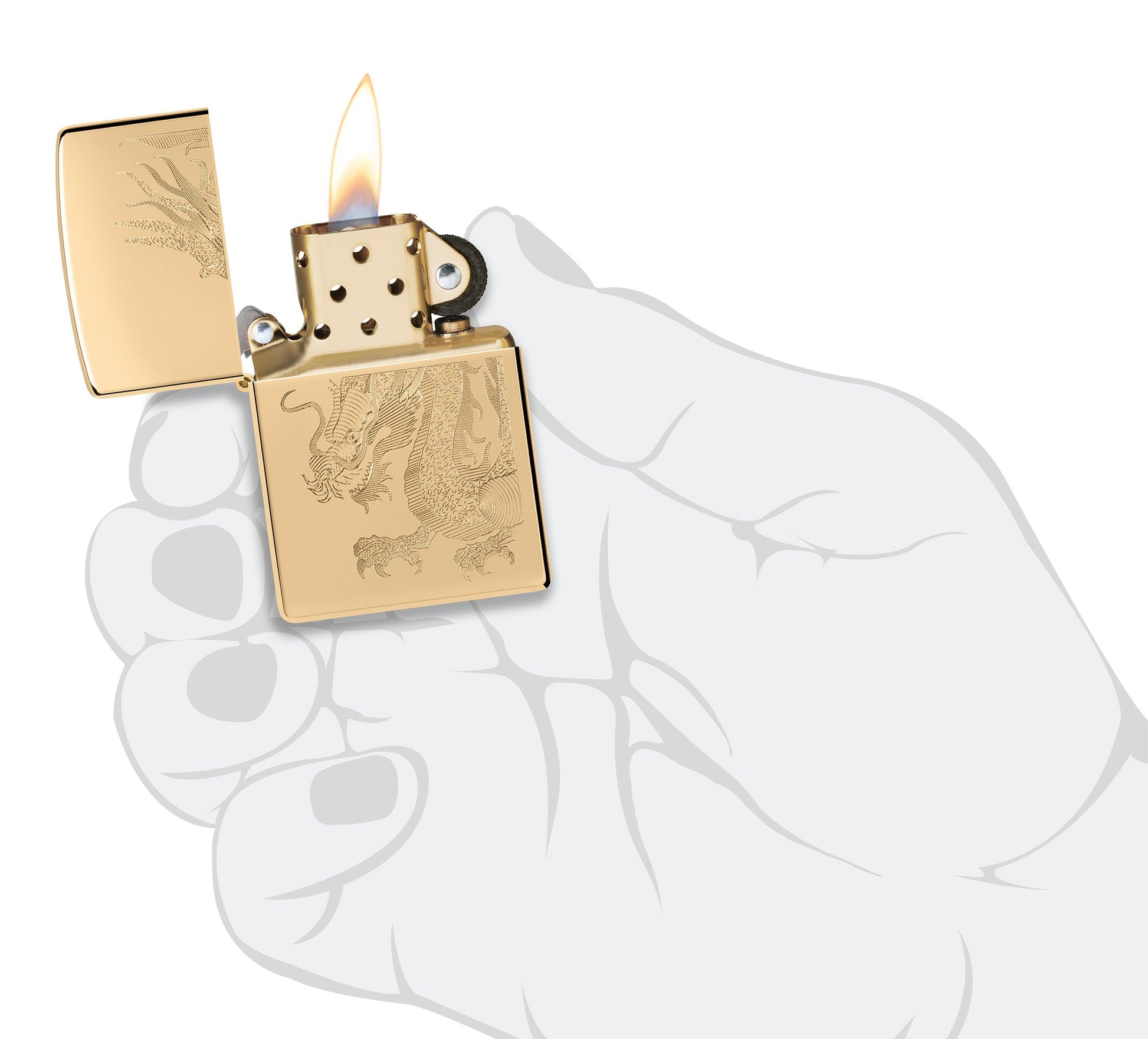Als een symbool van kracht, macht en wijsheid poseert een klassieke draak op deze High Polish Brass-aansteker in een geraffineerd Auto Engrave-design.