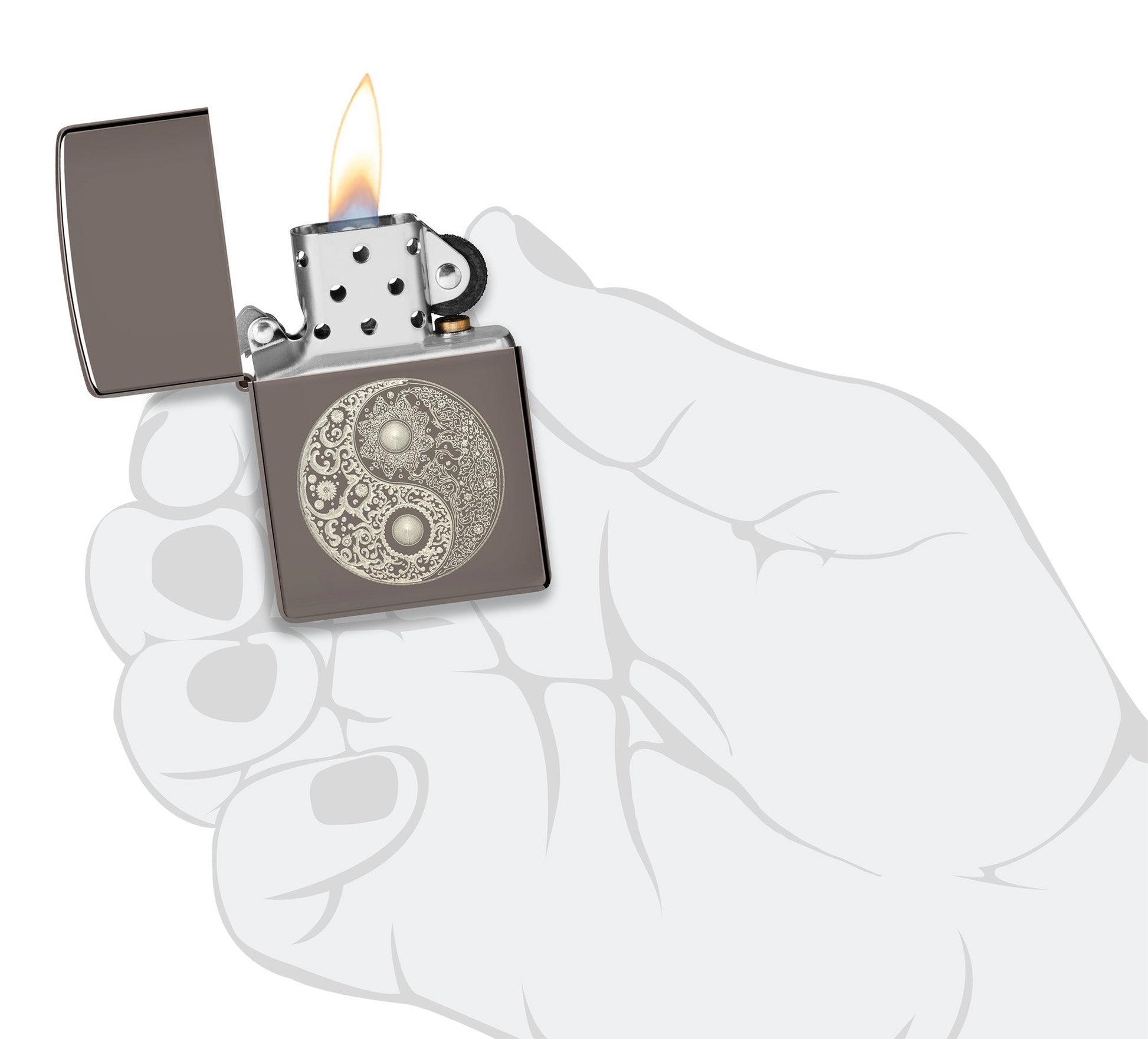 Voeg wat rust en evenwicht toe aan je collectie met deze klassieke Black Ice®-aansteker. De iconische yin-yangsymbolen, gevuld met fijn filigraan, zijn in perfecte harmonie afgebeeld in dit Laser Fancy Fill-design.