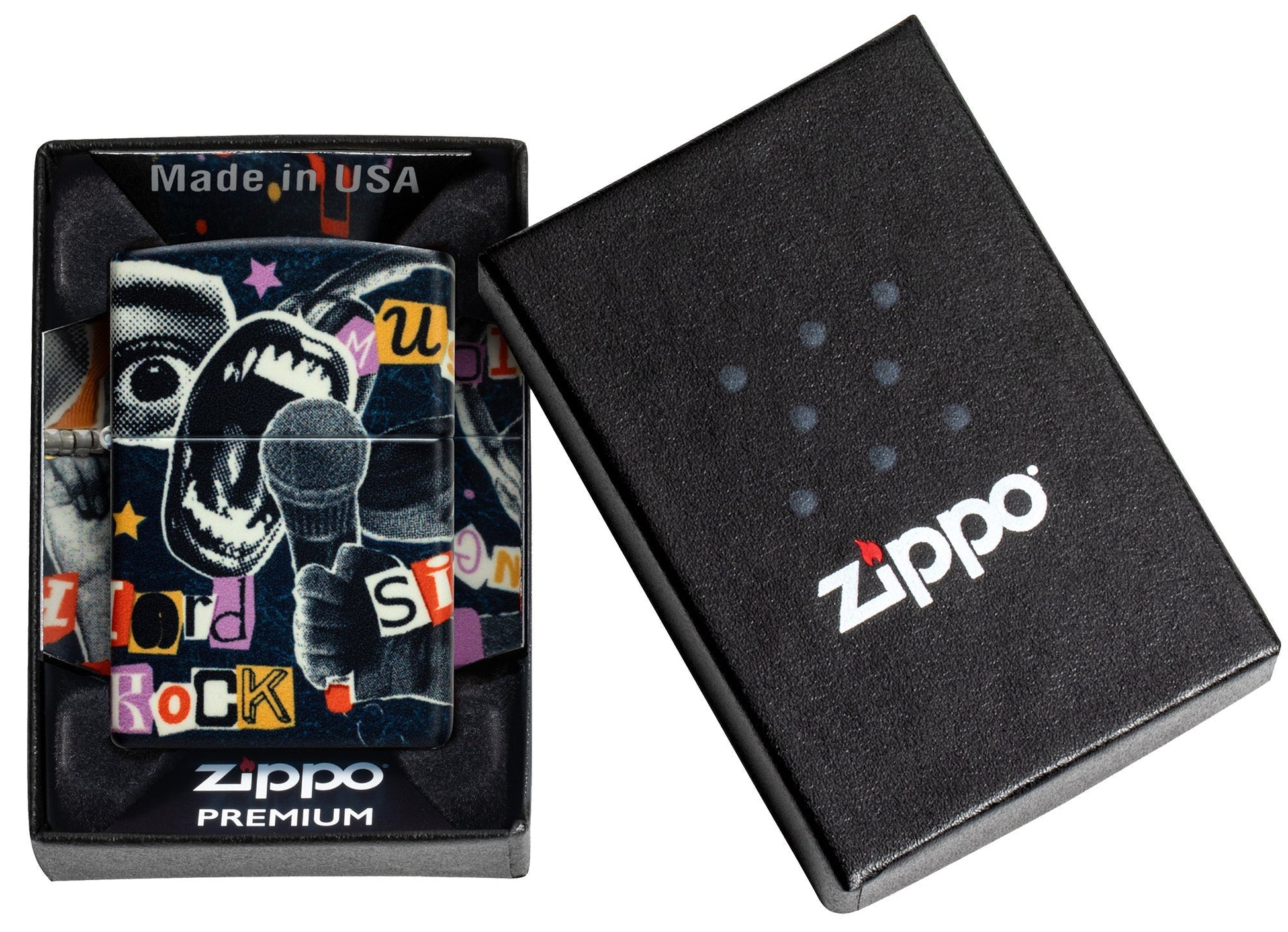 Toon je liefde voor muziek met deze 540 Color-aansteker. Het naadloze design vormt een abstracte collage van muziekgenres en rock-’n-roll-symboliek met een retro-twist.