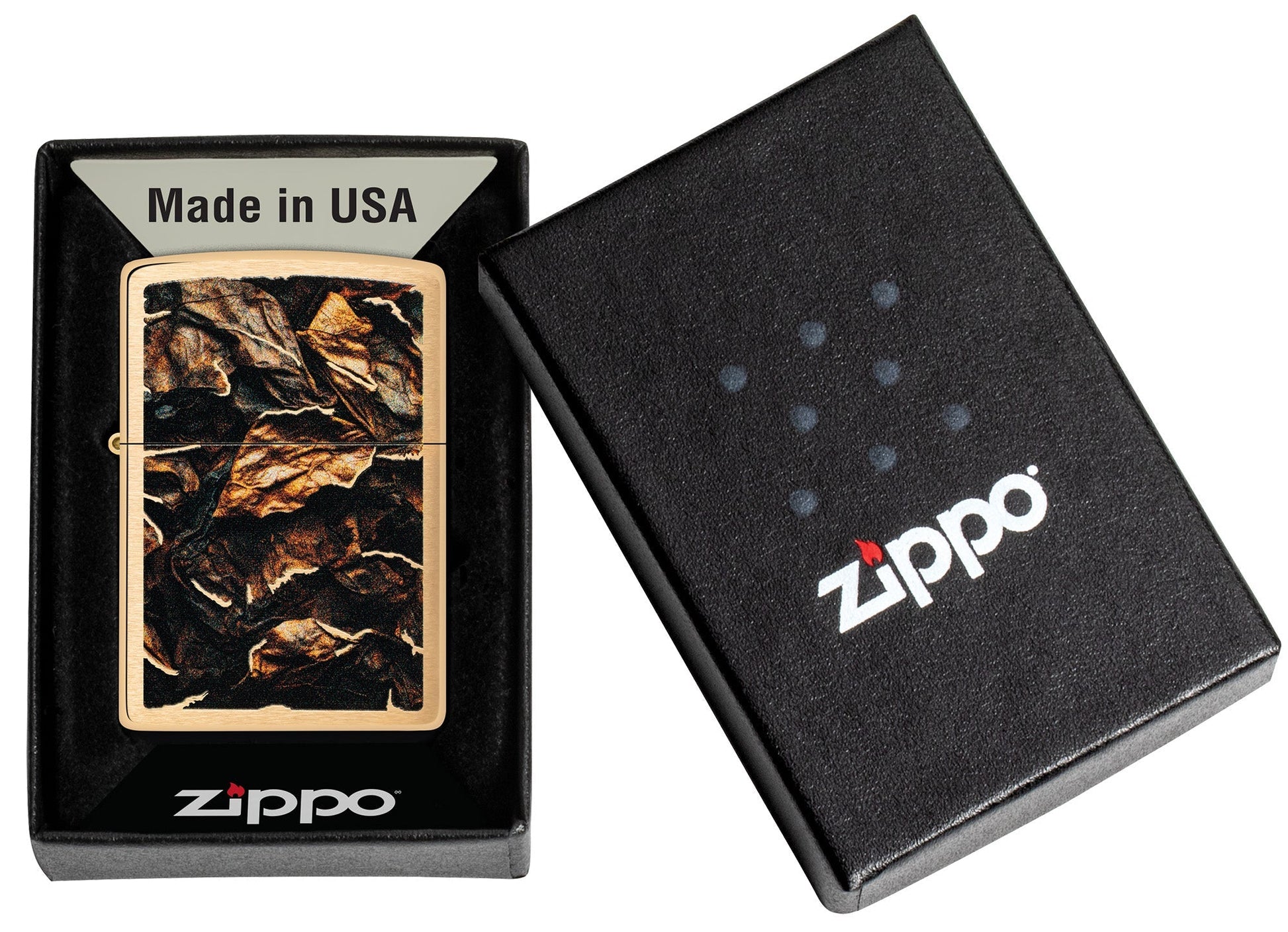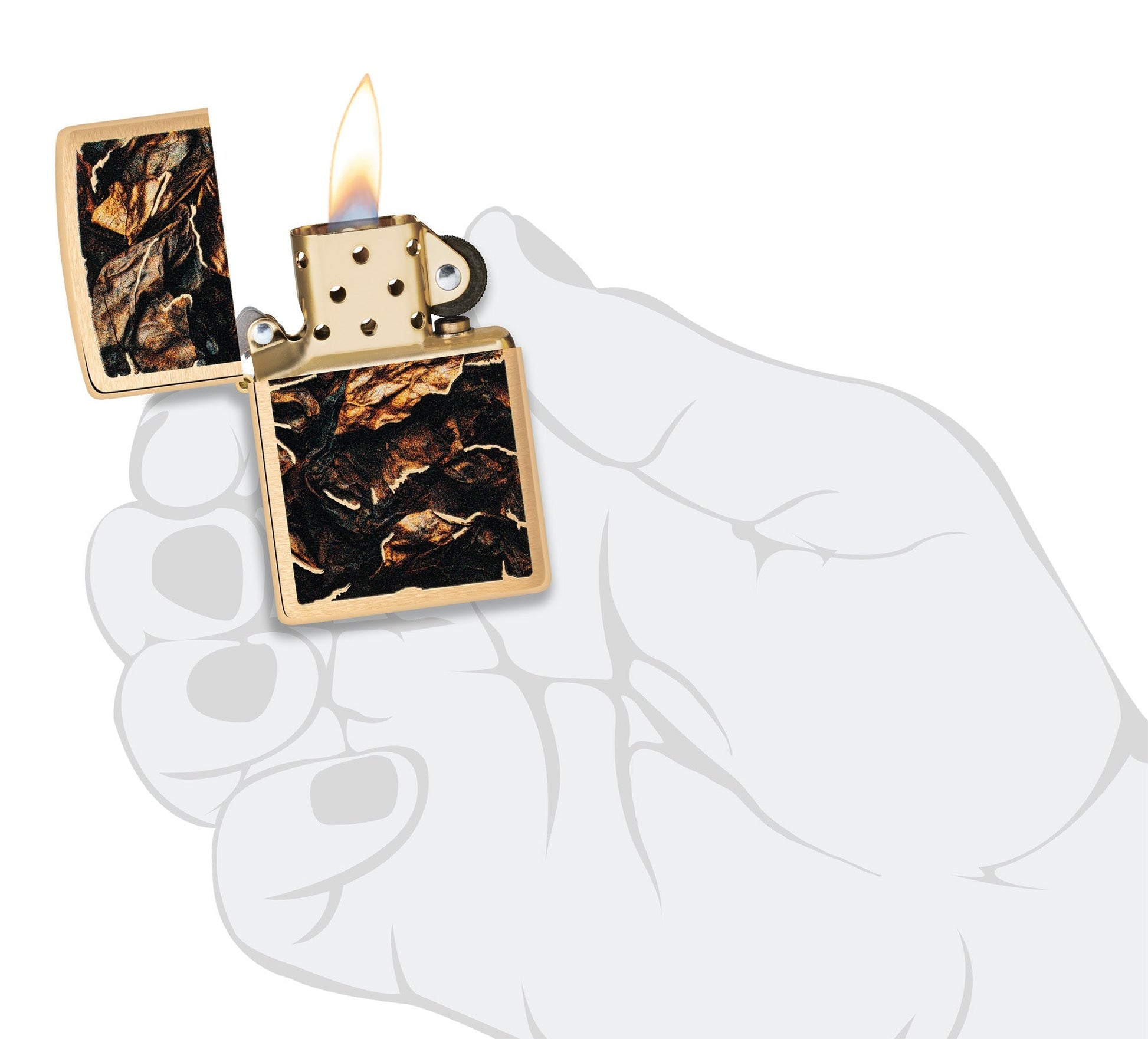 Deze klassieke Brushed Brass-aansteker toont een oogst van gedroogde bladeren in een rustgevend Color Image-design.