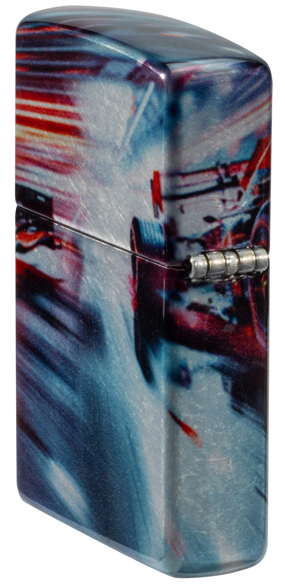 Een Formule 1-wagen raast op volle snelheid over het oppervlak van deze klassieke Tumbled Chrome-aansteker in een krachtig 540 Fusion-design, dat zich met glinsterende metallic tinten naadloos uitstrekt over de hele behuizing.