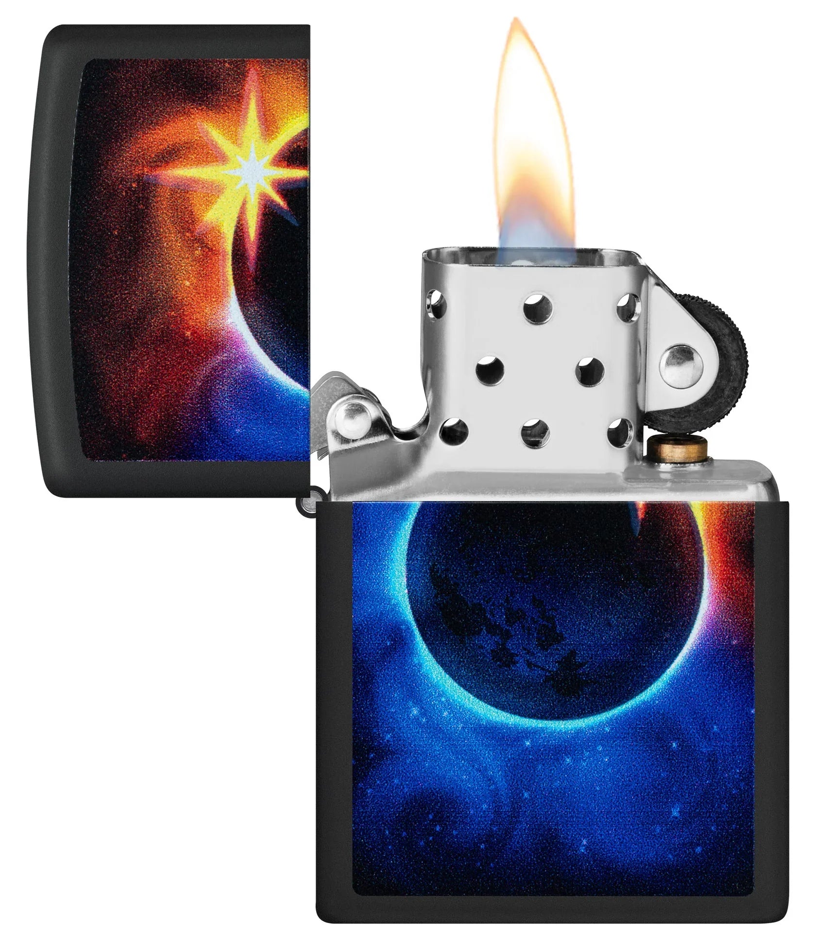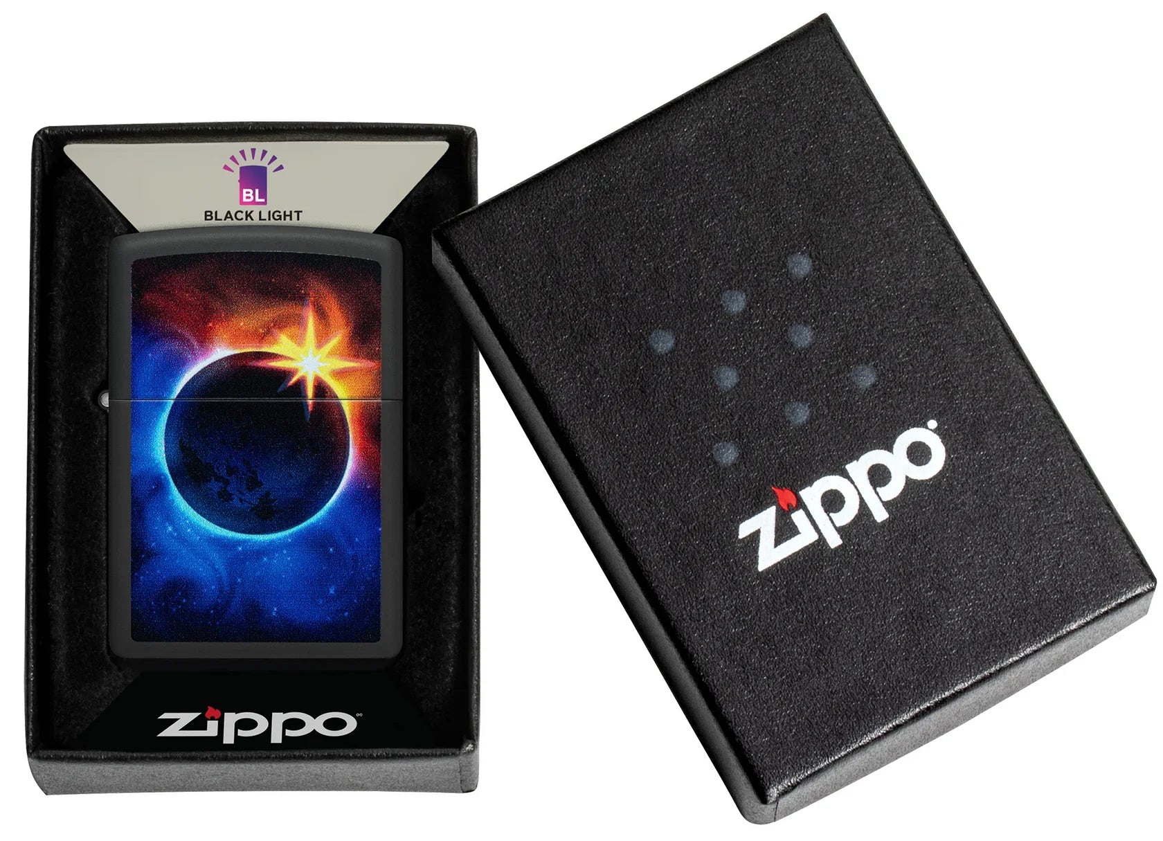 Met deze klassieke Black Matte aansteker kun je een van de grootste wonderen der natuur overal mee naartoe nemen. Een schitterende zonsverduistering is vastgelegd in een levendig kleurenafbeeldingontwerp dat glinstert onder ultraviolet licht dankzij ons Black Light-proces.