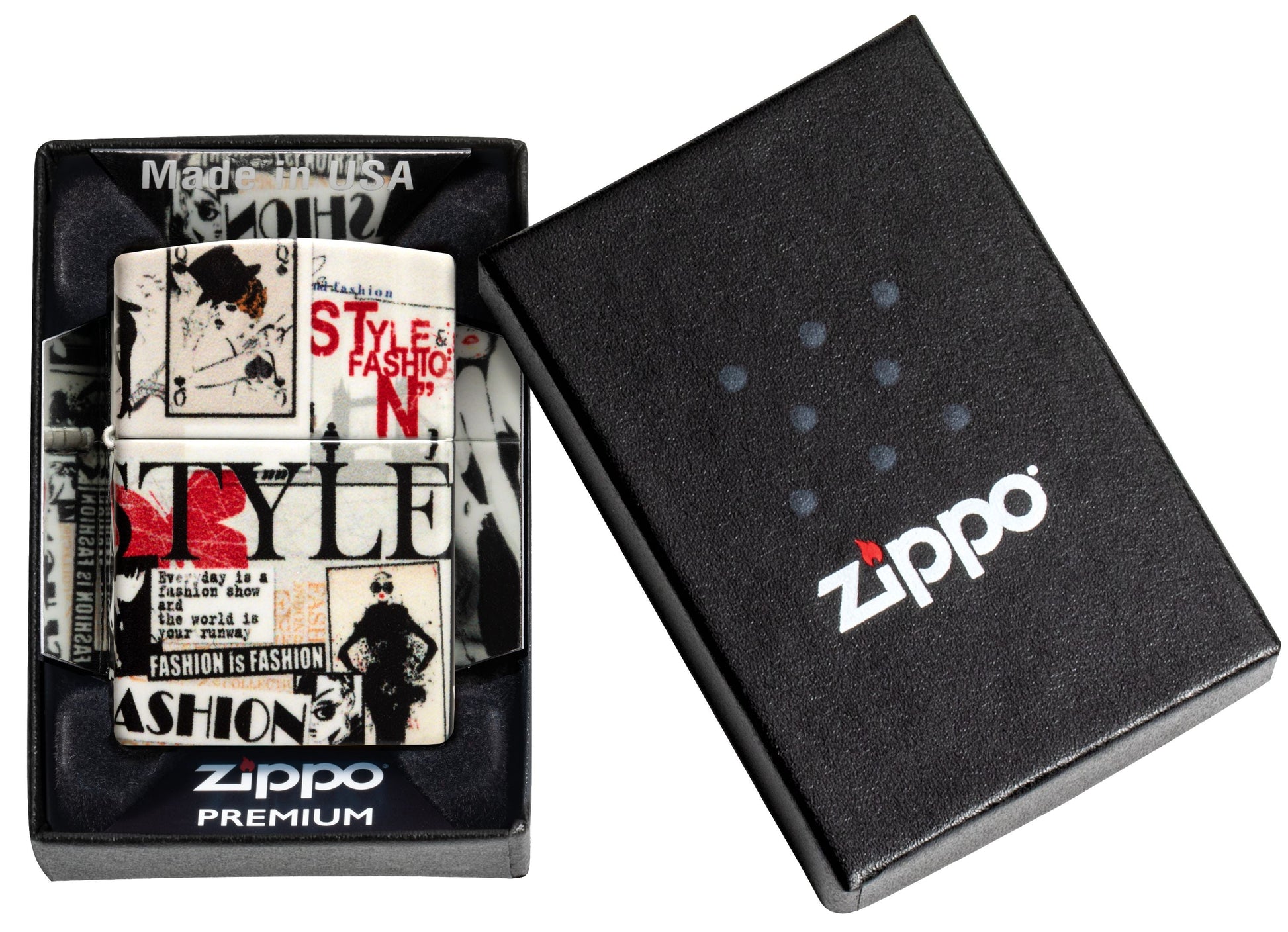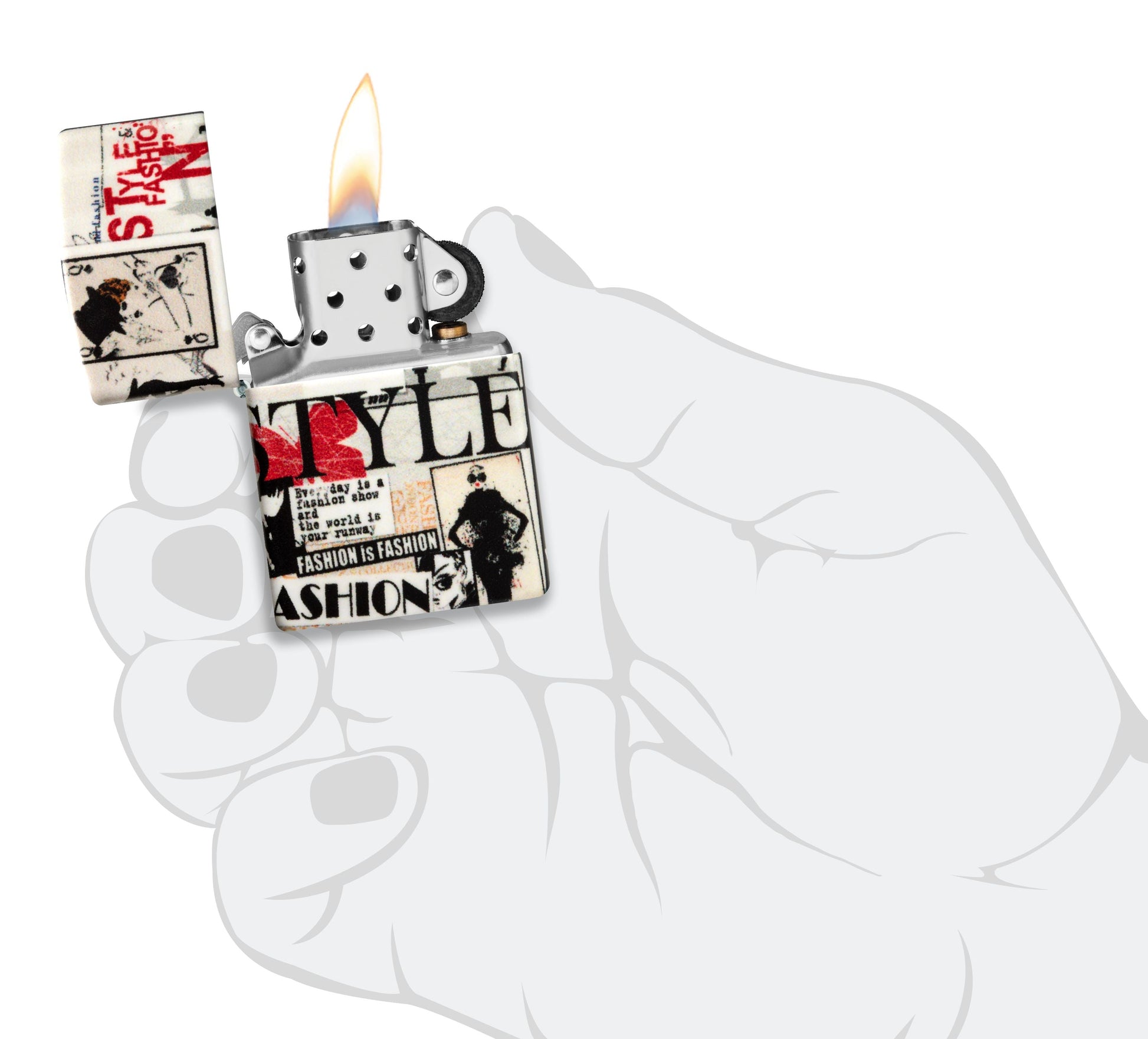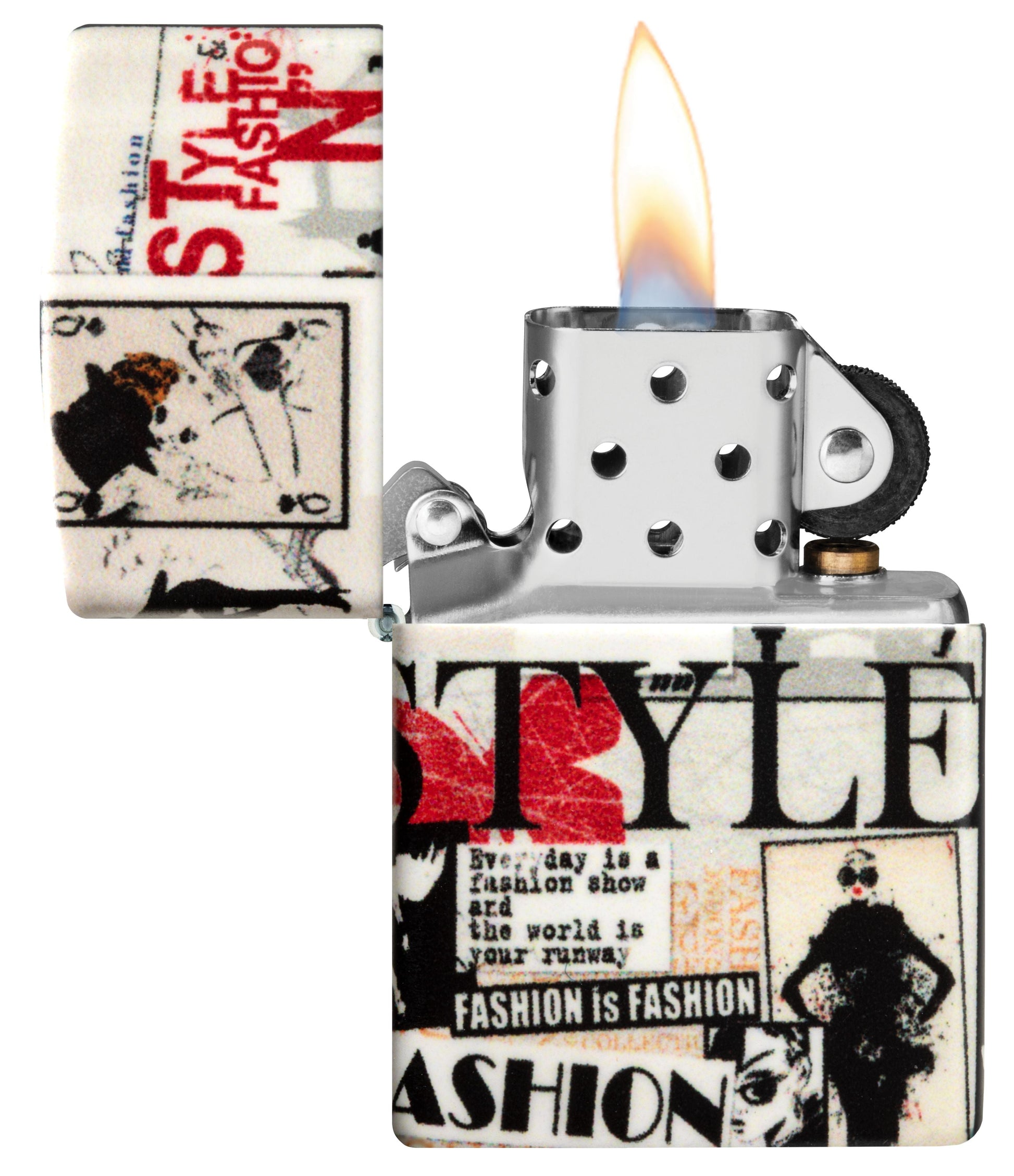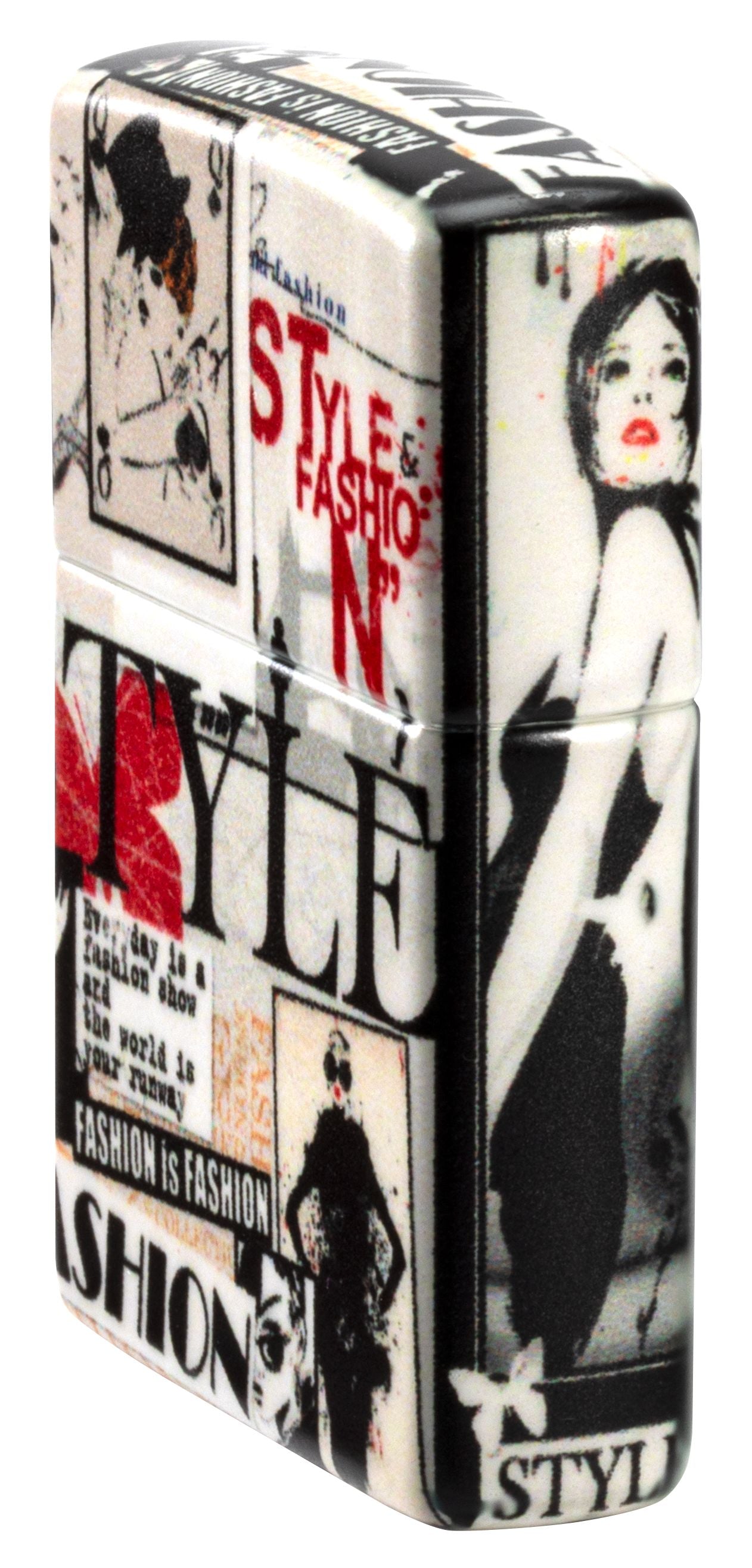 Pronk met je onberispelijke gevoel voor mode met deze stijlvolle 540 Color aansteker, die aan alle kanten bedekt is met nieuwsknipsels uit de haute couture.
