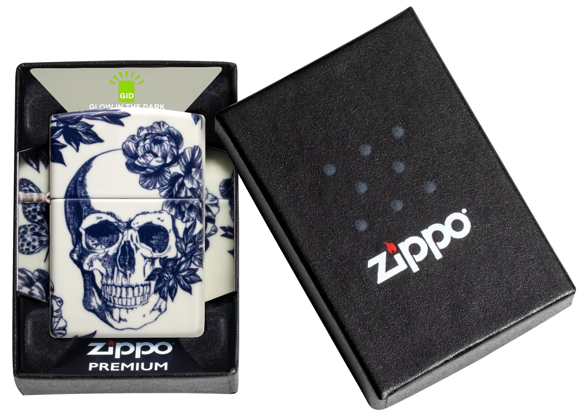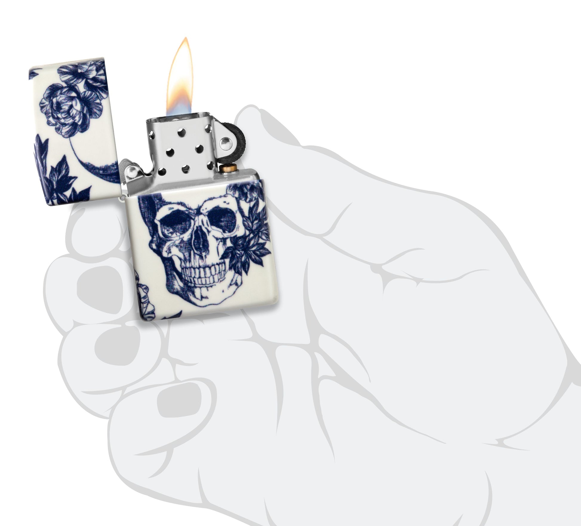 Deze donkerromantische 540 Color aansteker toont een verfijnde schedel omringd door delicate bloemen en vlinders in een naadloos ontwerp, dat voor extra allure behandeld is met onze Glow-in-the-Dark-afwerking.
