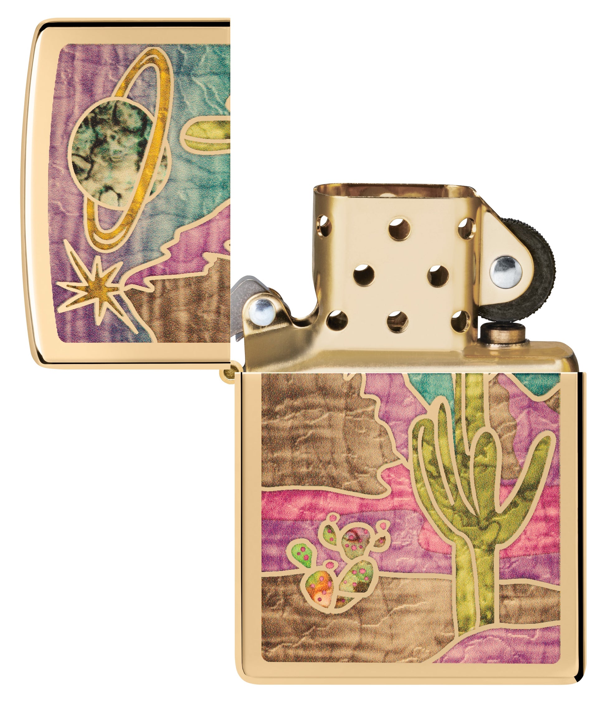 Levendige cactussen ontspringen aan het oppervlak van deze hoogglans messing aansteker in een betoverend Fusion design.
