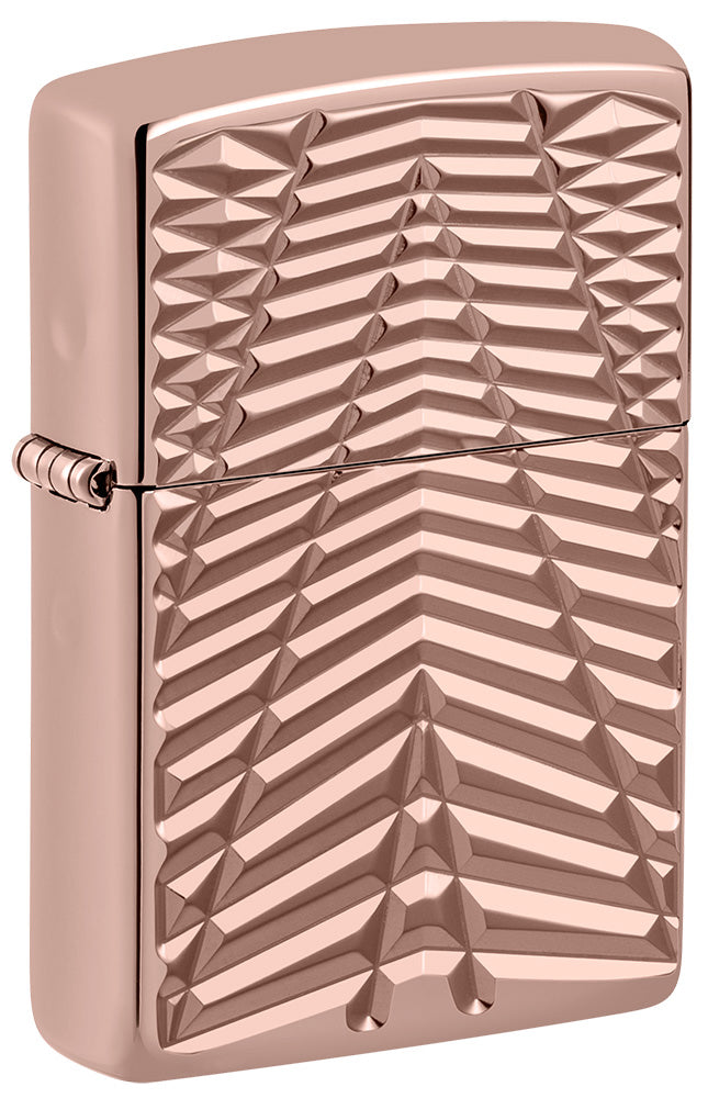 Deze schitterende Armor® High Polish Rose Gold aansteker heeft een luxueus geometrisch patroon, aangebracht met ons Deep Carve graveerproces.