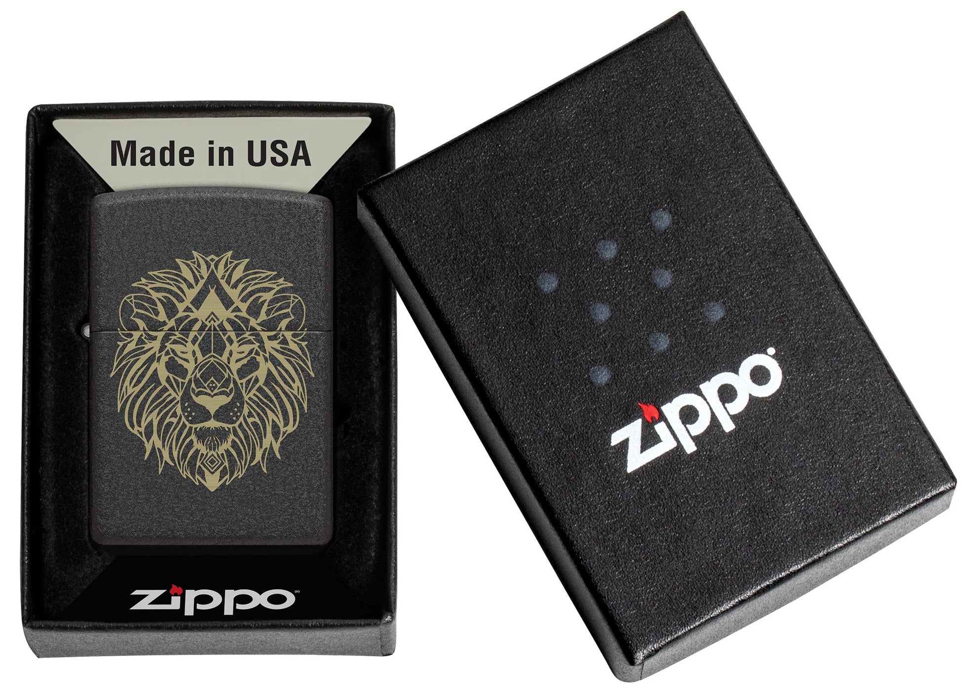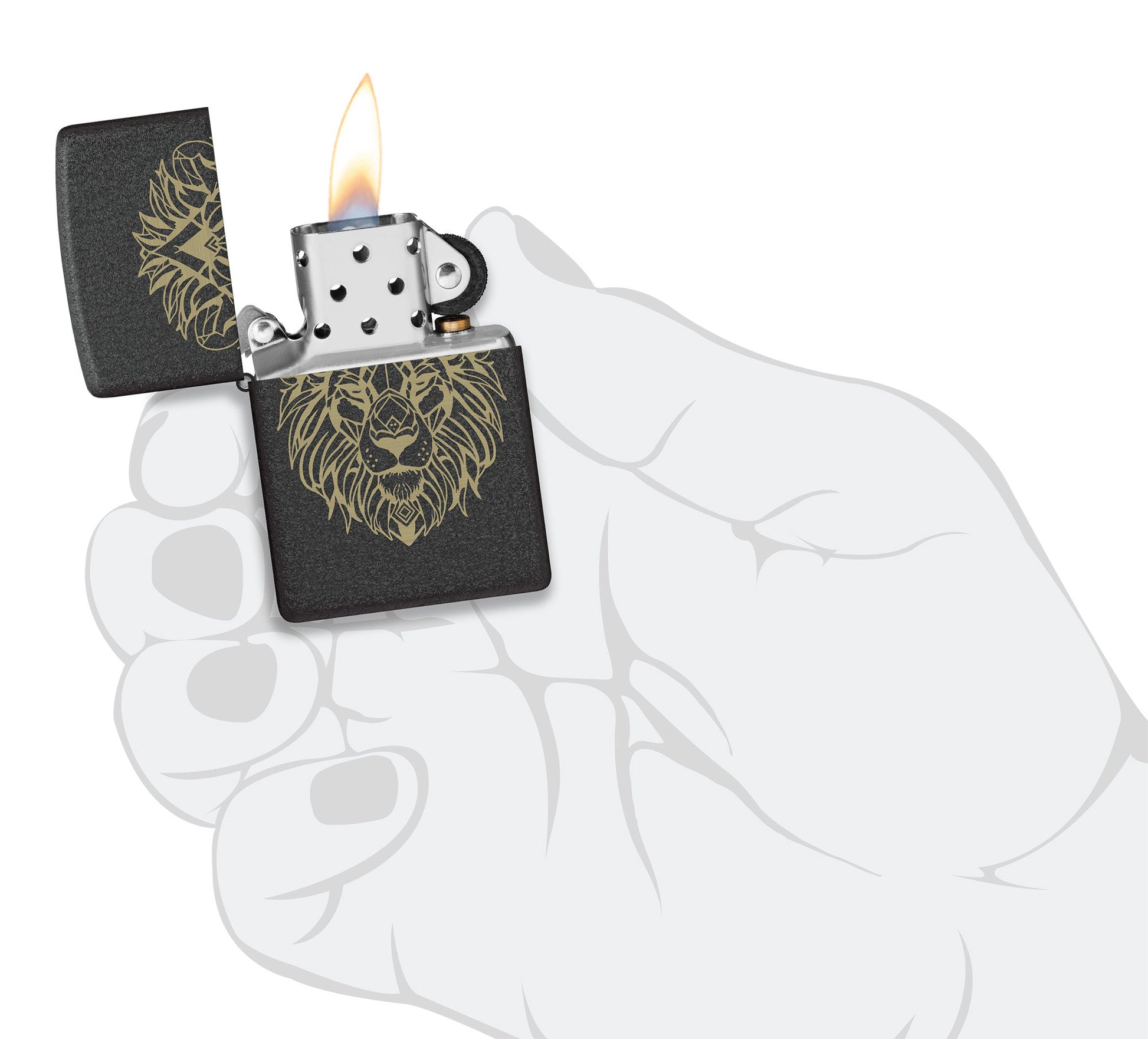 Op deze klassieke Black Crackle®-aansteker in een strak ontwerp met lasergravure vormen complexe lijnen en figuren een perfect symmetrische leeuw.