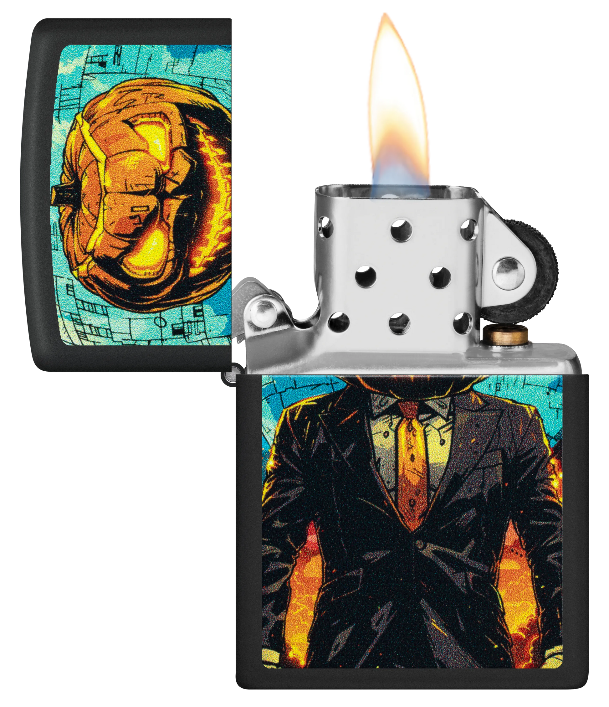 Een grijnzende jack-o-lantern neemt de vorm aan van een mens in deze klassieke Black Matte aansteker in een griezelig Color Image design.