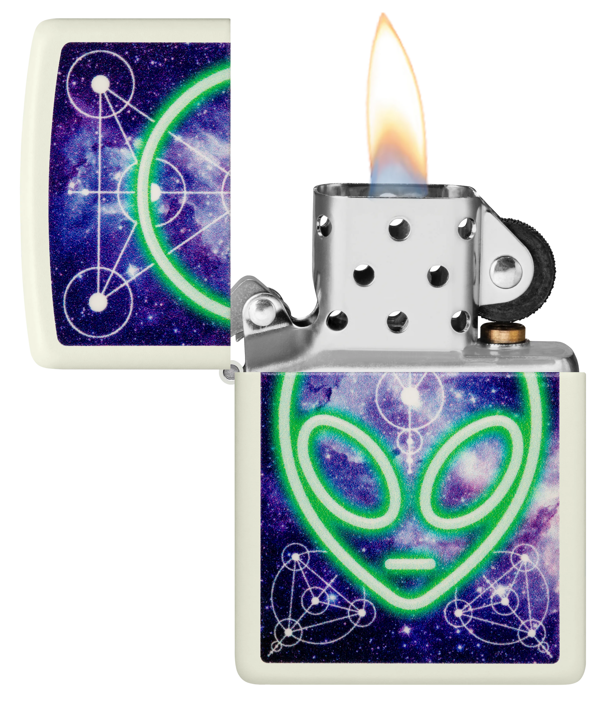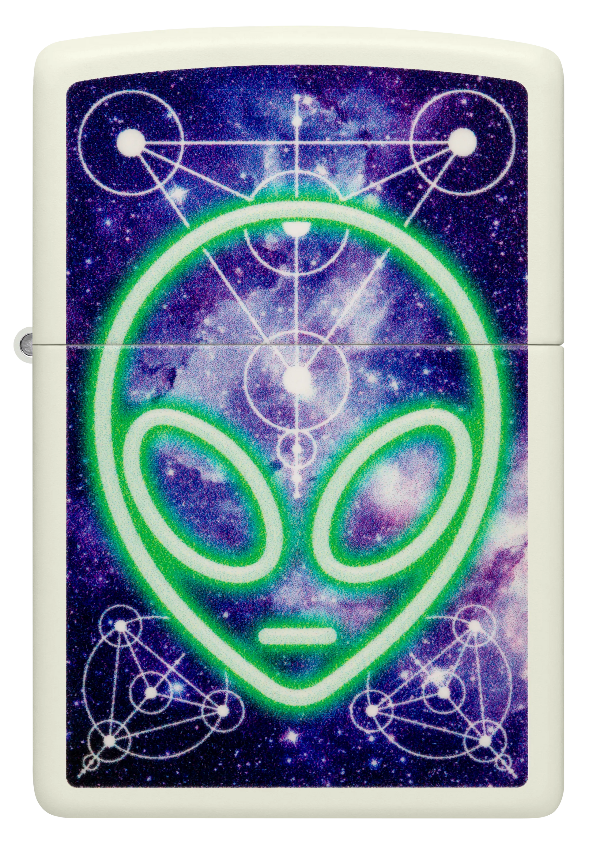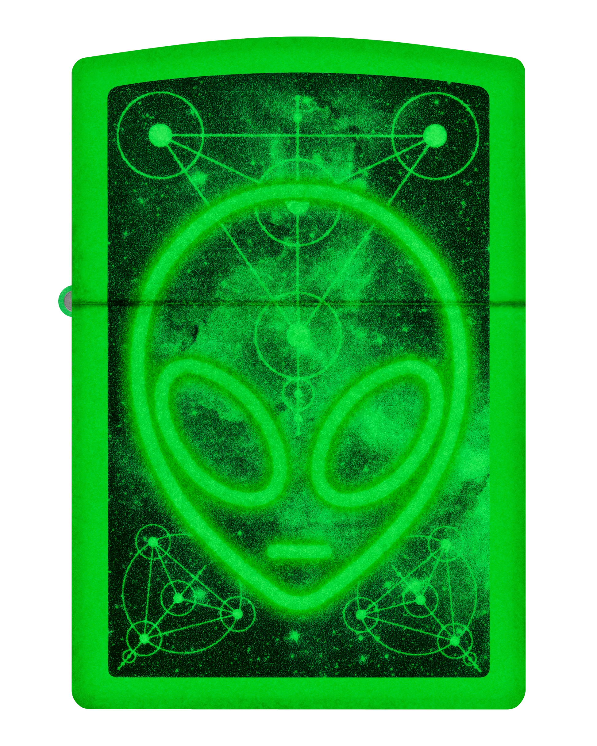 Tegen de achtergrond van een biologerend sterrenstelsel verschijnt dit glanzende hoofd van een alien op deze klassieke Glow-in-the-Dark aansteker in een buitenaards Color Image design.
