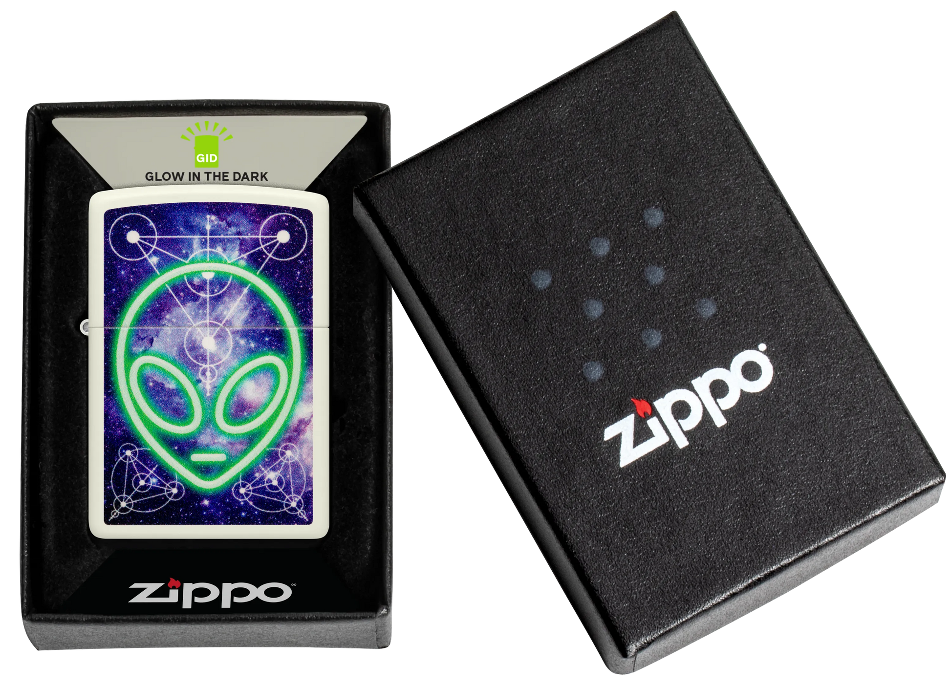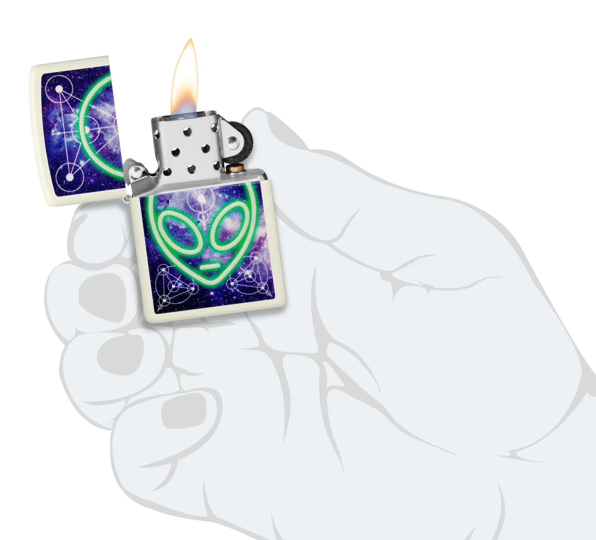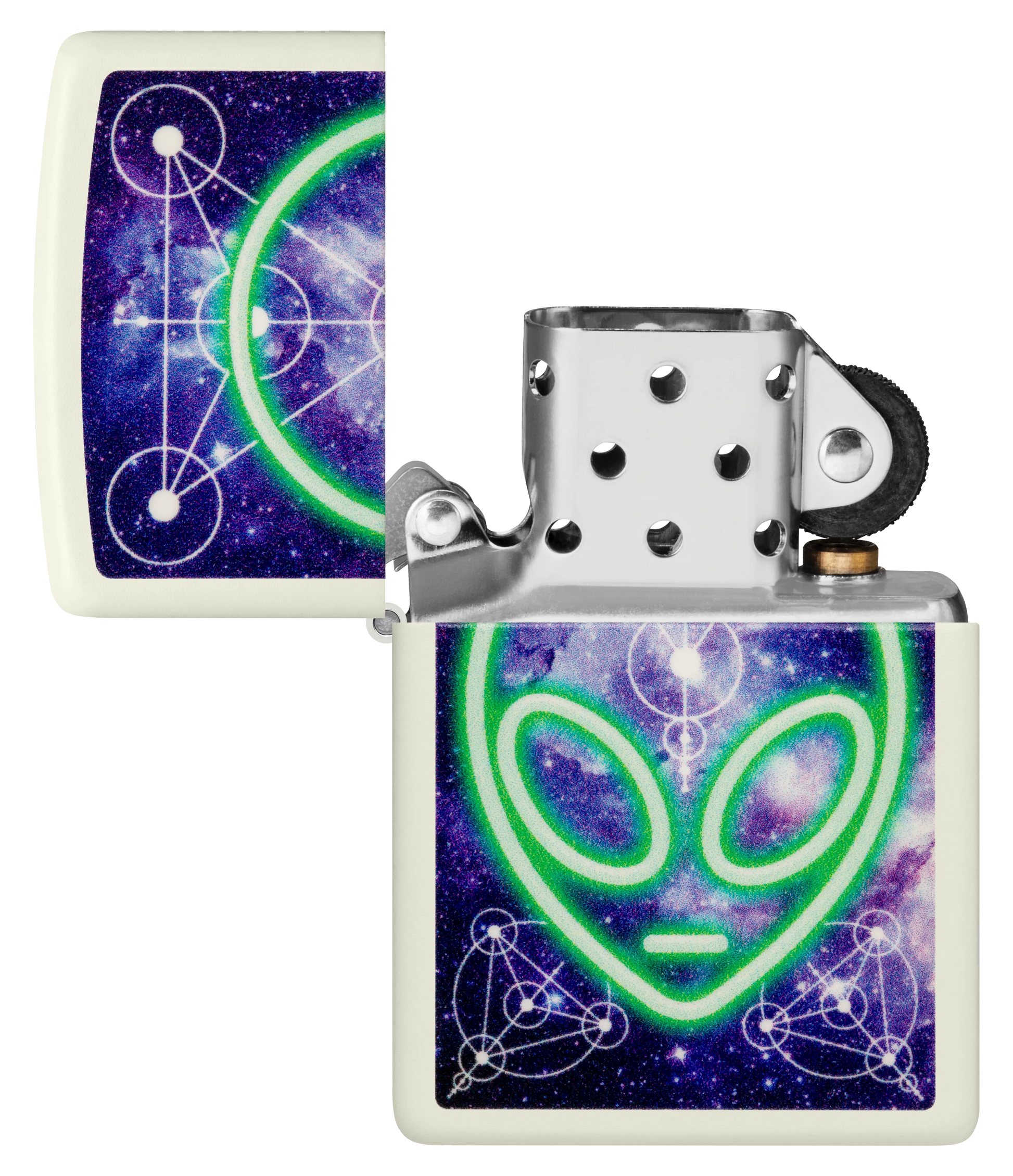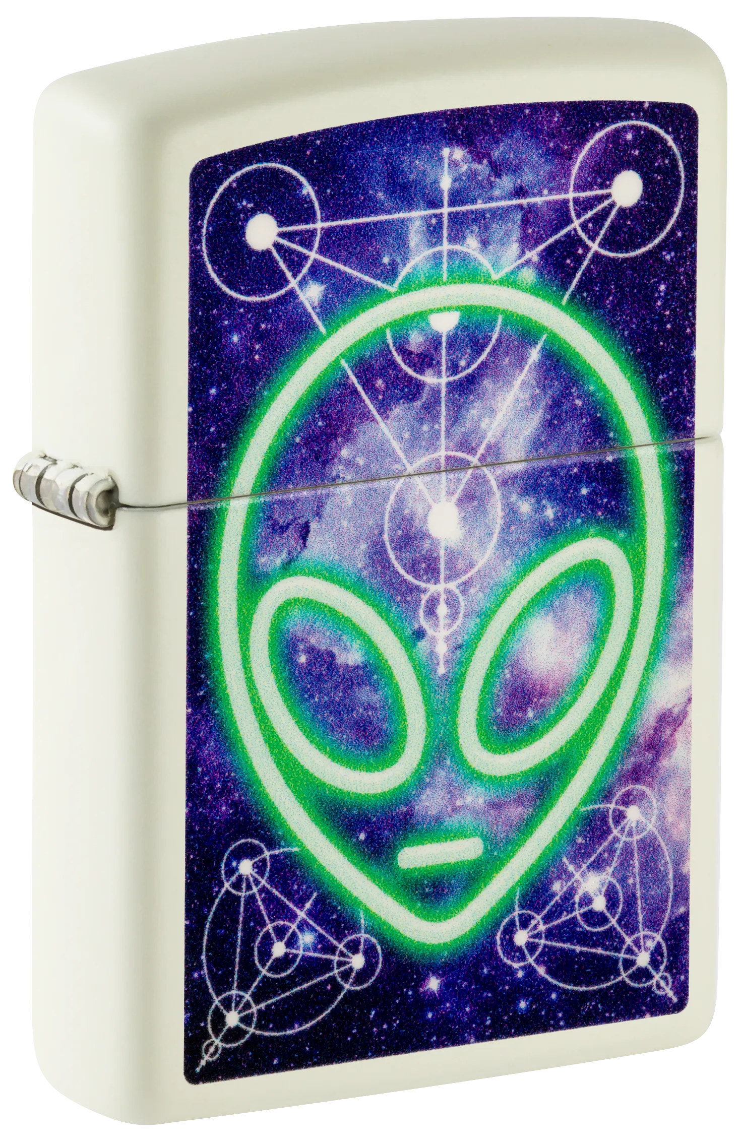 Tegen de achtergrond van een biologerend sterrenstelsel verschijnt dit glanzende hoofd van een alien op deze klassieke Glow-in-the-Dark aansteker in een buitenaards Color Image design.