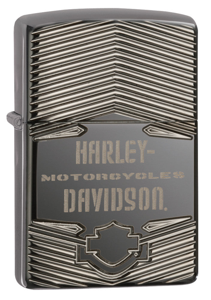 Deze Harley-Davidson® aansteker heeft de bekende naam met een slank Deep Carve Armor® ontwerp op een Black Ice®.