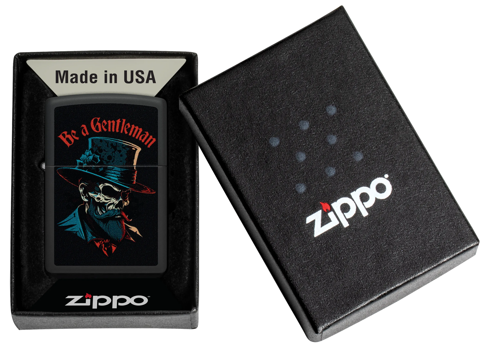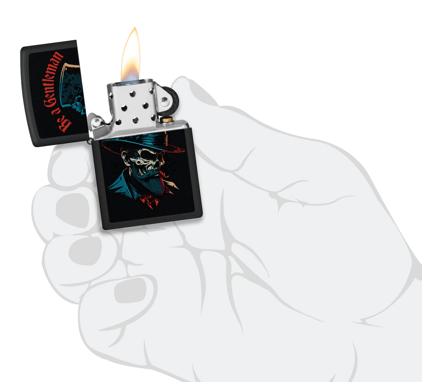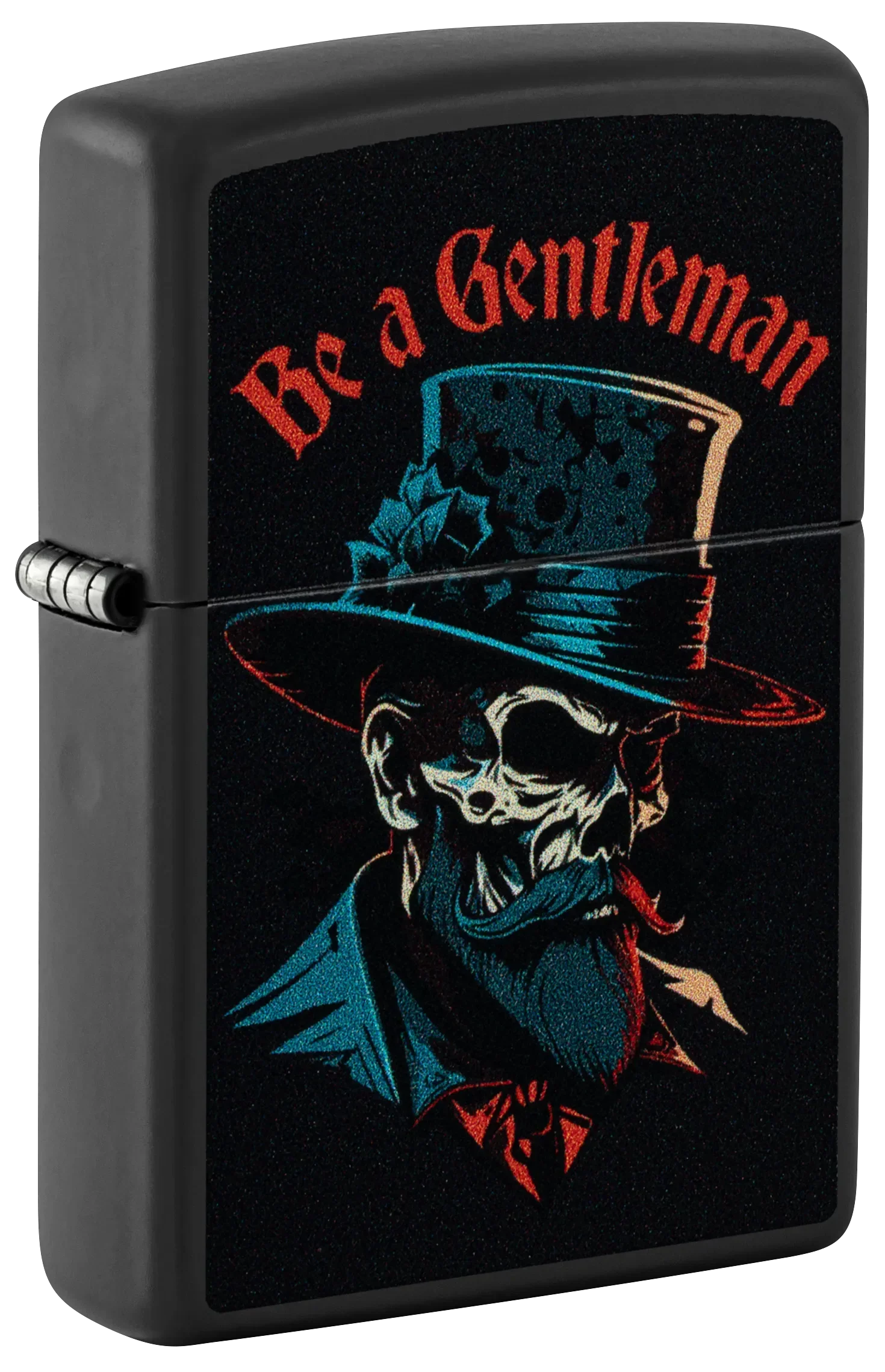 Omhuld door mysterieuze schaduwen verschijnt een skeletachtige kerel op deze klassieke Grey aansteker onder de inscriptie 'Be a Gentleman’ in een statig Color Image design.
