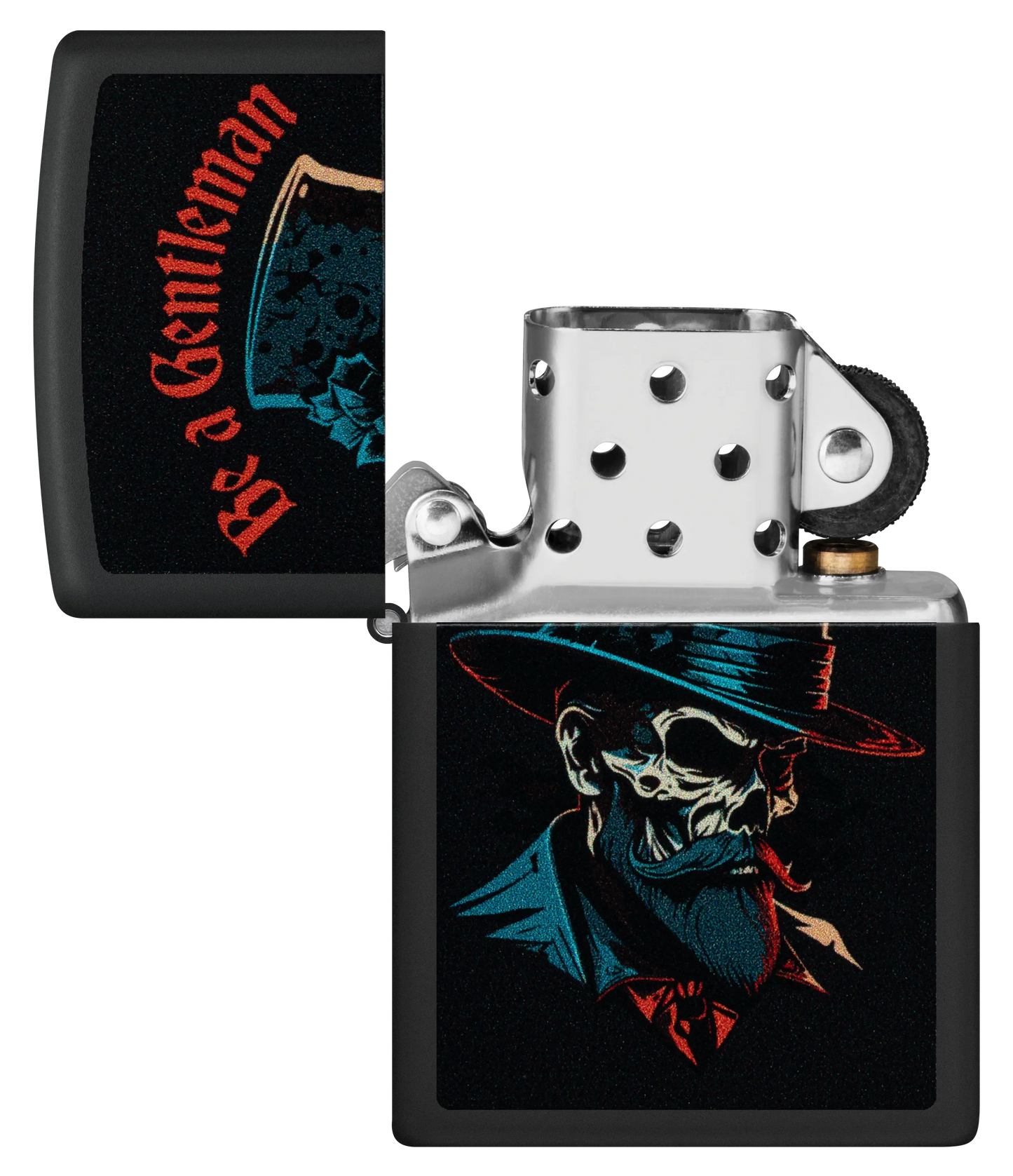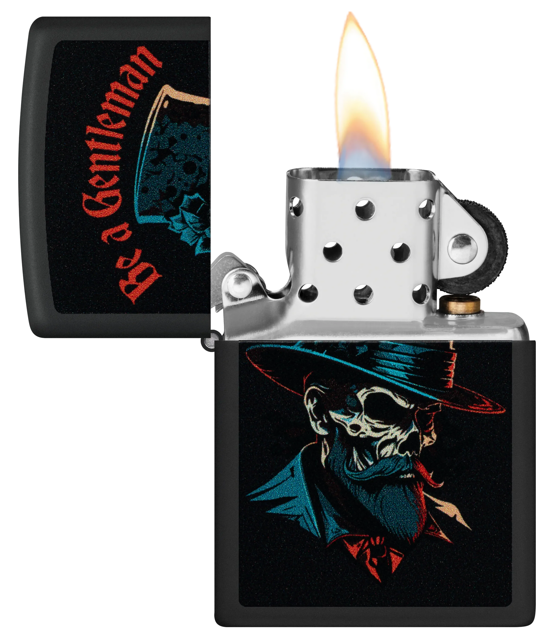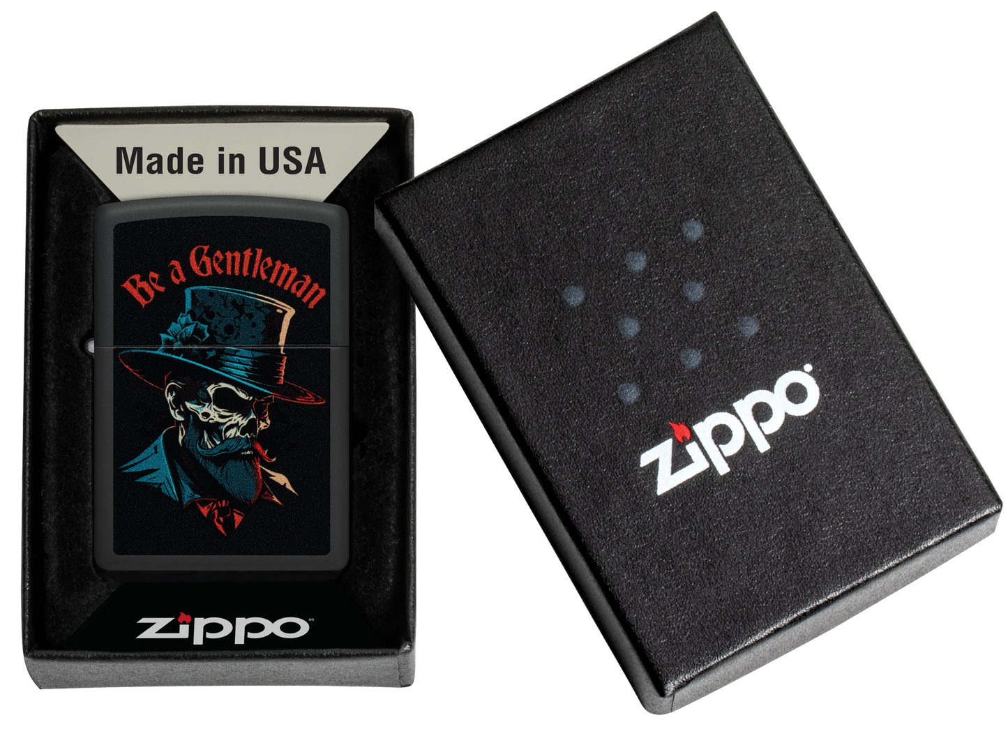 Omhuld door mysterieuze schaduwen verschijnt een skeletachtige kerel op deze klassieke Grey aansteker onder de inscriptie 'Be a Gentleman’ in een statig Color Image design.