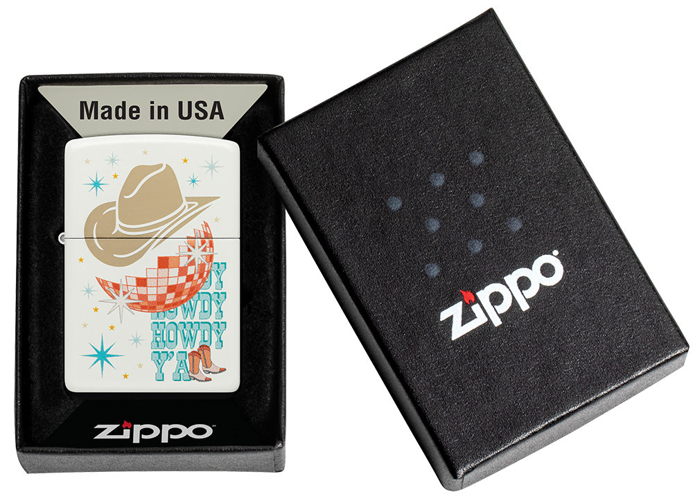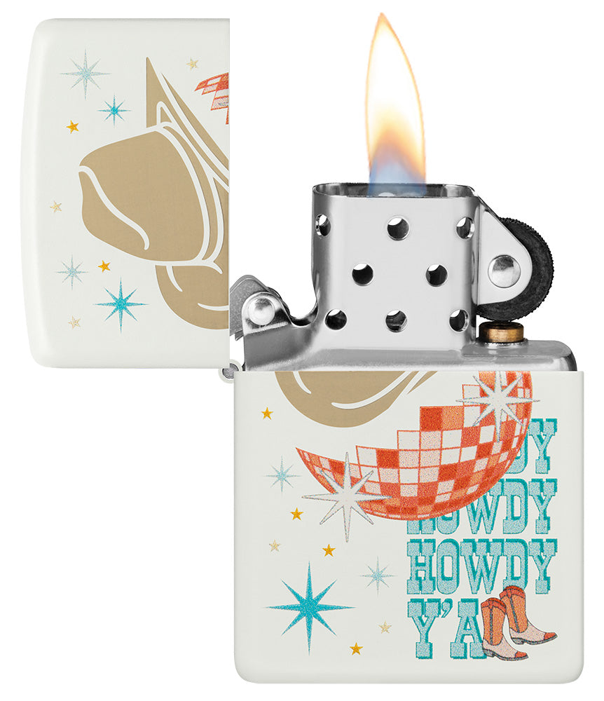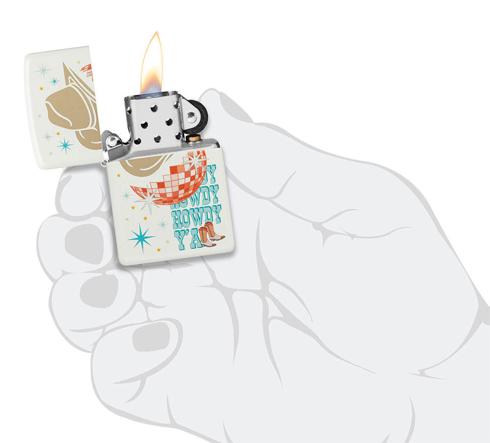 Deze klassieke White Matte aansteker is er helemaal klaar voor. Een nieuw paar laarzen, een fraaie nieuwe hoed en een oogverblindende discobal worden weergegeven in een Color Image en Laser Engrave design, zodat je de rodeo overal mee naartoe kunt nemen.