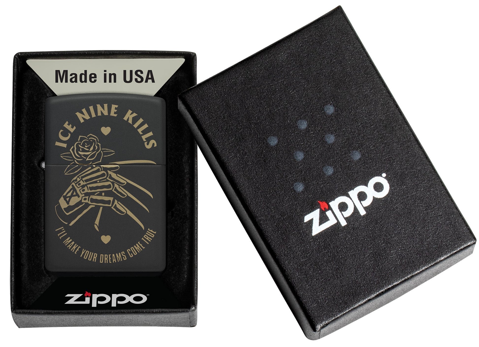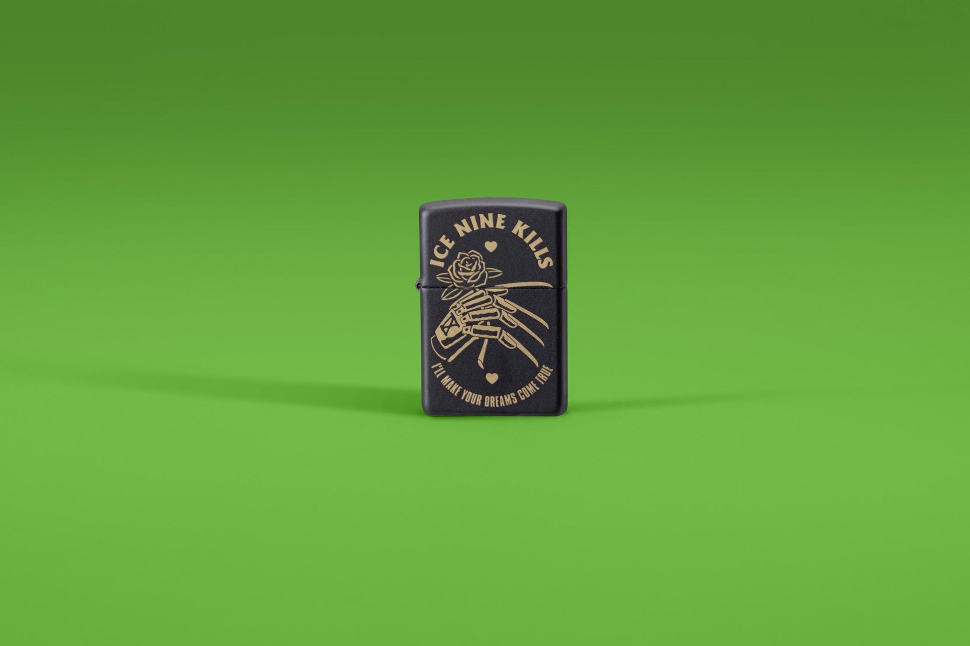 Laat met deze klassieke Black Ice®-aansteker zien dat je fan bent van de Amerikaanse heavy metalband Ice Nine Kills. Als eerbetoon aan The American Nightmare, hun nummer uit 2018, toont het Laser Engrave-ontwerp een handschoen met klauwen die een roos vasthoudt, samen met het woordmerk van de band en de tekst: I'll Make Your Dreams Come True.
