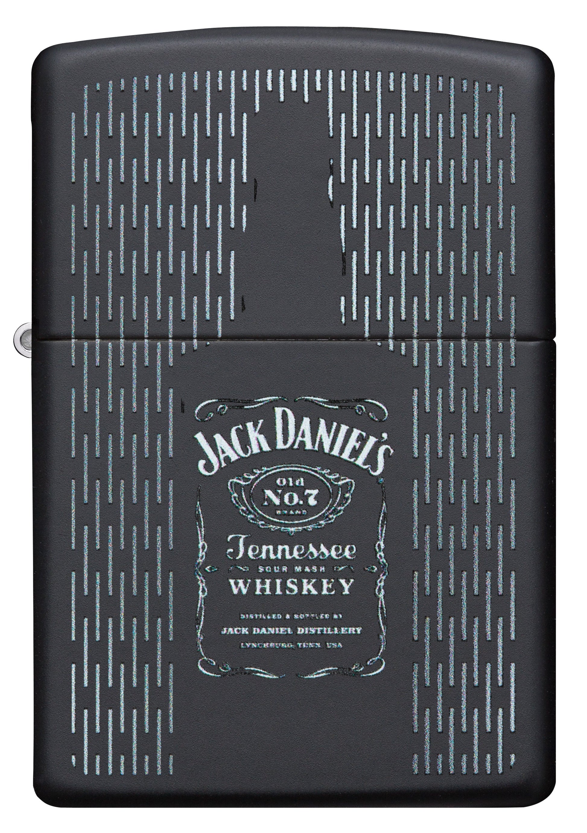 Deze klassieke Black Matte aansteker heeft een minimalistische Jack Daniels® fles in een monochroom Color Image ontwerp.