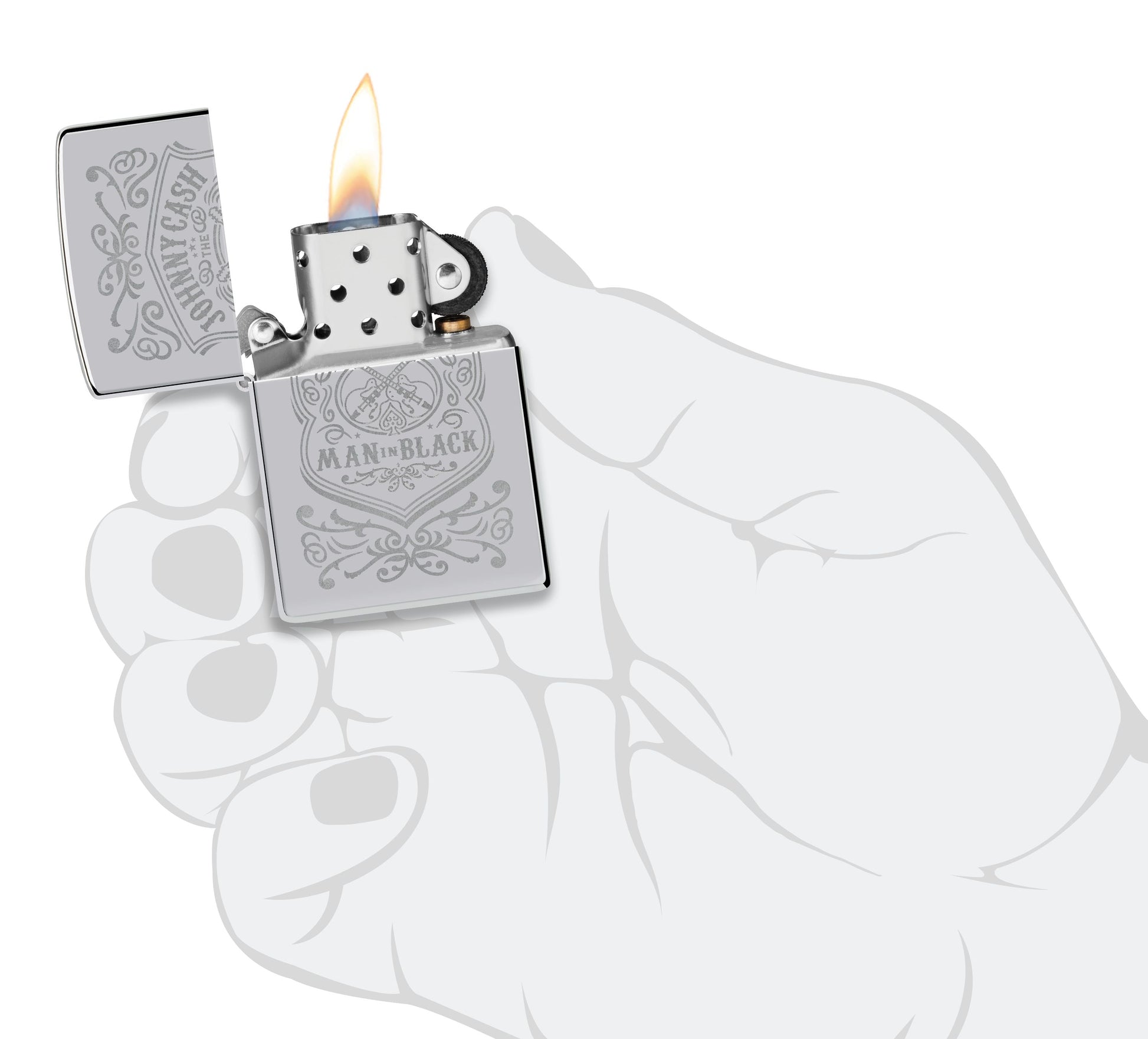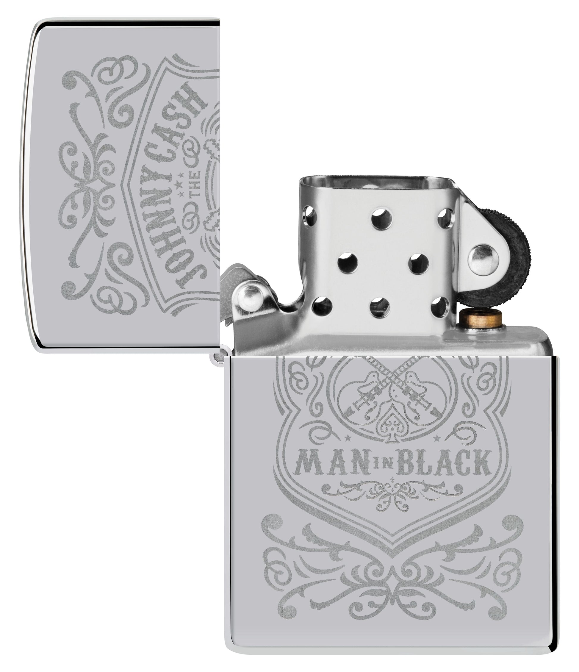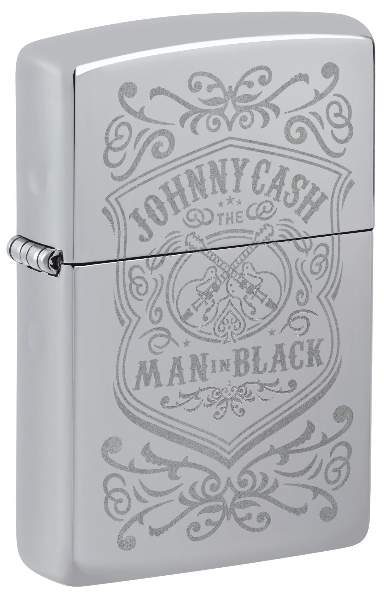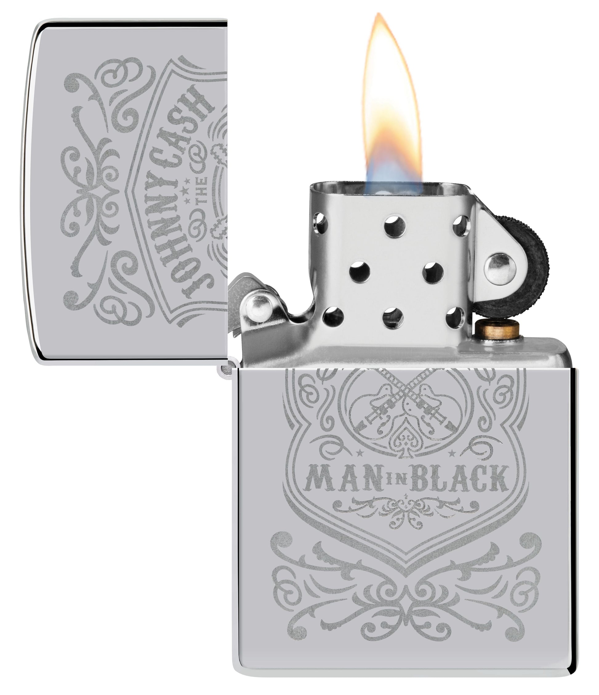 De legendarische singer-songwriter Johnny Cash wordt op handen en voeten gedragen voor zijn rol bij de revolutie van de Amerikaanse country- en rockabilly-muziek met zijn iconische stijl en kenmerkende basstem. Vier zijn historische bijdragen aan de populaire cultuur met deze tijdloze aansteker in High Polish Chrome met elegante Lustre-gravure.