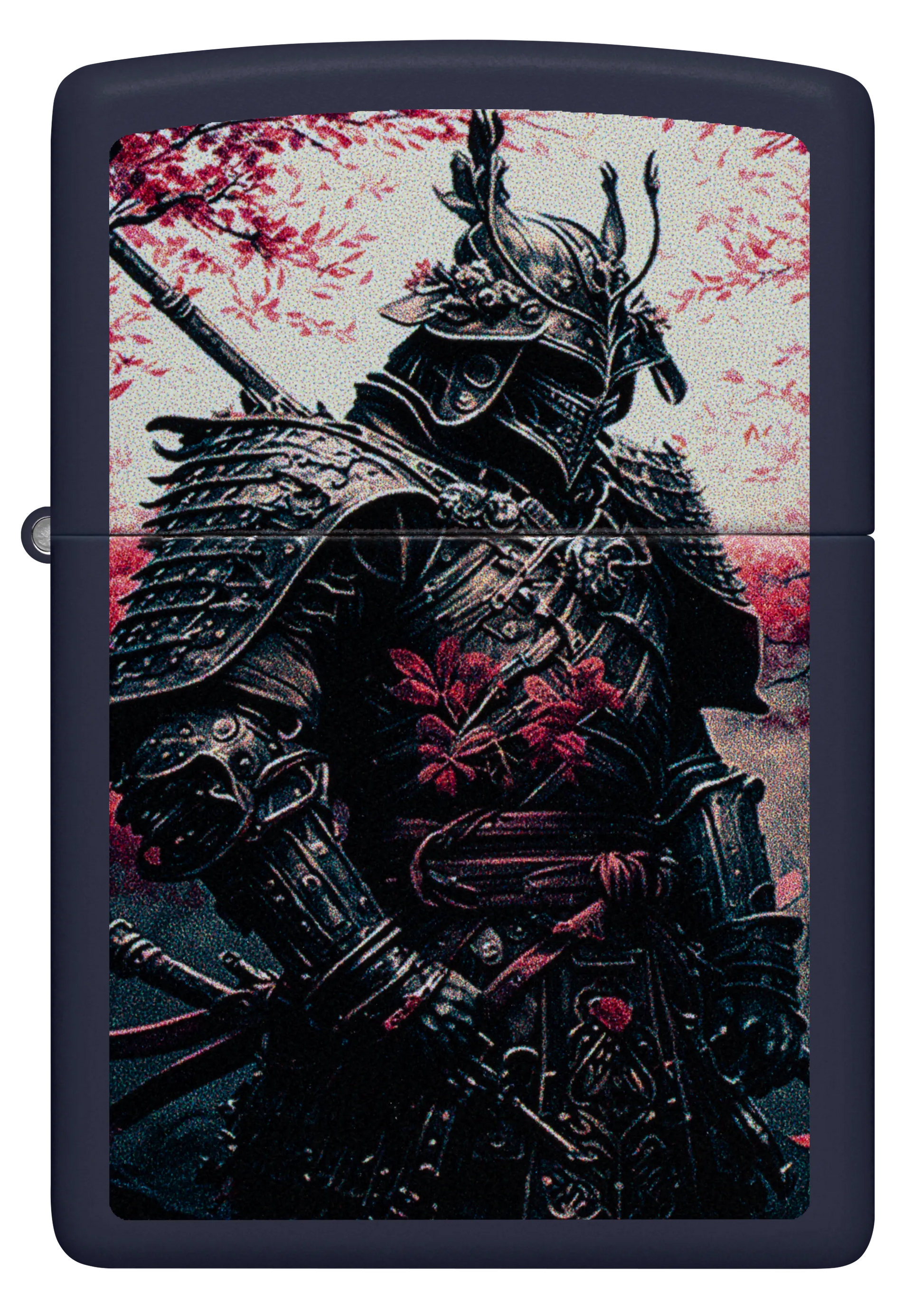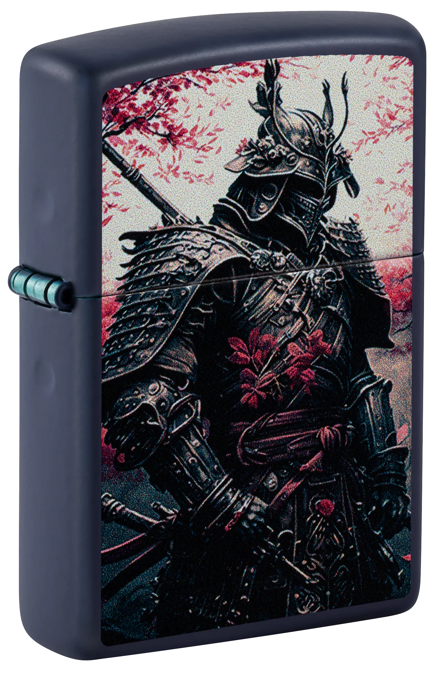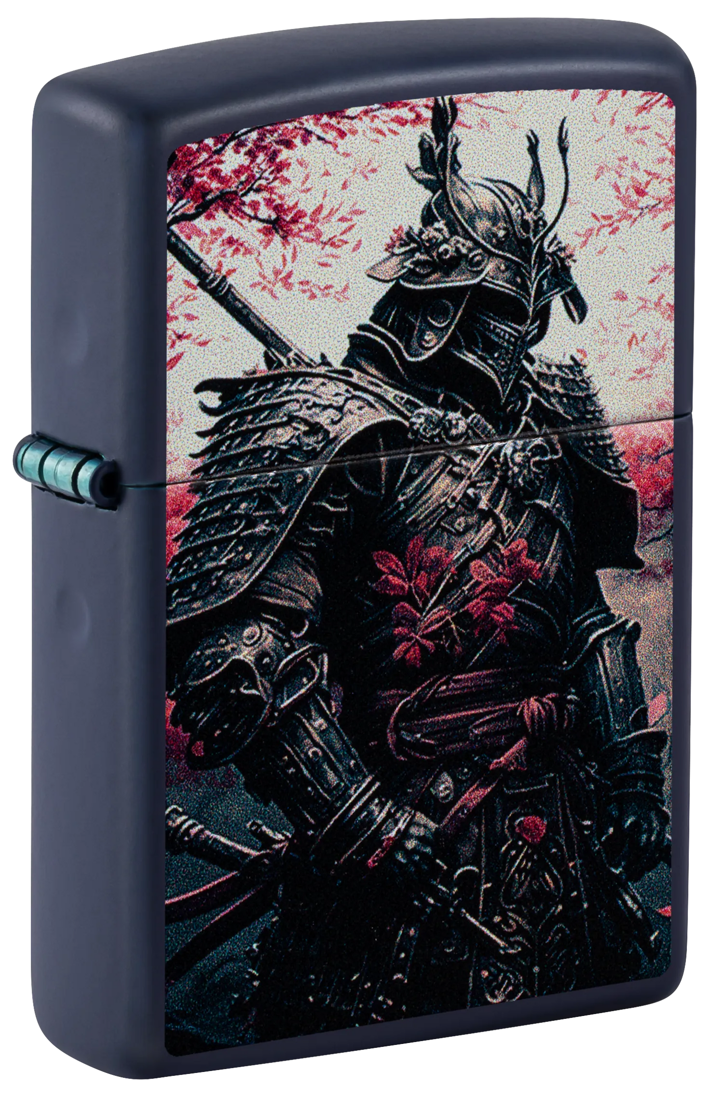 Een gewapende krijger, omringd door stralende kersenbloesems, staat op deze klassieke Navy Matte aansteker, in een dapper Color Image design.