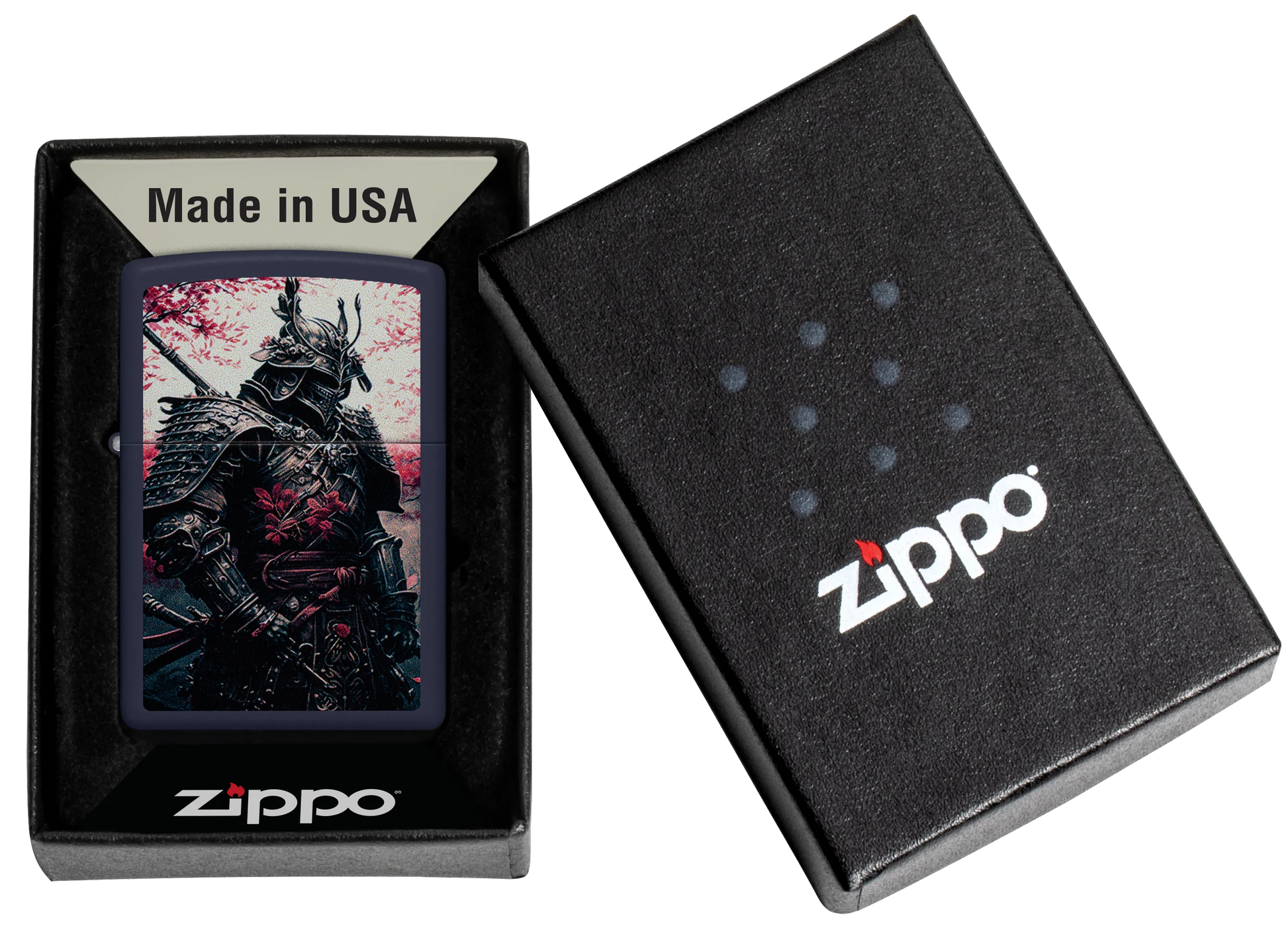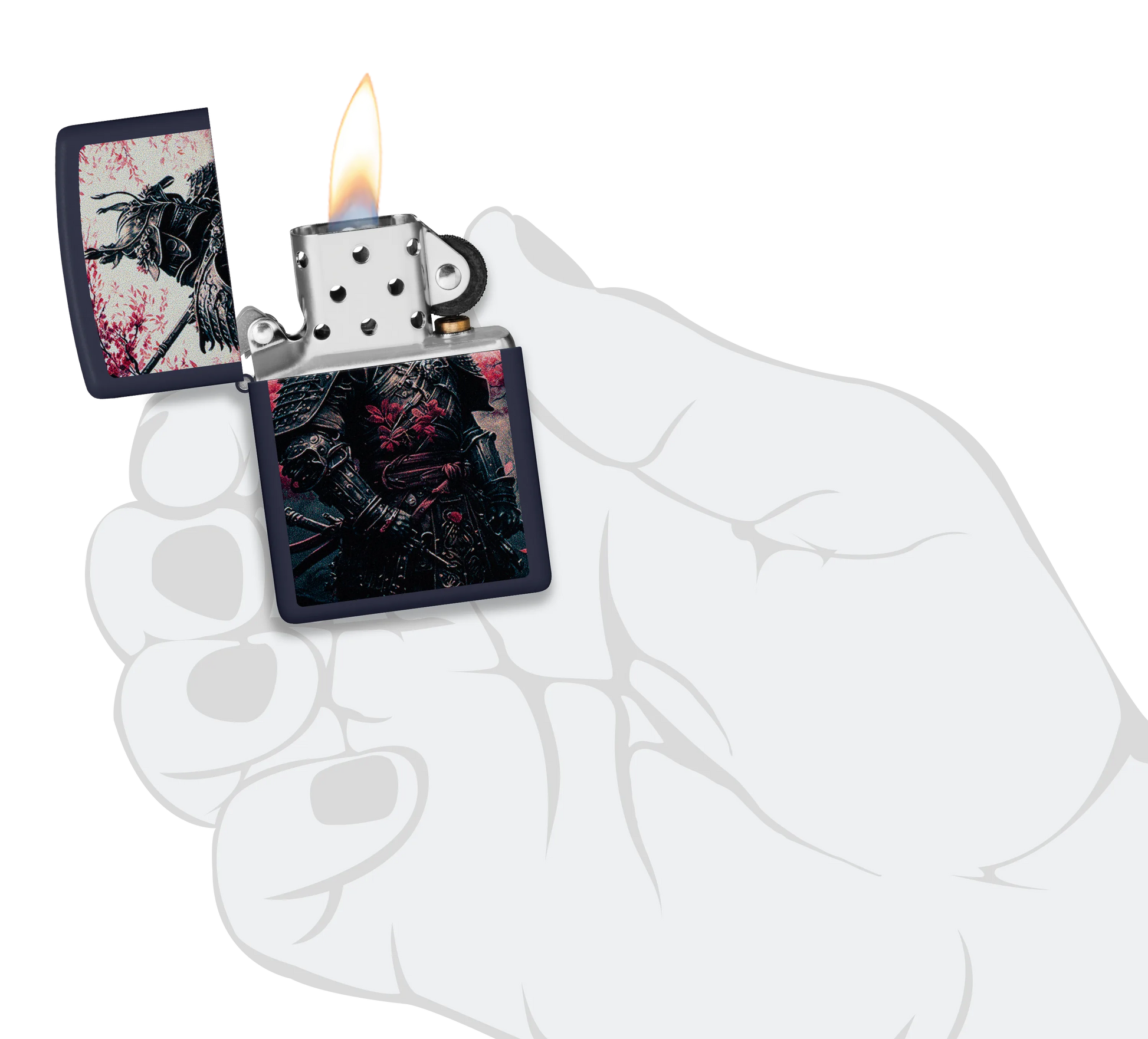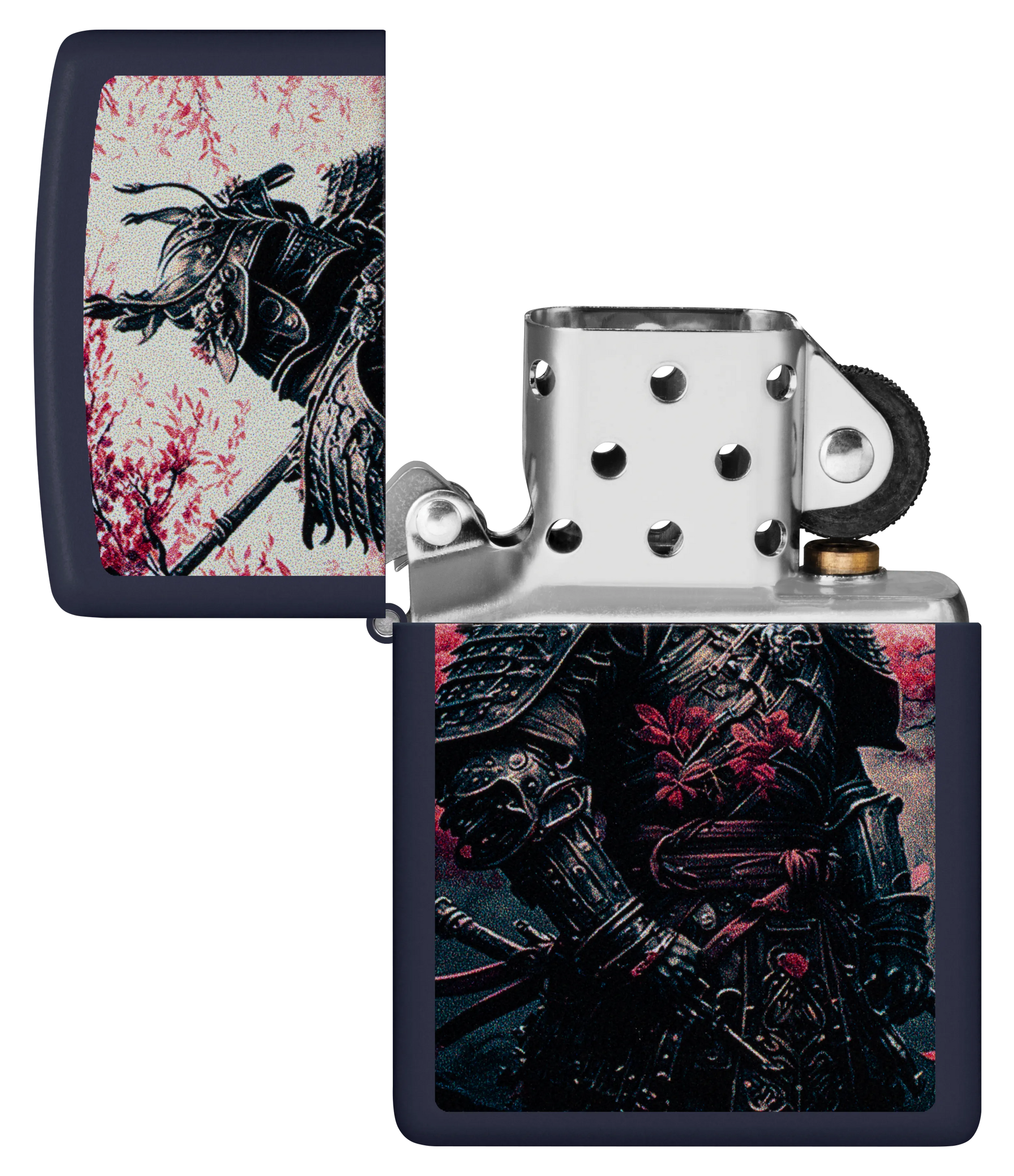 Een gewapende krijger, omringd door stralende kersenbloesems, staat op deze klassieke Navy Matte aansteker, in een dapper Color Image design.