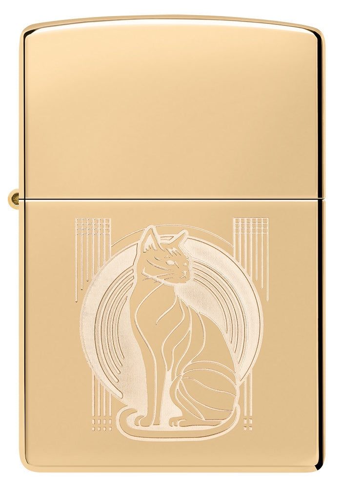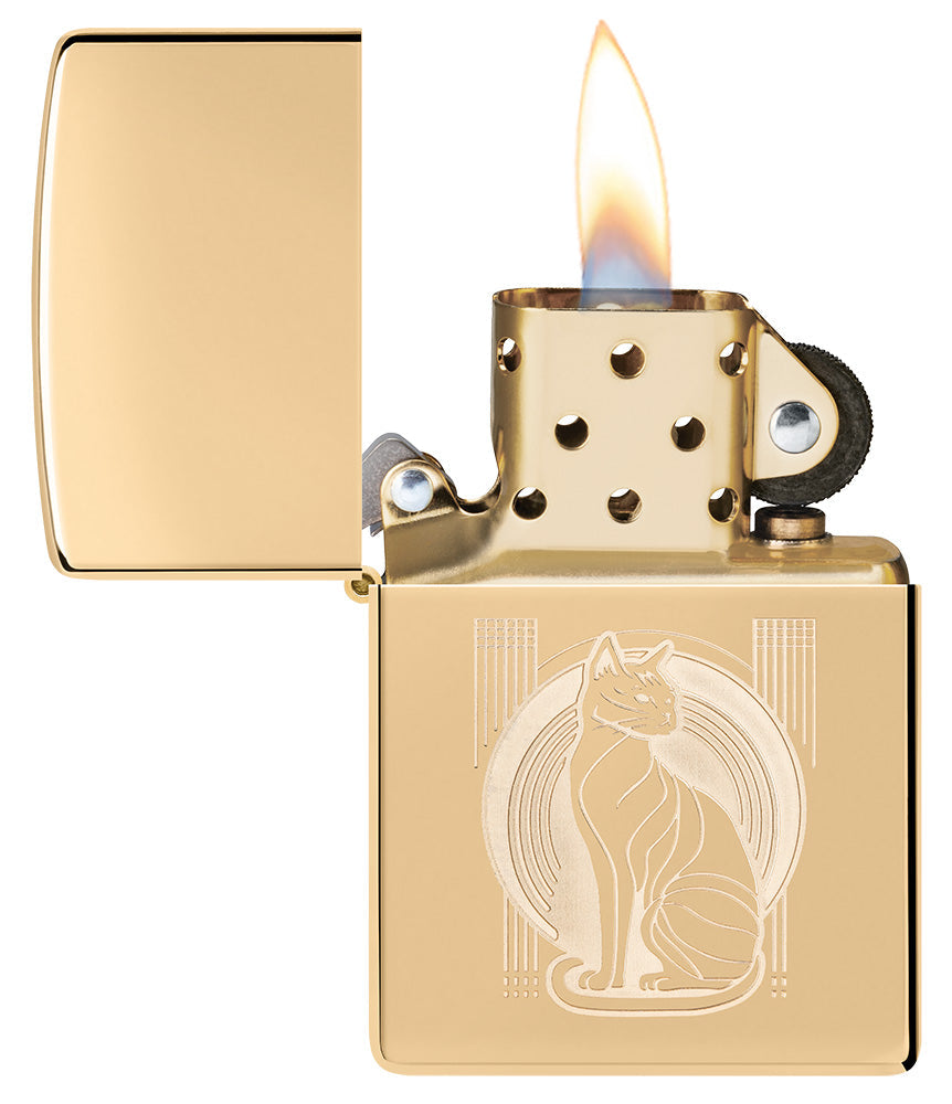 Geïnspireerd door muurschilderingen in oude paleizen en citadellen, poseert een majestueuze kat tussen twee zuilen op deze klassieke High Polish Brass aansteker in een fijnmazig Double Lustre design.
