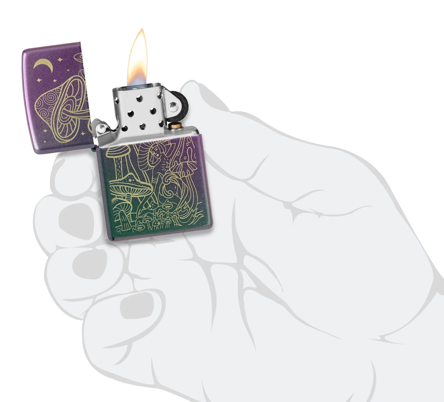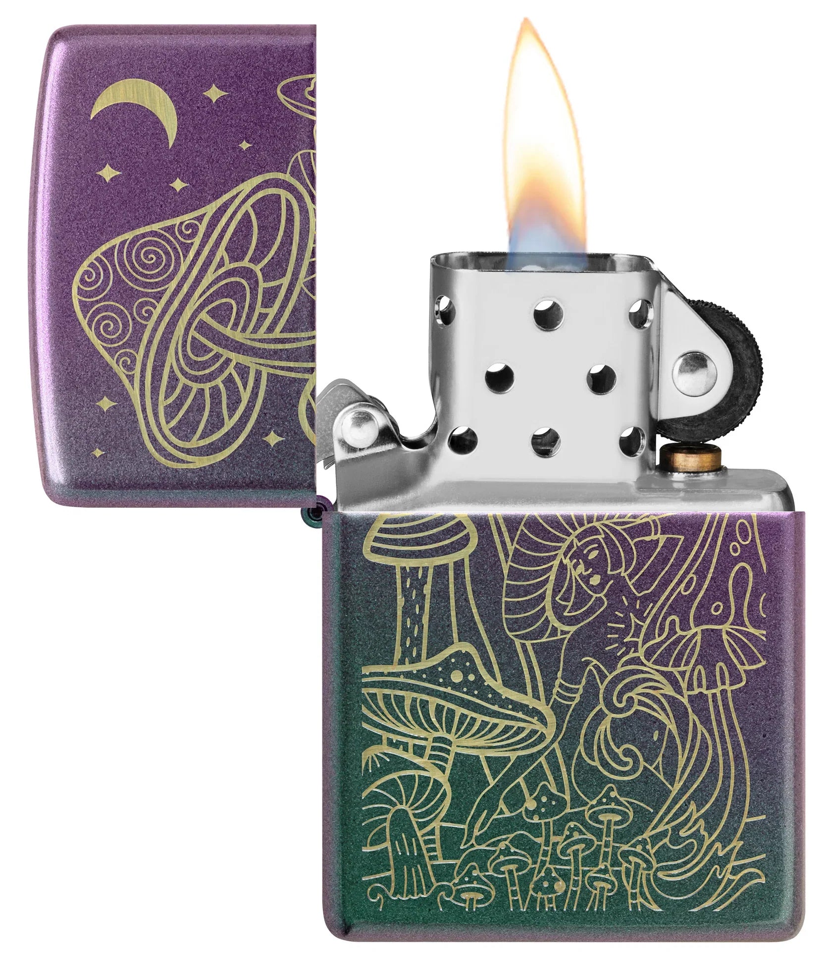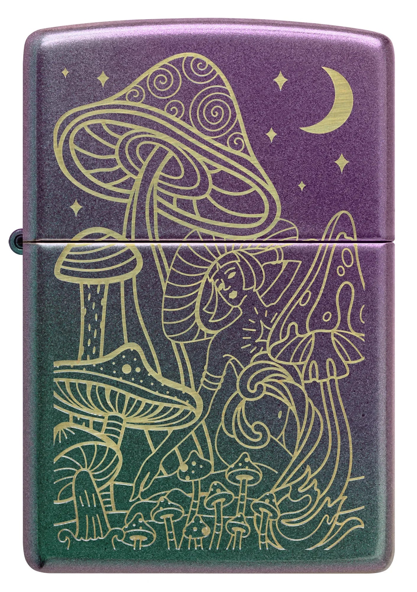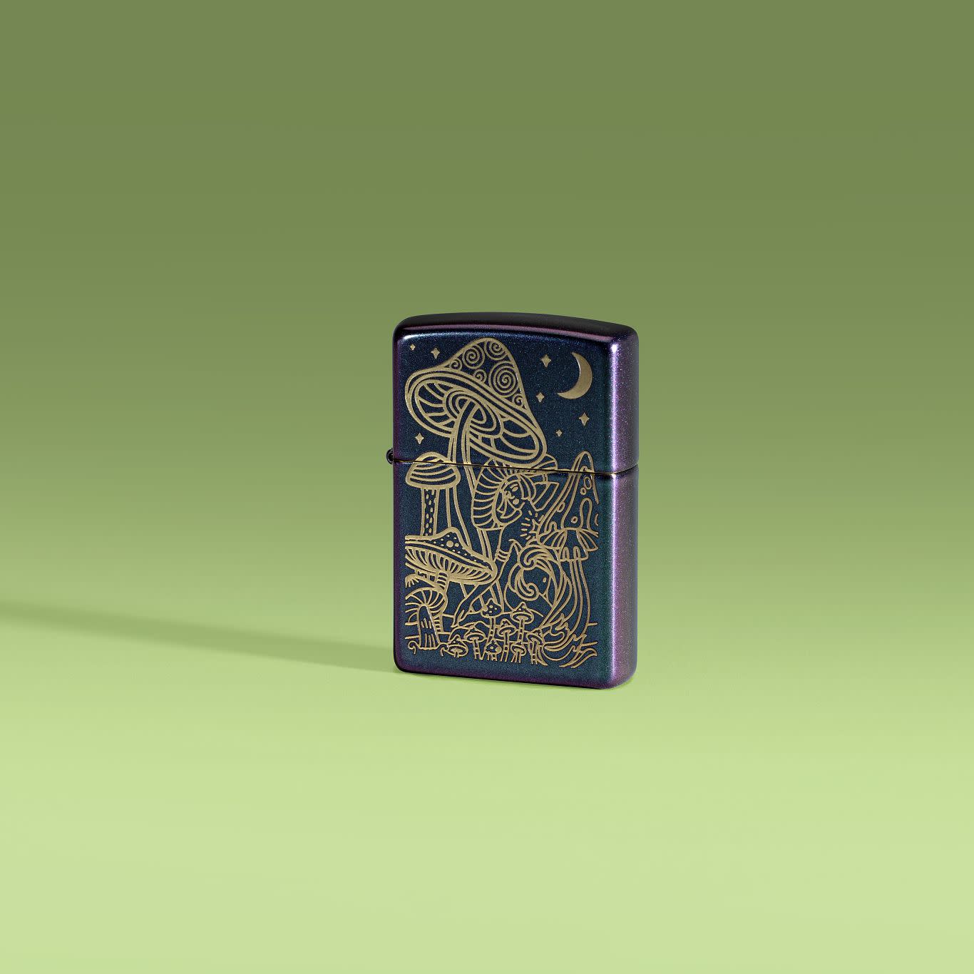 Paddenstoelen zwaaien onder een glinsterende halve maan op deze klassieke iriserende aansteker met uitgebreide lasergravure;
