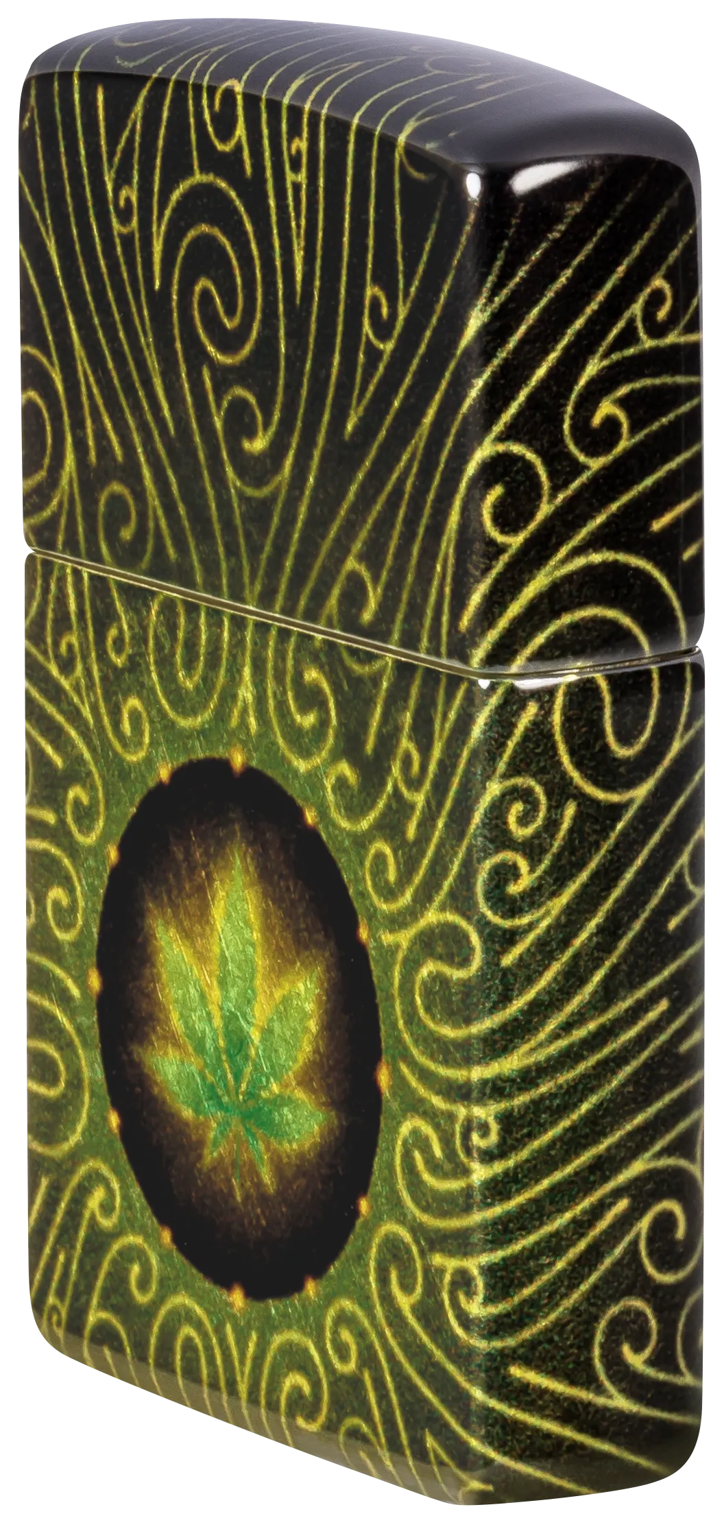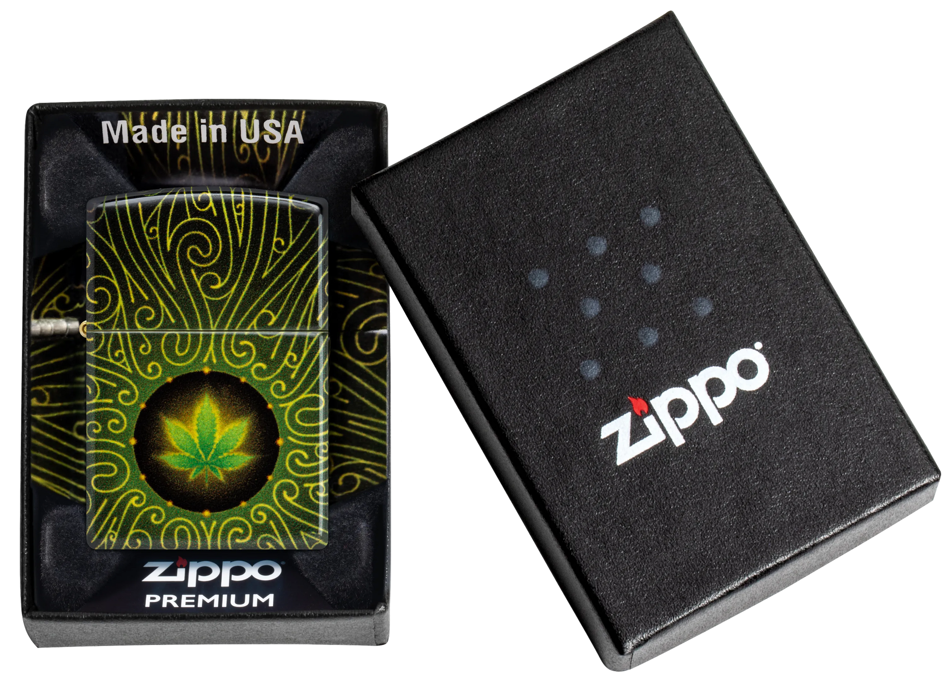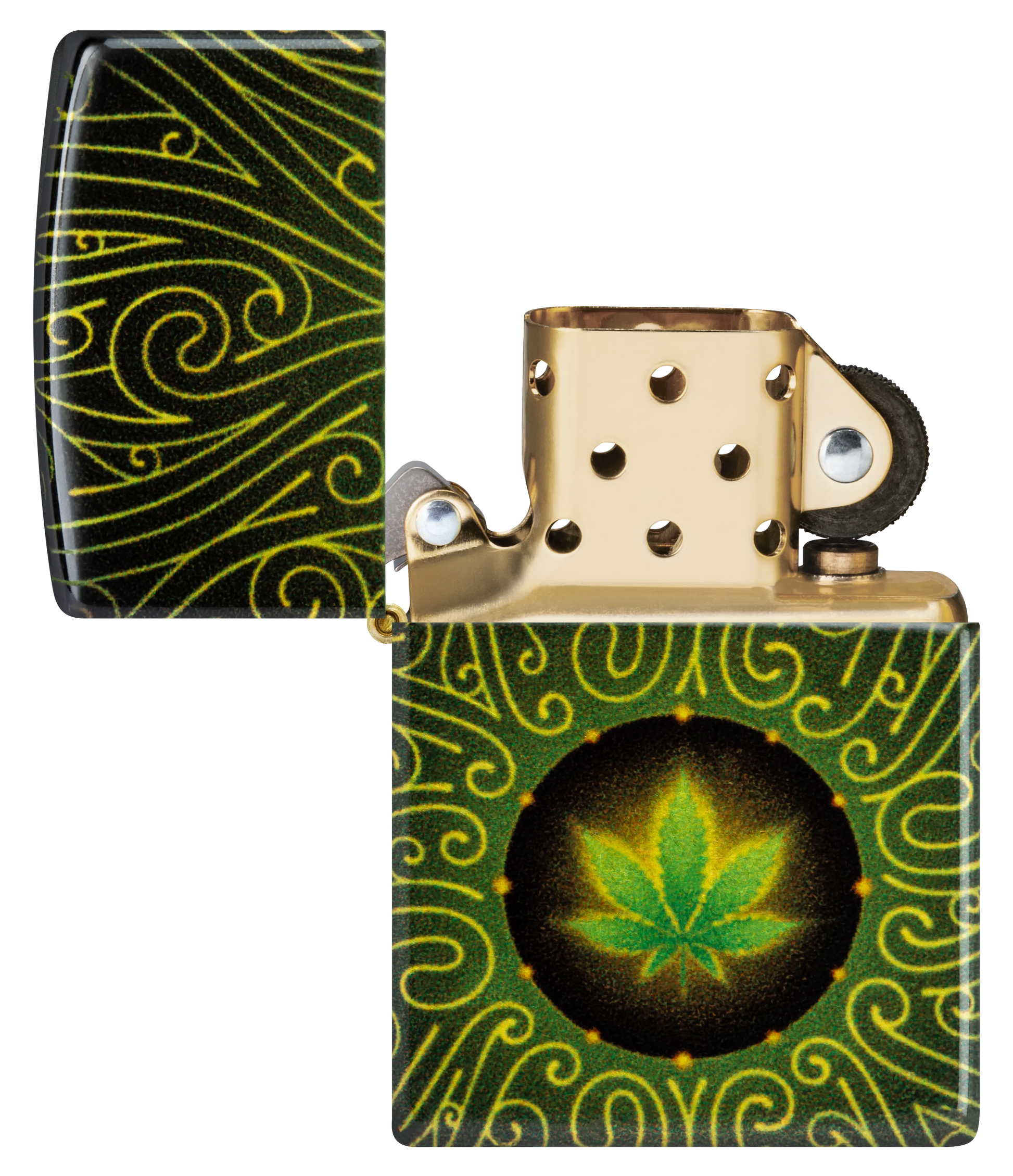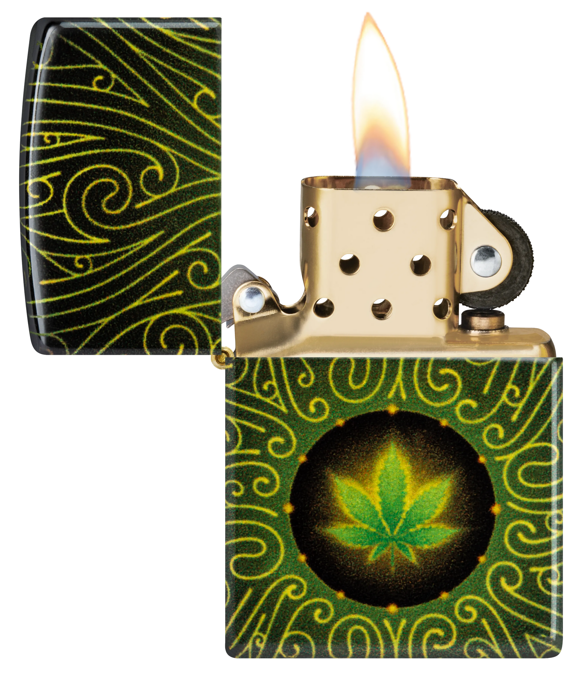 Een doolhof van kronkelende lijnen komt samen op een glanzend wietblad op deze klassieke Tumbled Brass aansteker. Het 540 Fusion design omringt de aansteker aan alle kanten, waarachter de glanzende messingtinten van de aanstekerhouder subtiel glanzen.