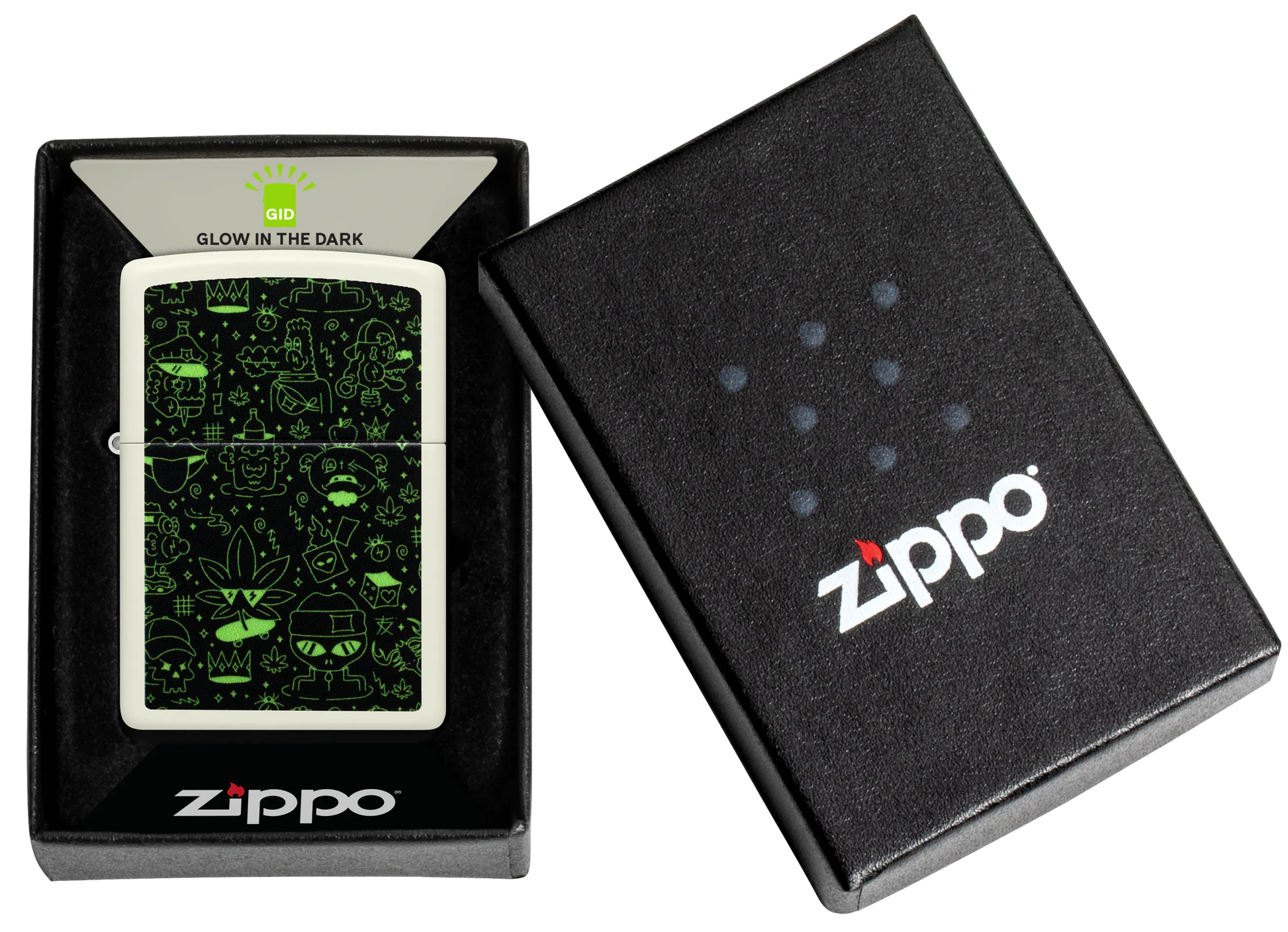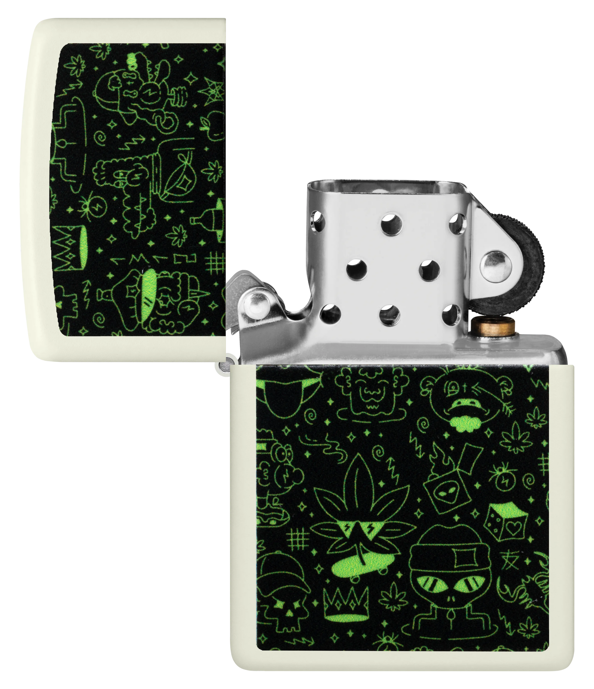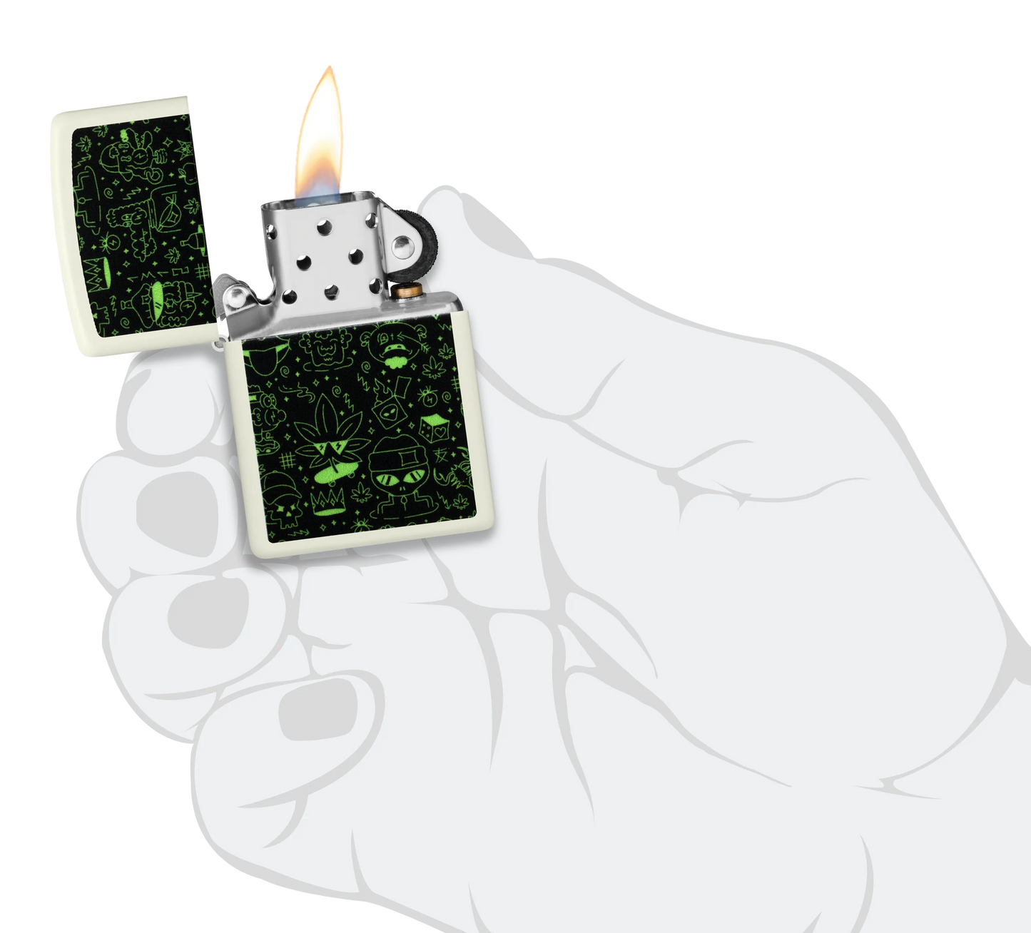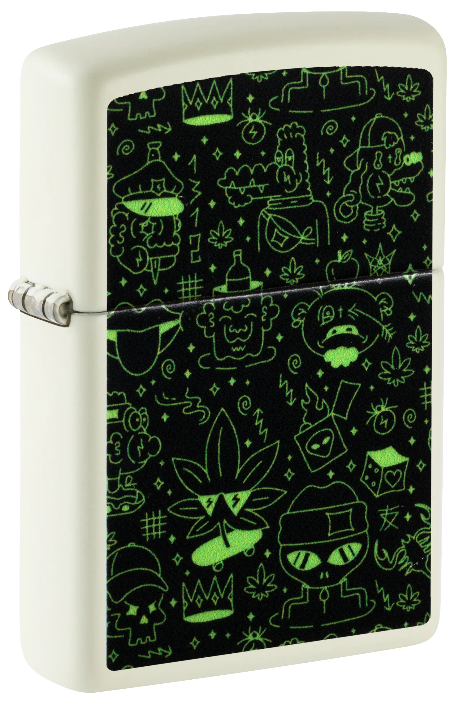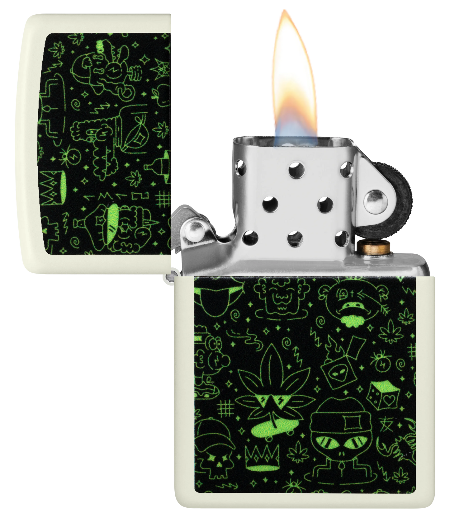 Duik in de speelse afbeeldingen op deze klassieke Glow-in-the-Dark aansteker. Schedels, aanstekers, marsmannetjes, wietbladeren en meer staan afgebeeld op dit speelse Color Image design, dat voor dat beetje extra is behandeld met onze Glow-in-the-Dark-afwerking.