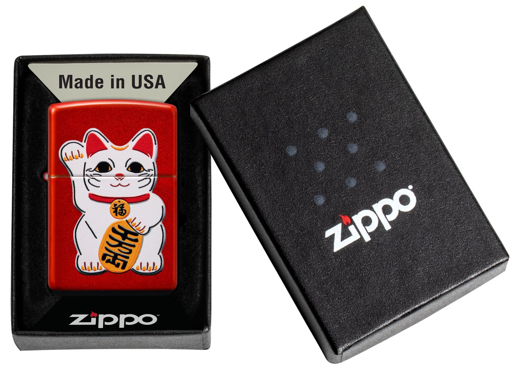 De maneki-neko, of 'wenkende kat', is een traditioneel Japans symbool waarvan wordt aangenomen dat het geluk en voorspoed brengt in het huishouden van de eigenaar. Deze klassieke Metallic Red aansteker toont het iconische symbool in een vrolijk Color Image-ontwerp.