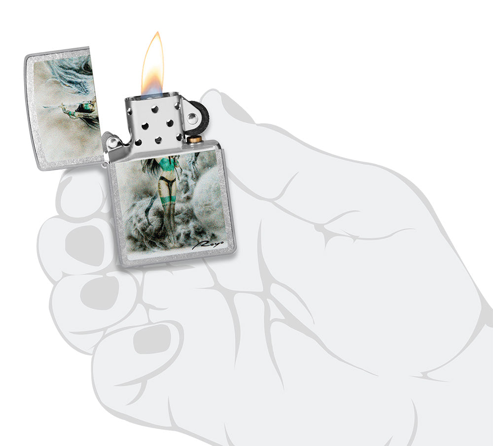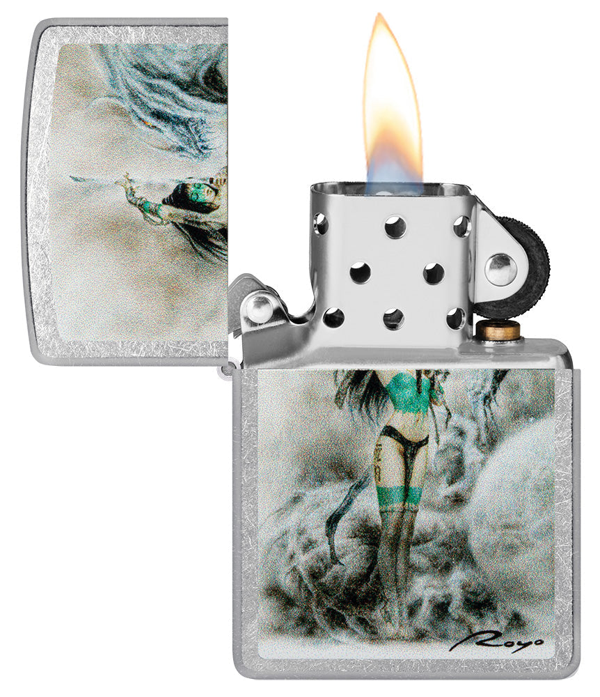 De iconische, dromerige kunst van Luis Royo is afgebeeld op deze klassieke Street Chrome aansteker. Een stoïcijnse krijger, afgebeeld in zijn iconische stijl en met prachtig details weergegeven met ons Color Image-proces, staat resoluut tegenover een woeste draak.