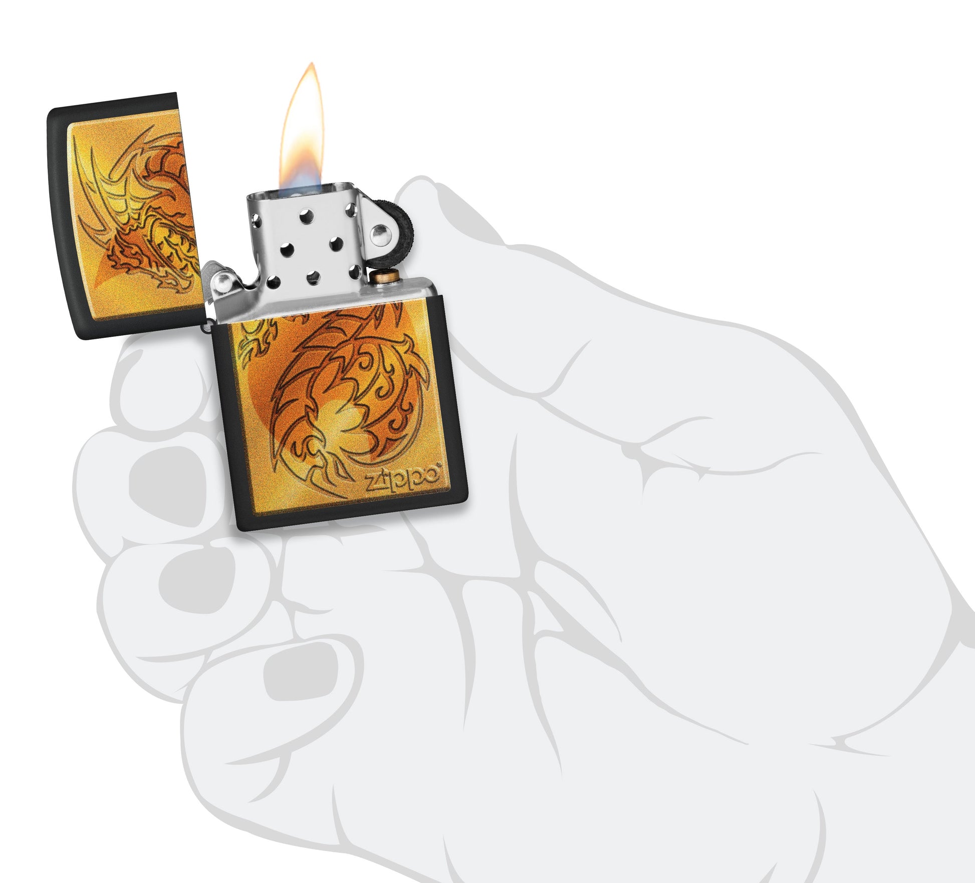 Een draak in middeleeuwse stijl wervelt rond het klassieke vlamicoon van Zippo in dit rijke Color Image-ontwerp, dat perfect tot zijn recht komt op een gestroomlijnde zwarte matte achtergrond.
