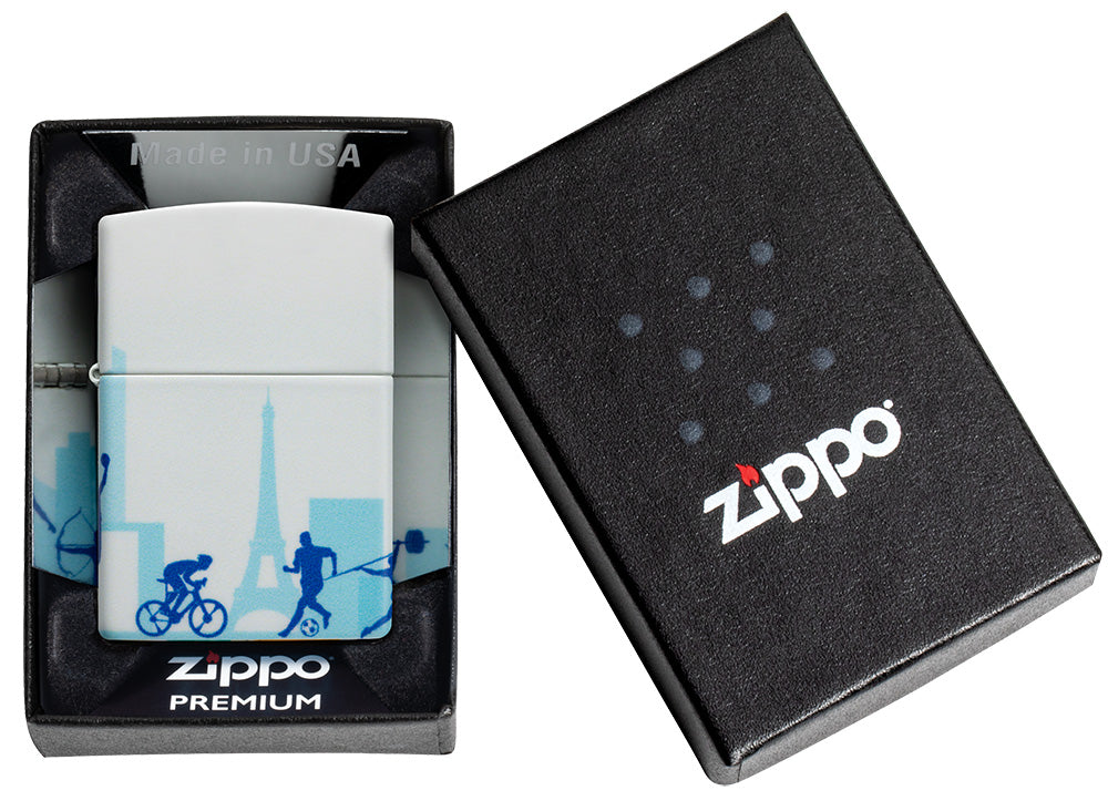 Van fietsen tot gewichtheffen en van boogschieten tot speerwerpen: al je favoriete zomerspelen zijn schitterend vastgelegd op deze verbluffende 540 Color aansteker. Deelnemers verschijnen in silhouet boven een Parijse skyline aan elke kant van de opwindende aansteker.