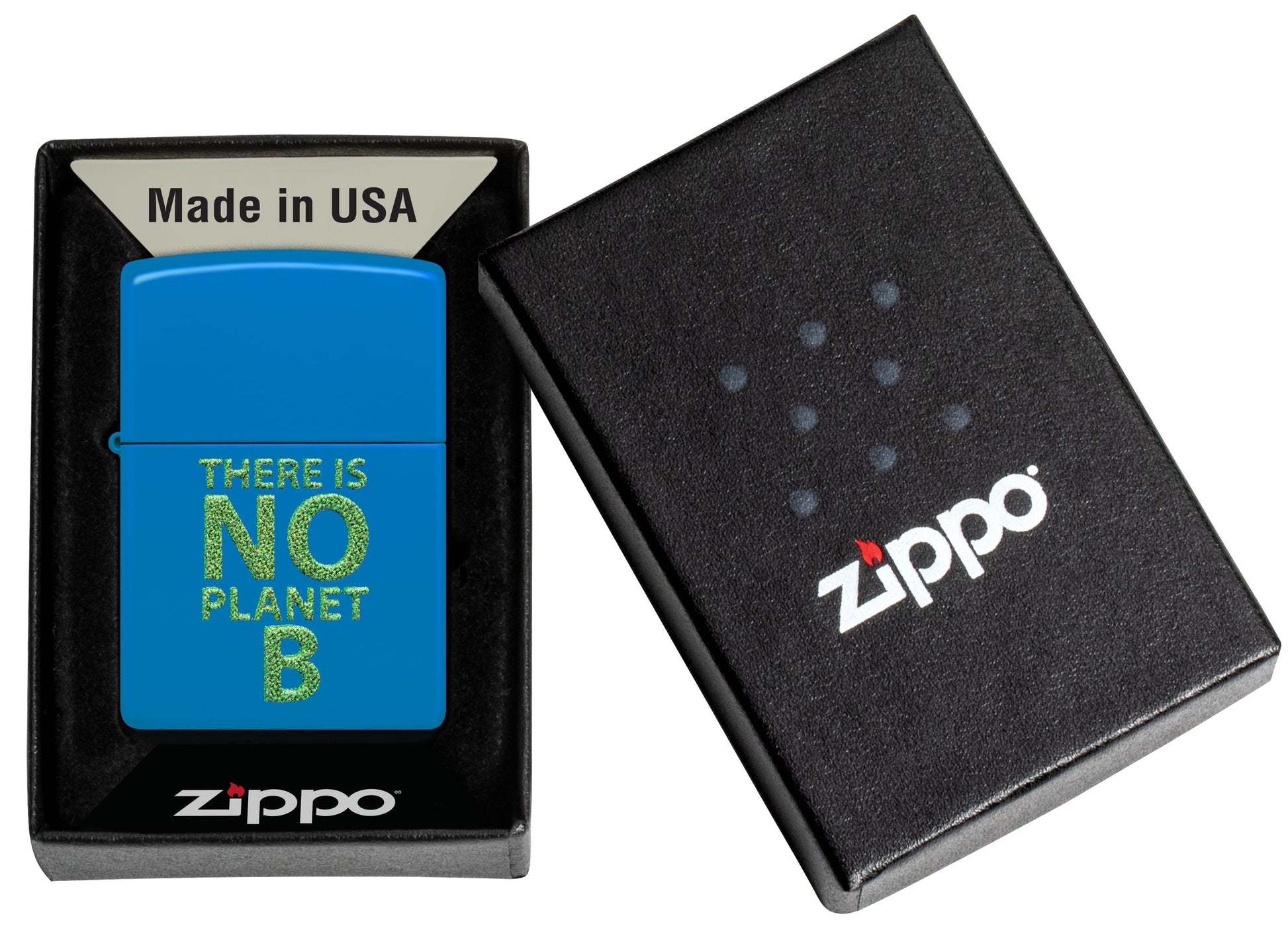 Deze Sky Blue Matte aansteker herinnert ons eraan dat we onze enige planeet Aarde moeten beschermen. De tekst in het Texture Print ontwerp is "There is no planet B" in driedimensionale tekst.