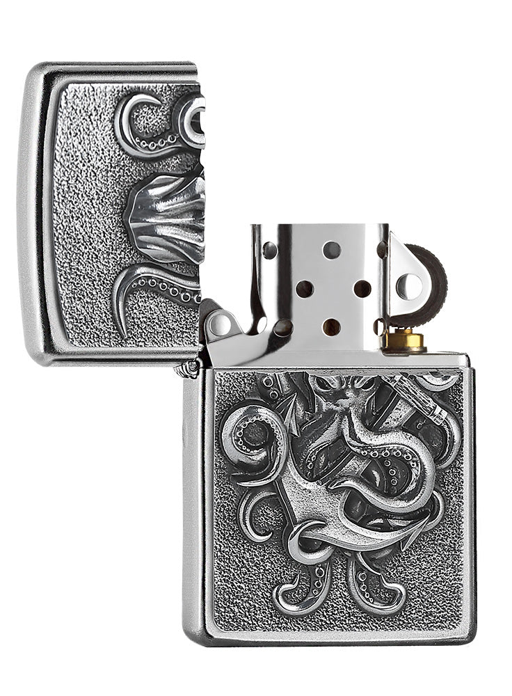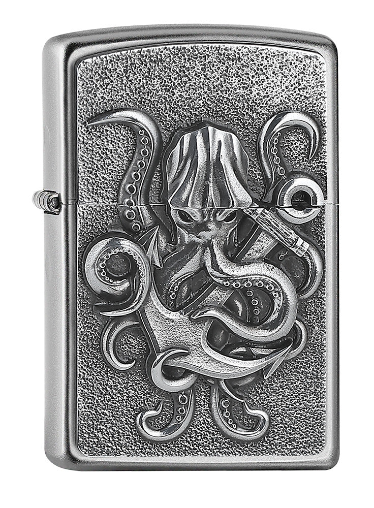 Deze klassieke Satin Chrome aansteker toont een gedetailleerde octopus met wild zwaaiende tentakels op een verfijnd metalen embleem.