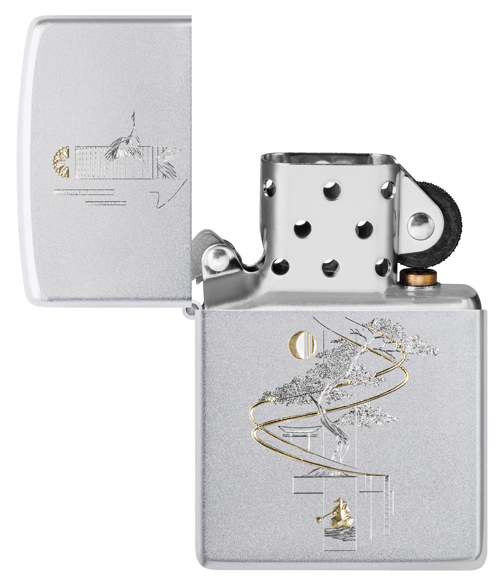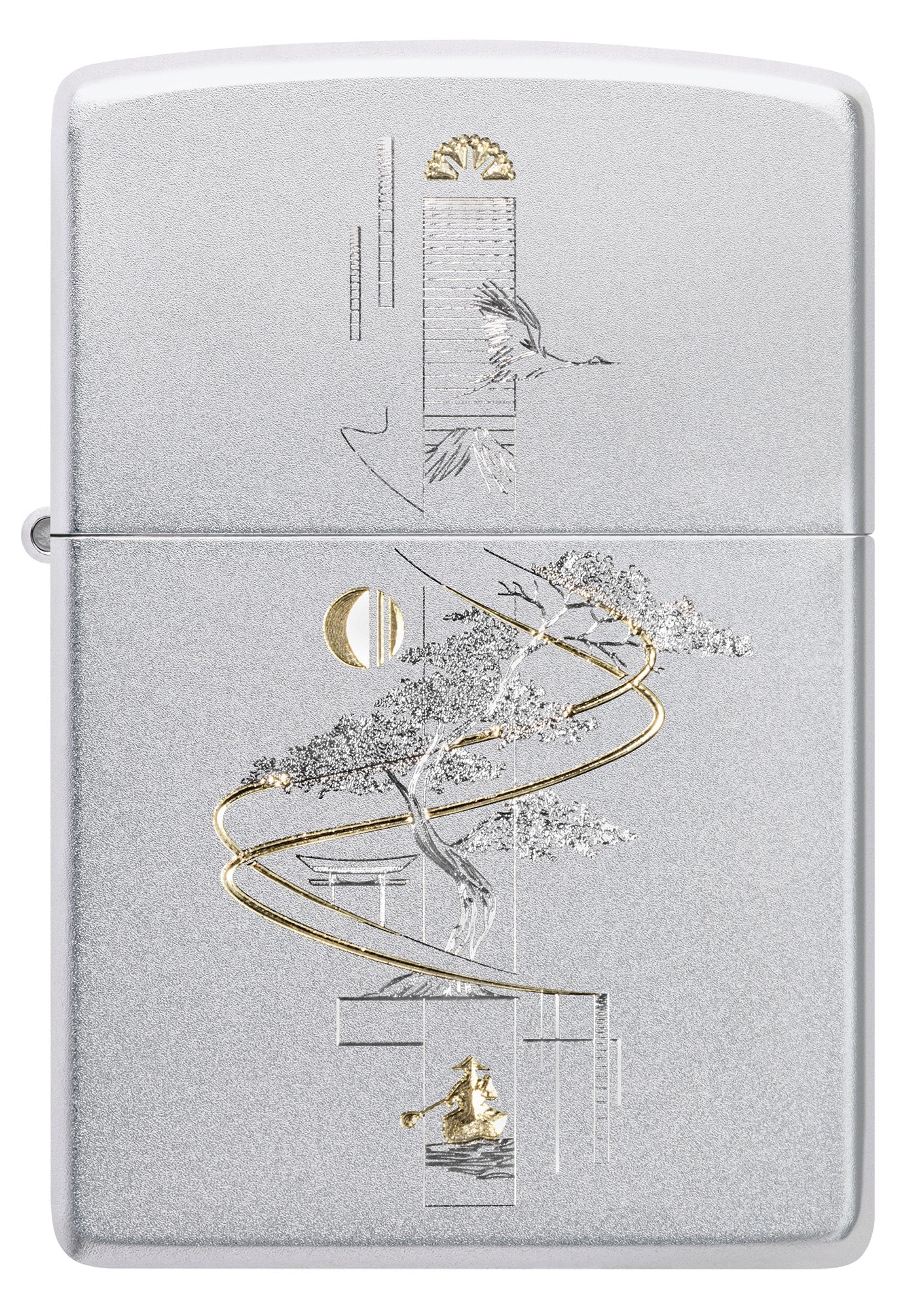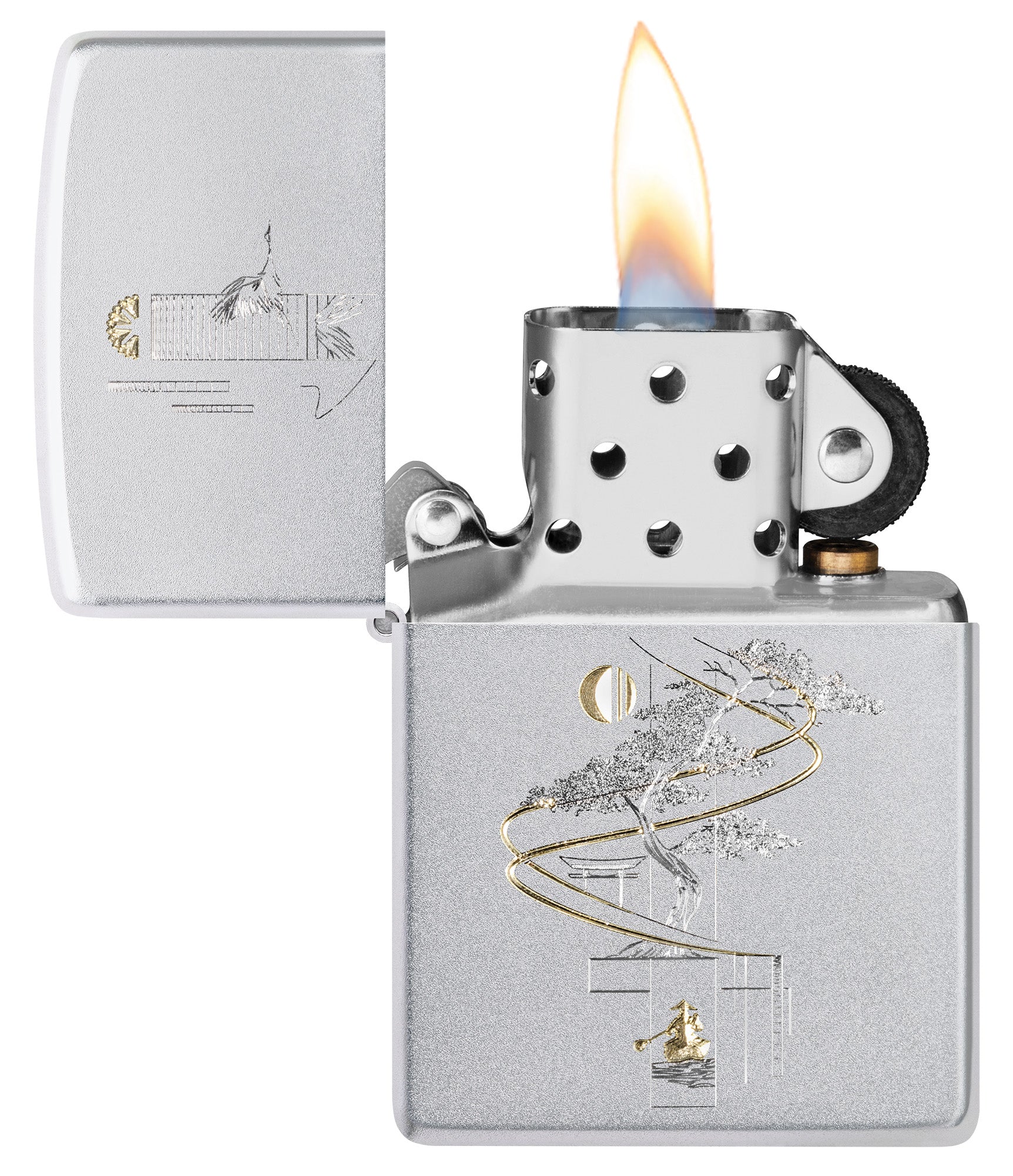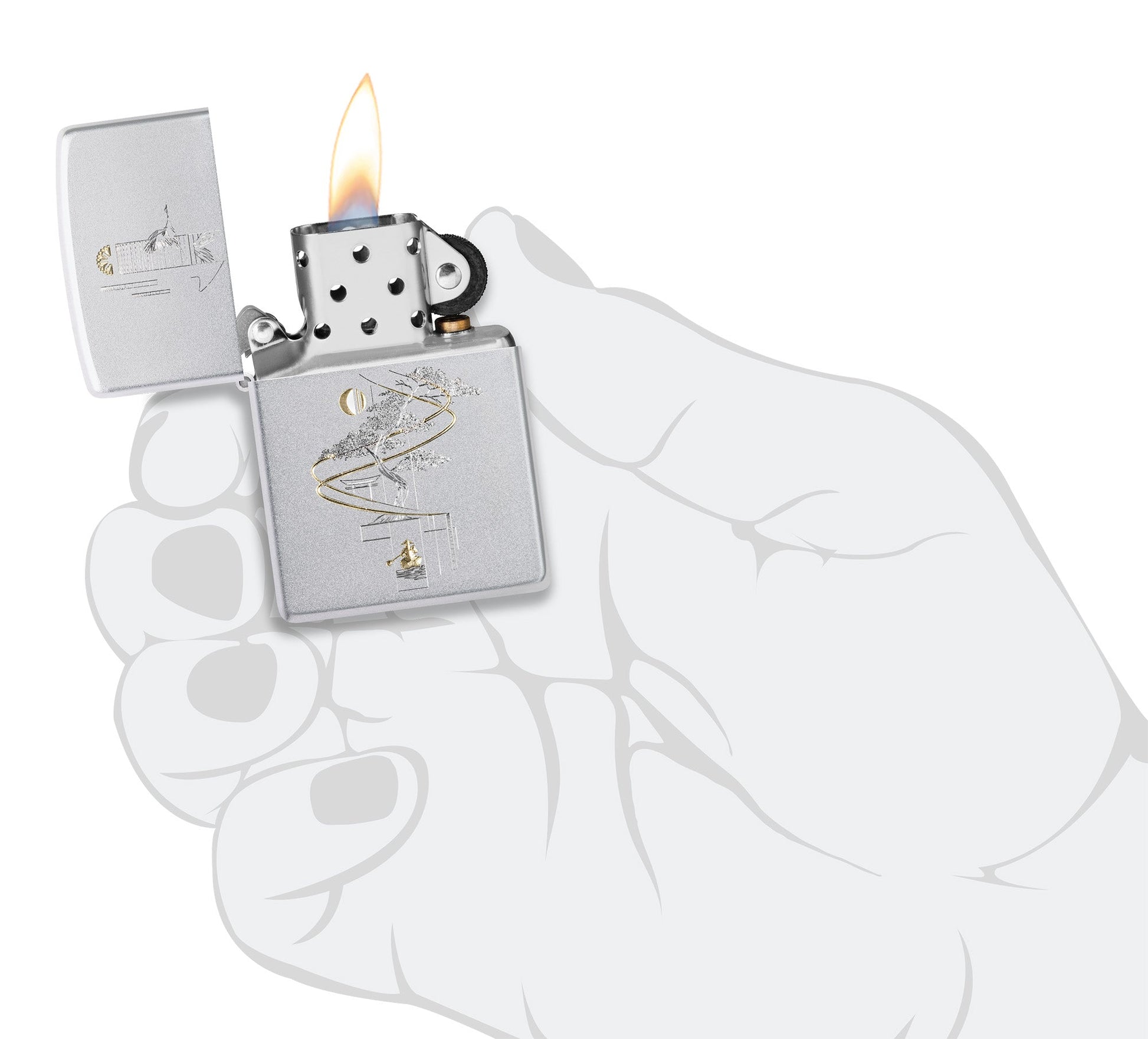 Als symbool van de harmonie tussen kunst en natuur staat op deze klassieke aansteker van gesatineerd chroom in een rustgevend ambiance een delicaat bonsai-boompje afgebeeld.