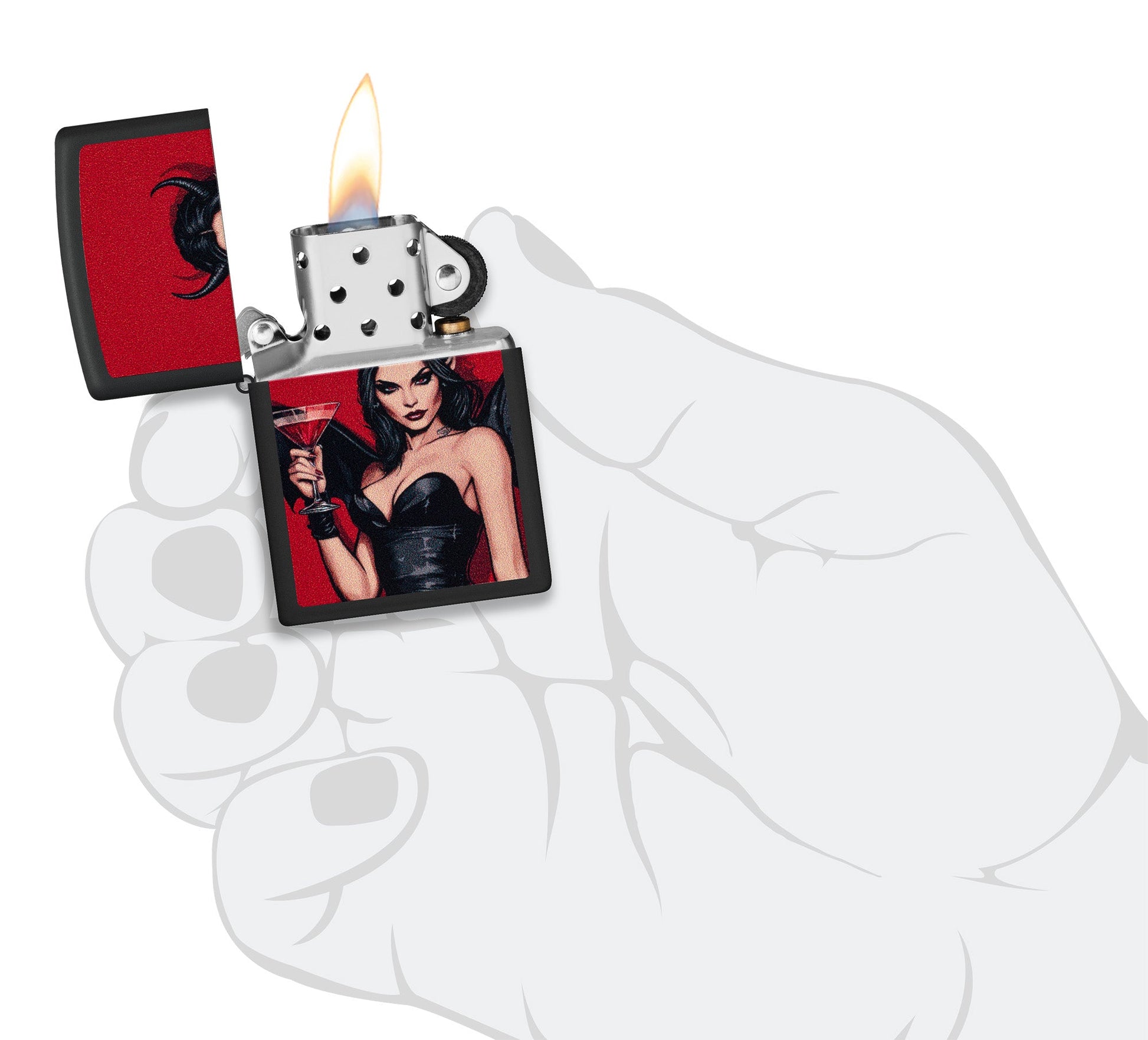 Een demonische vampier poseert met een martini in de hand op het oppervlak van deze klassieke, mat-zwarte aansteker.